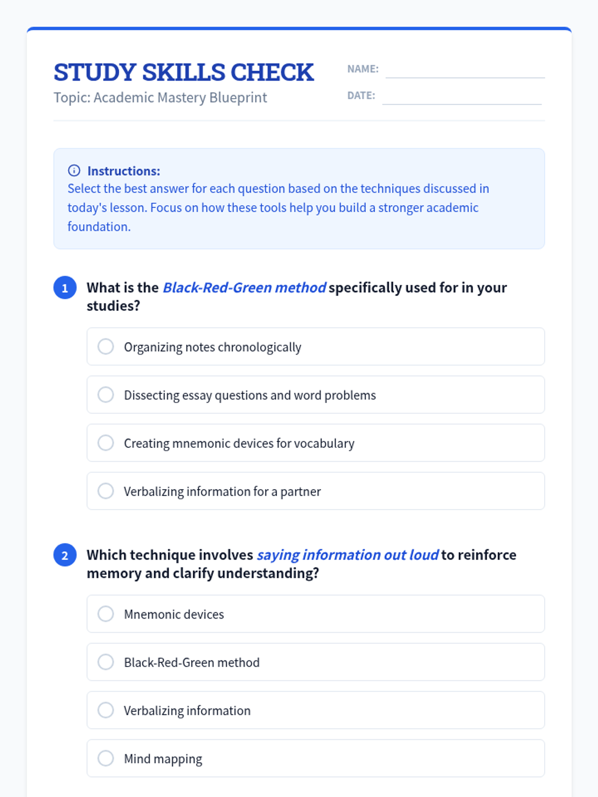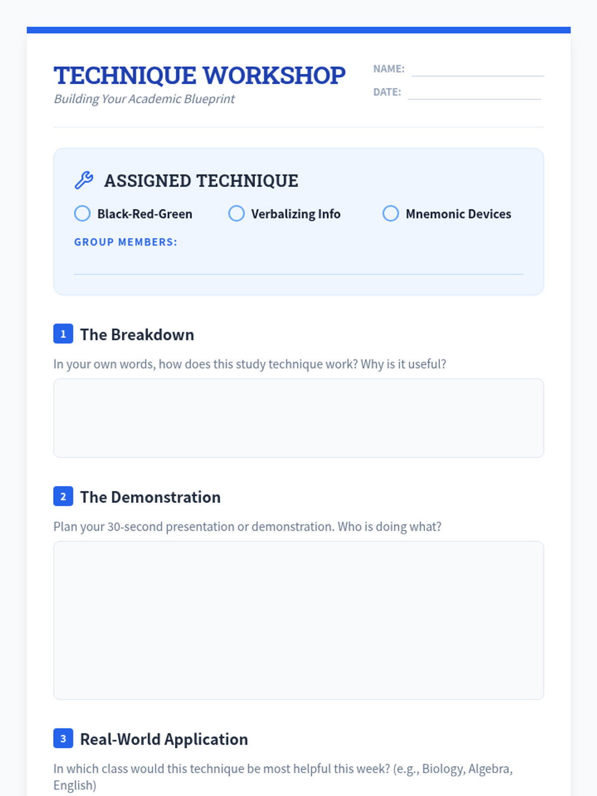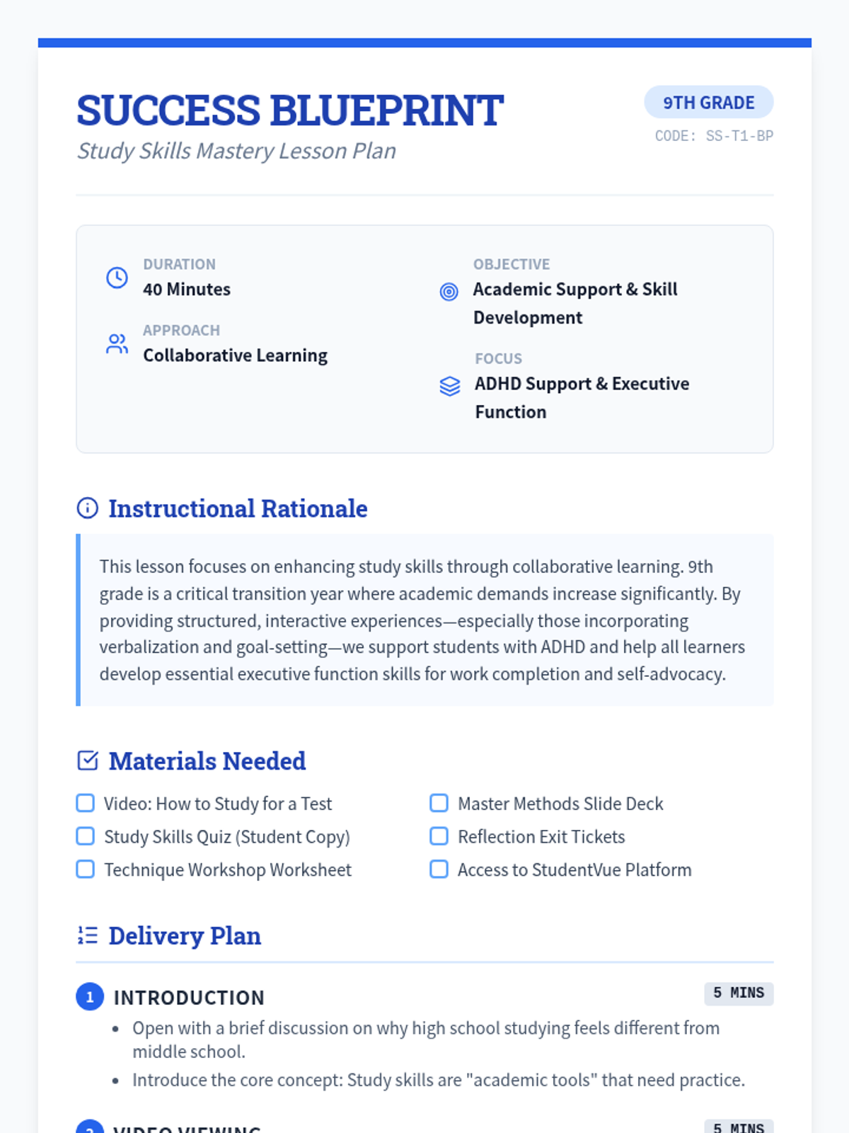 This lesson focuses on enhancing study skills for 9th graders through collaborative learning, featuring video-based instruction, group demonstrations, and reflective assessments. It specifically incorporates ADHD-friendly strategies like verbalization and structured time management to support academic success.