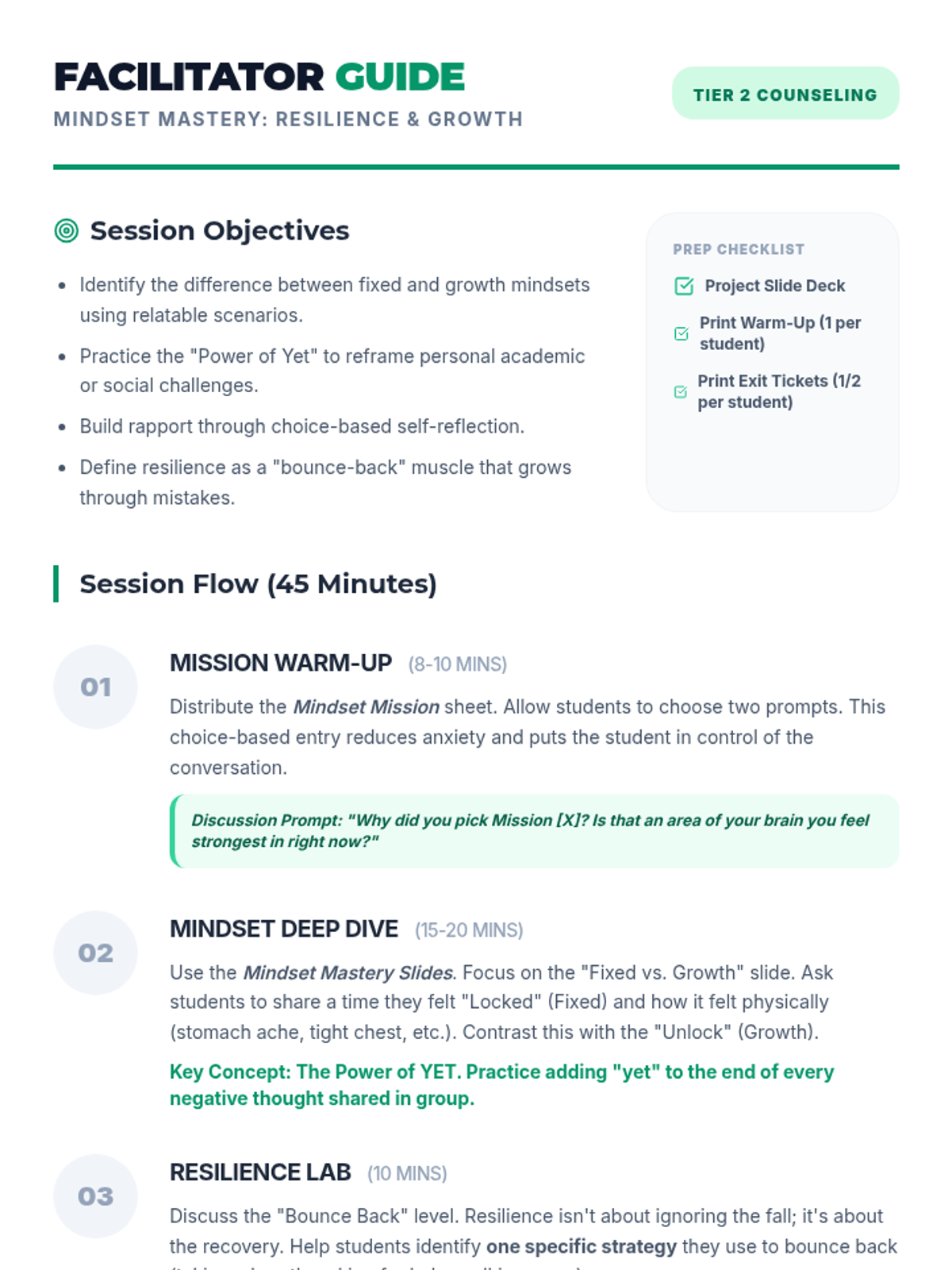 A counseling unit designed for Tier 2 middle school groups or one-on-one sessions, focusing on developing a growth mindset and building resilience through interactive missions and reflection.