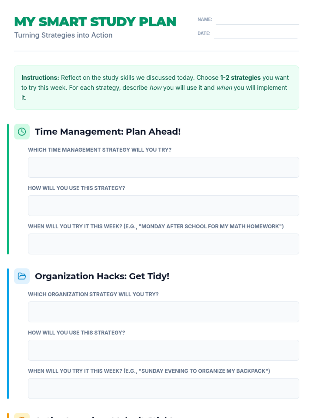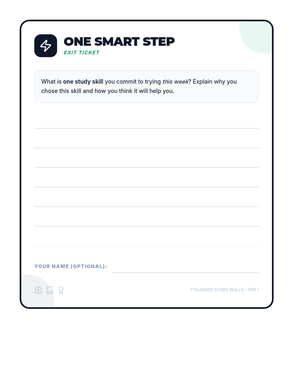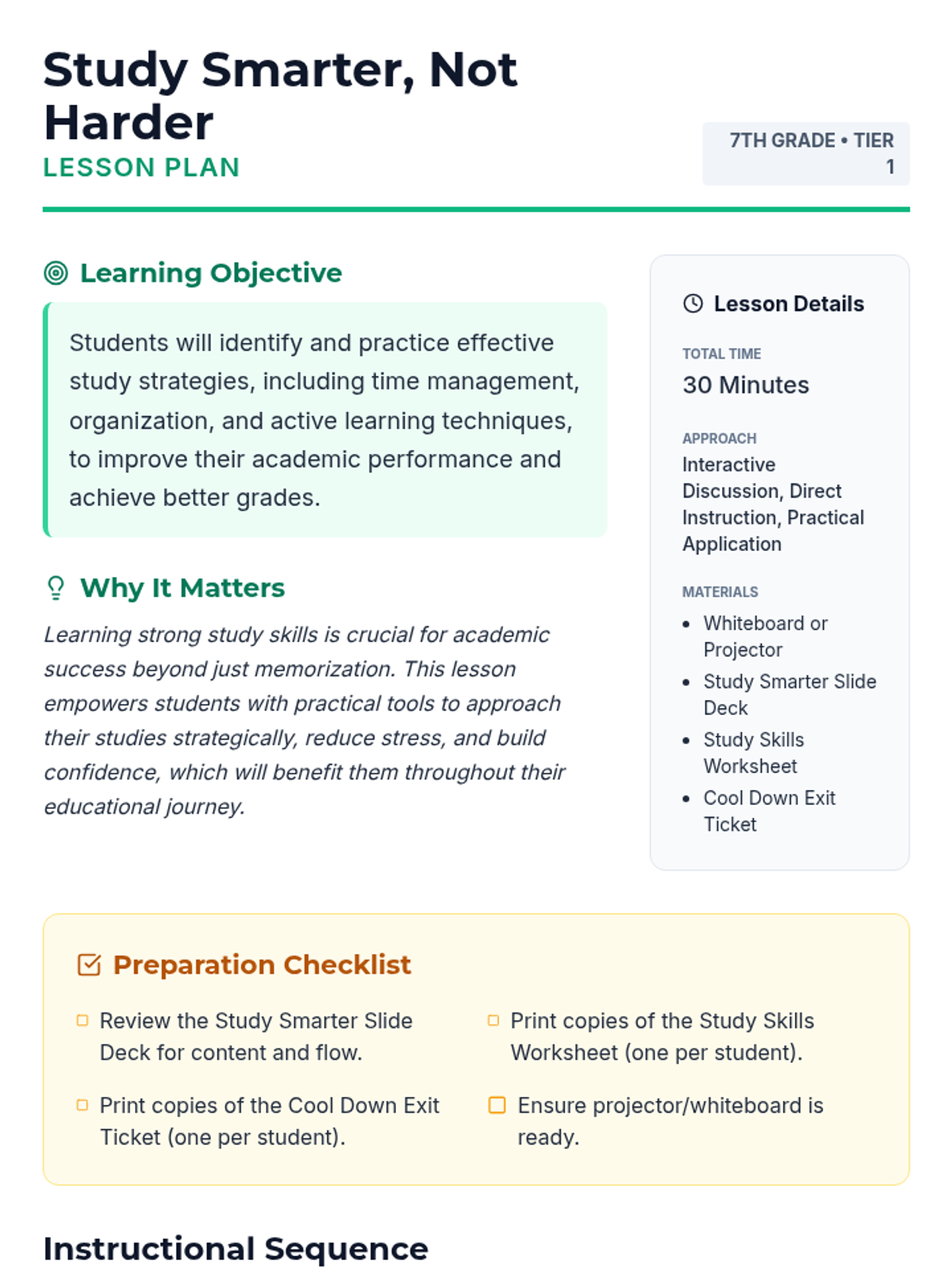 This 30-minute Tier 1 lesson introduces 7th-grade students to practical study skills, focusing on time management, organization, and active learning strategies to improve academic performance and reduce stress.