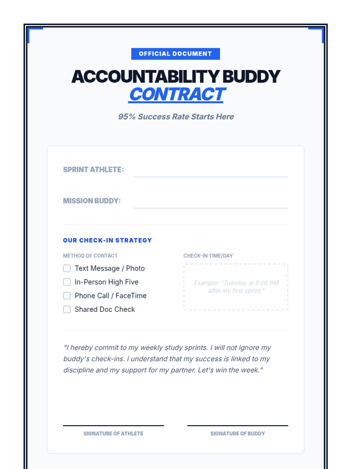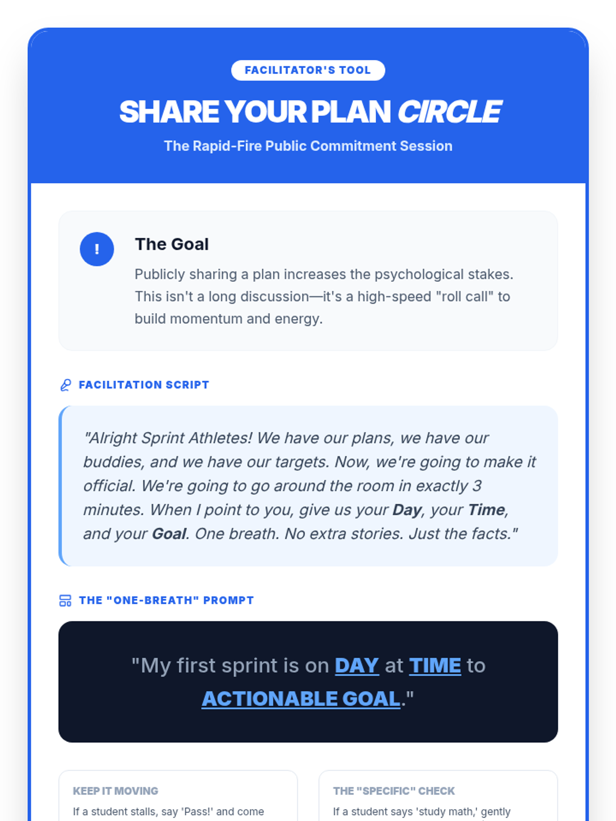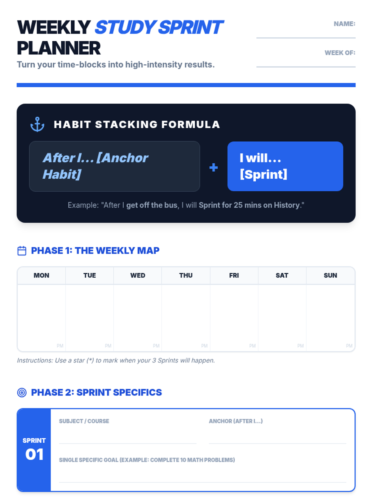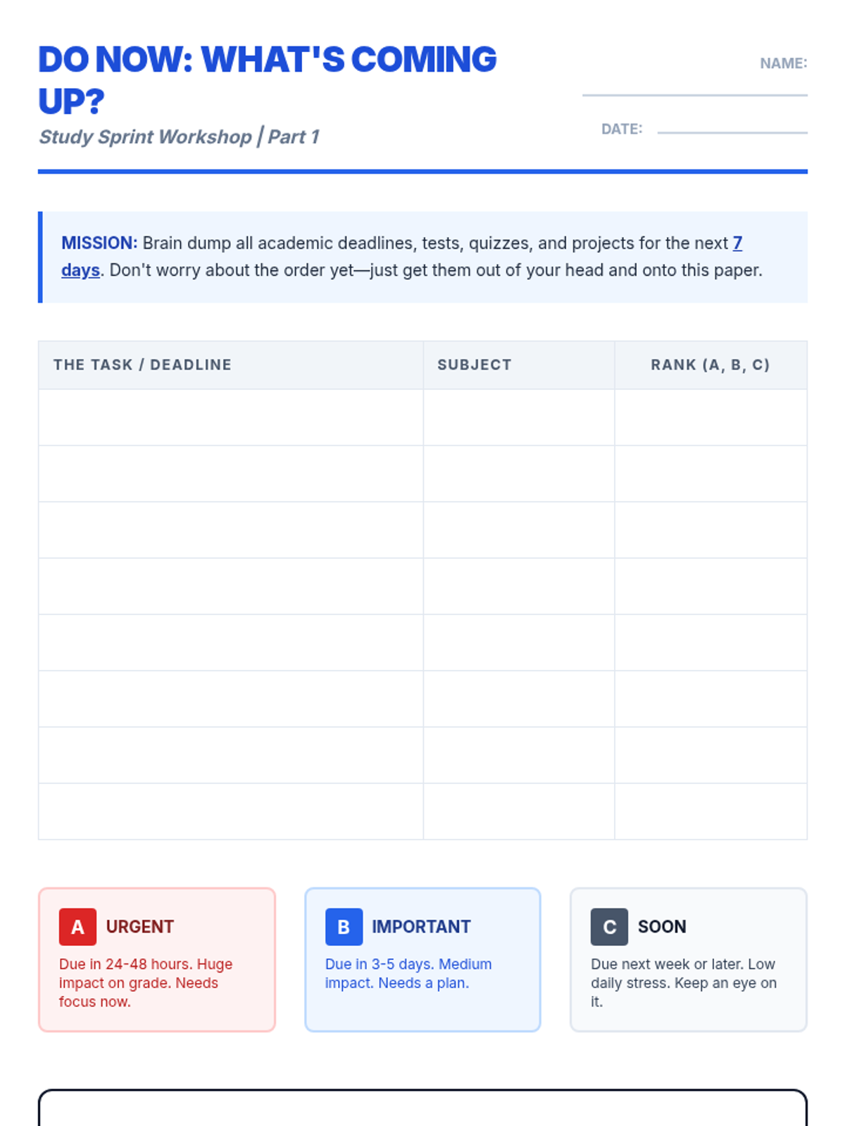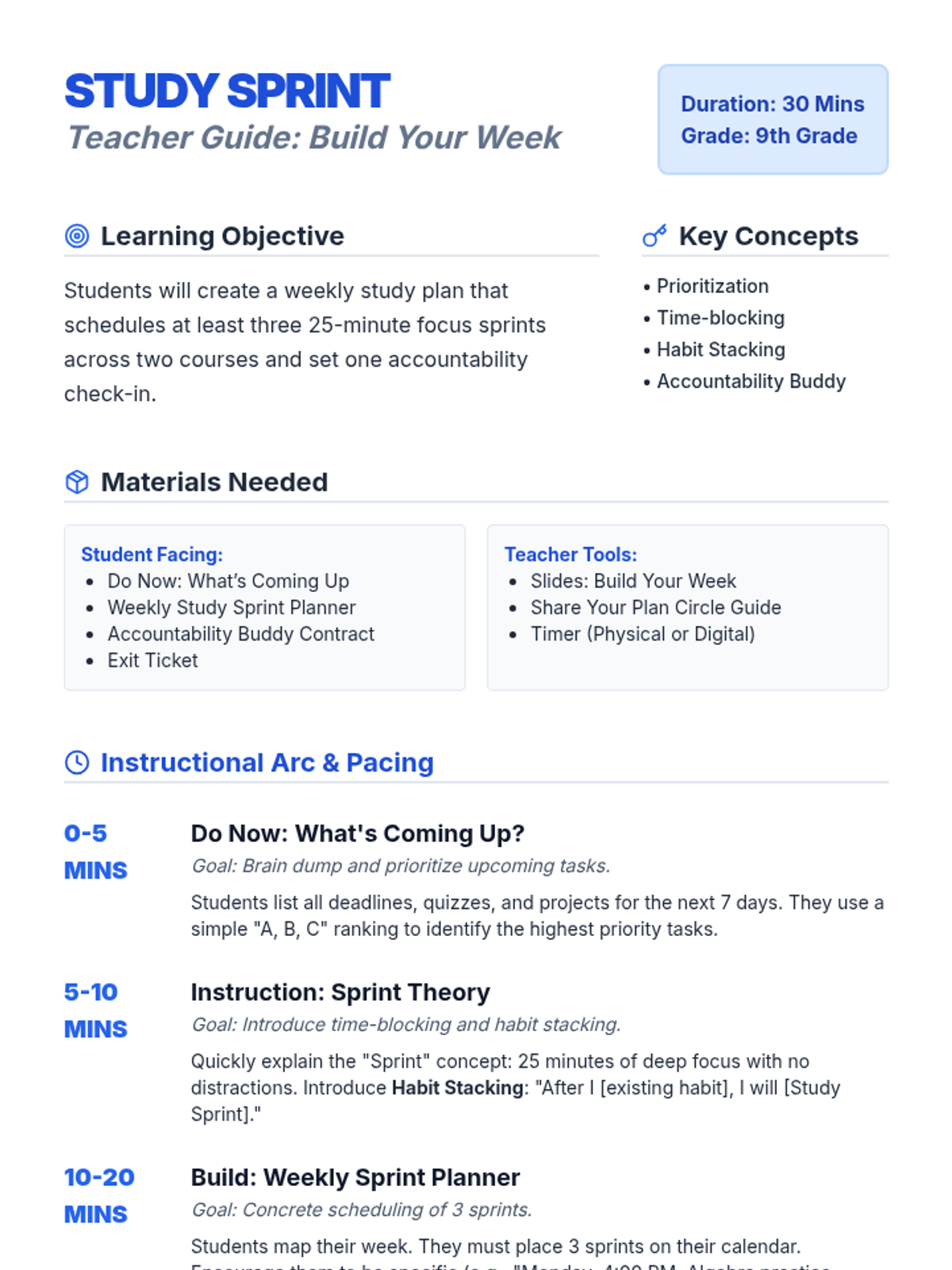 A high-energy 30-minute workshop designed to help 9th graders master time-blocking and accountability by creating a concrete weekly study plan featuring 'sprints'.