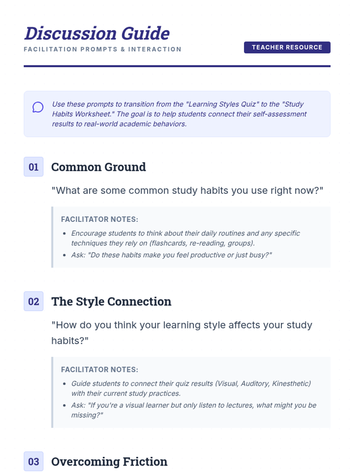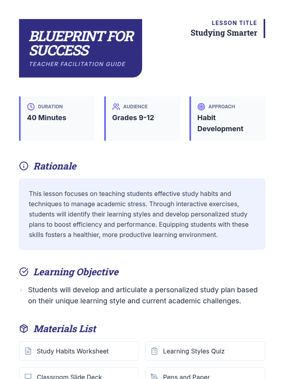 This lesson equips students with effective study habits and techniques to manage academic stress by identifying learning styles and creating personalized study plans.