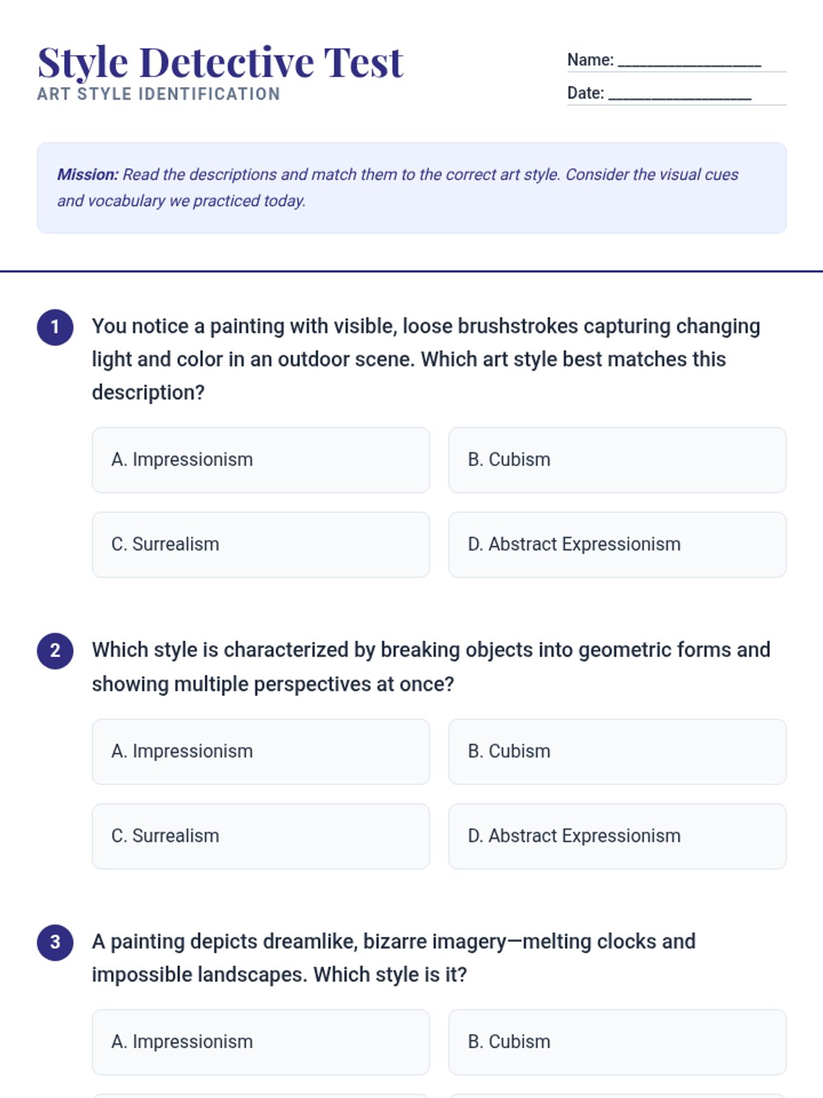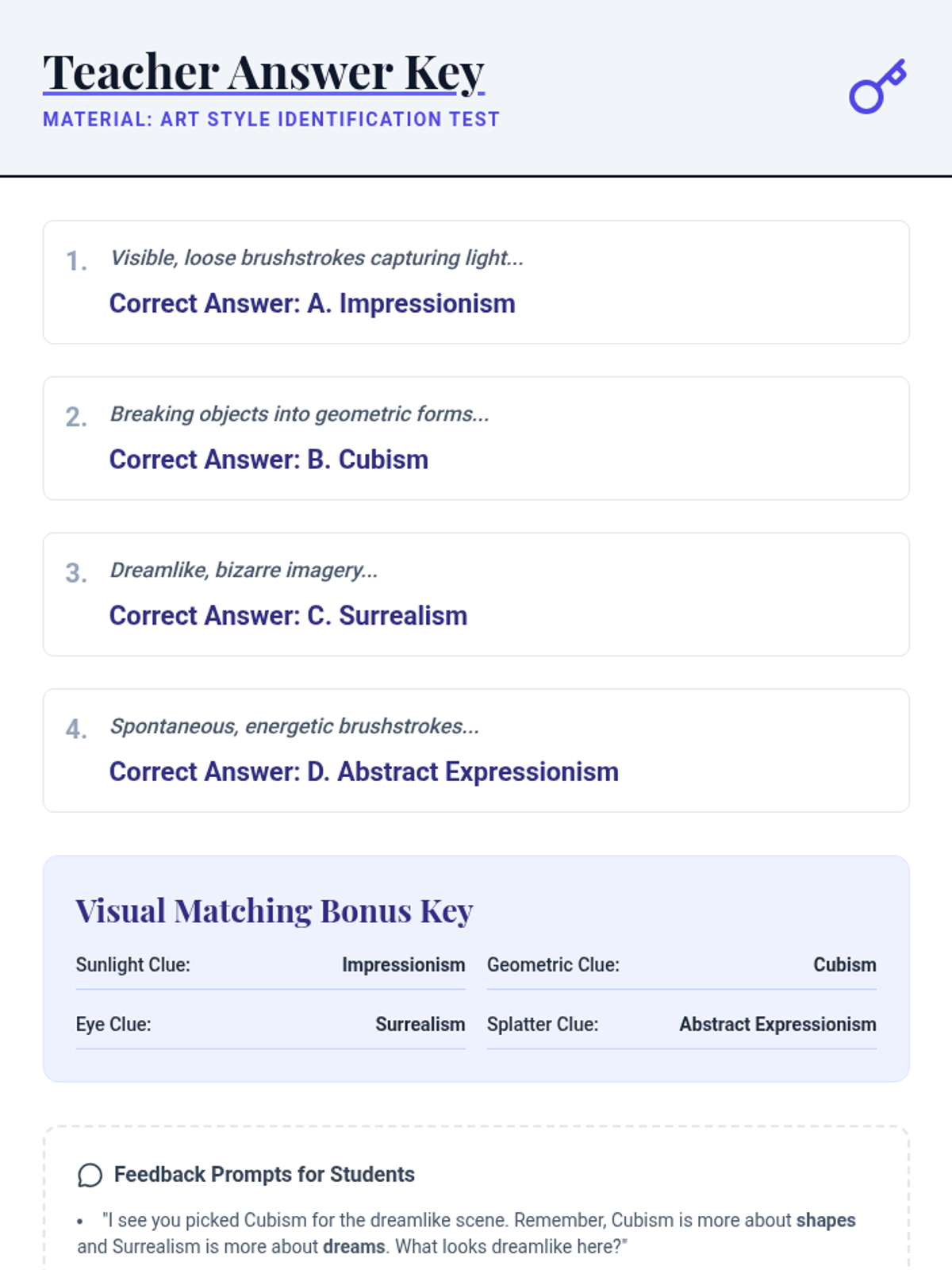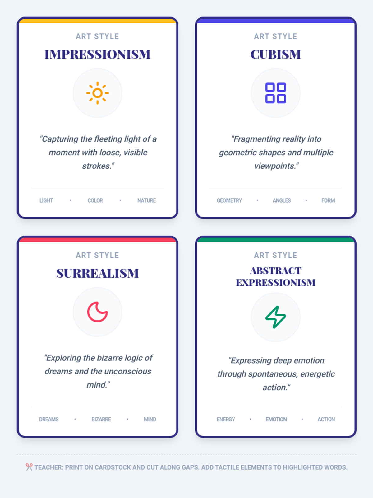 A 30-minute individual lesson introducing high school students to four major art styles: Impressionism, Cubism, Surrealism, and Abstract Expressionism. The lesson focuses on visual literacy and vocabulary through multi-sensory exploration and identification.