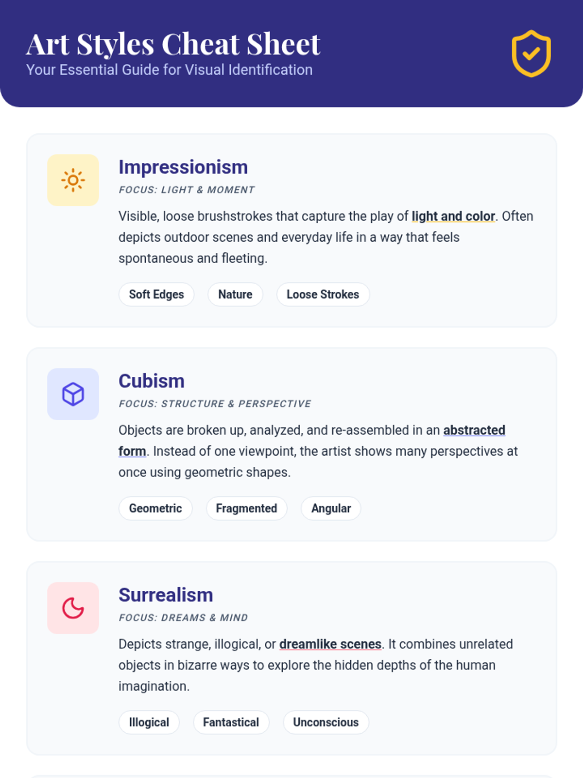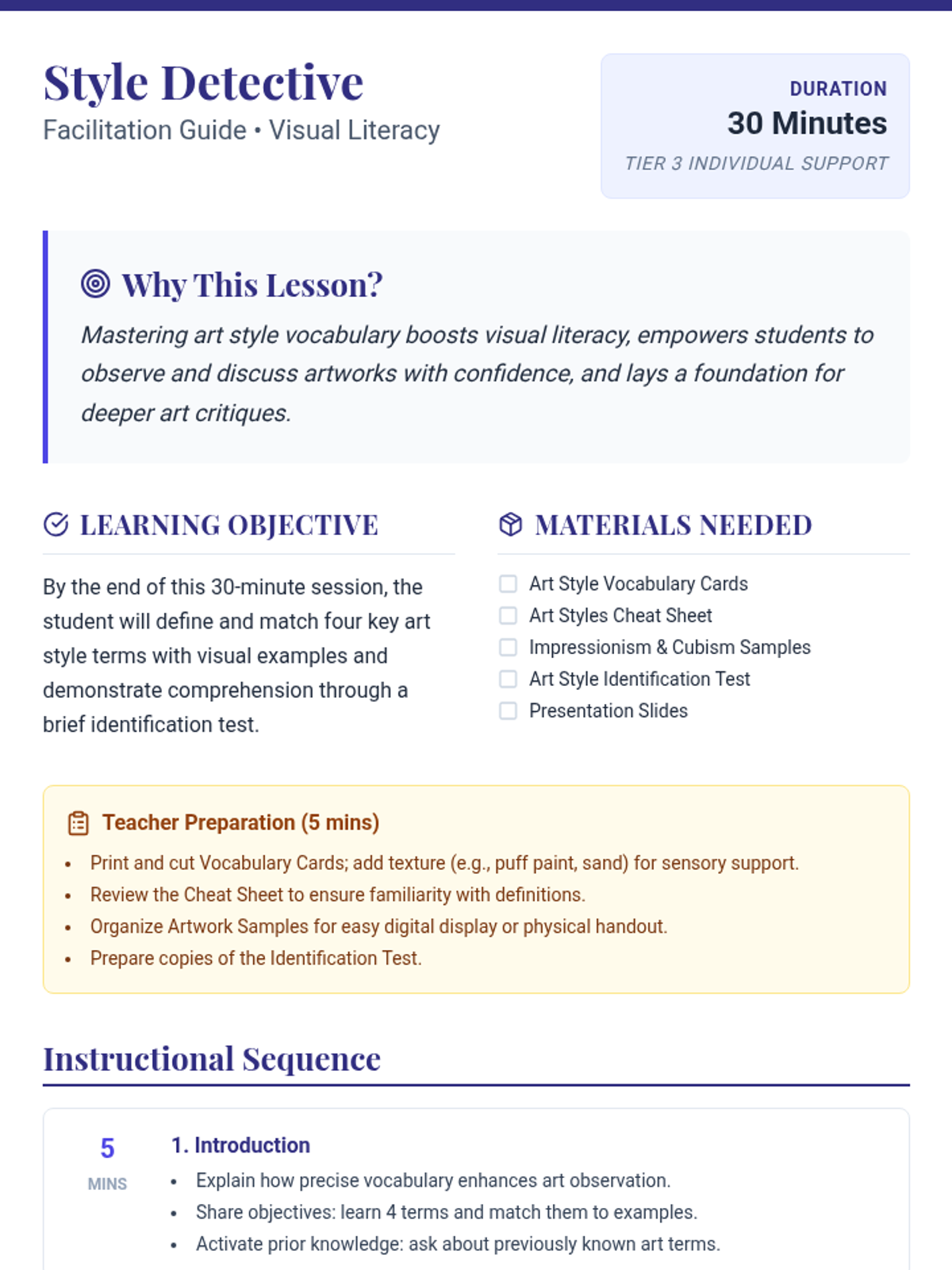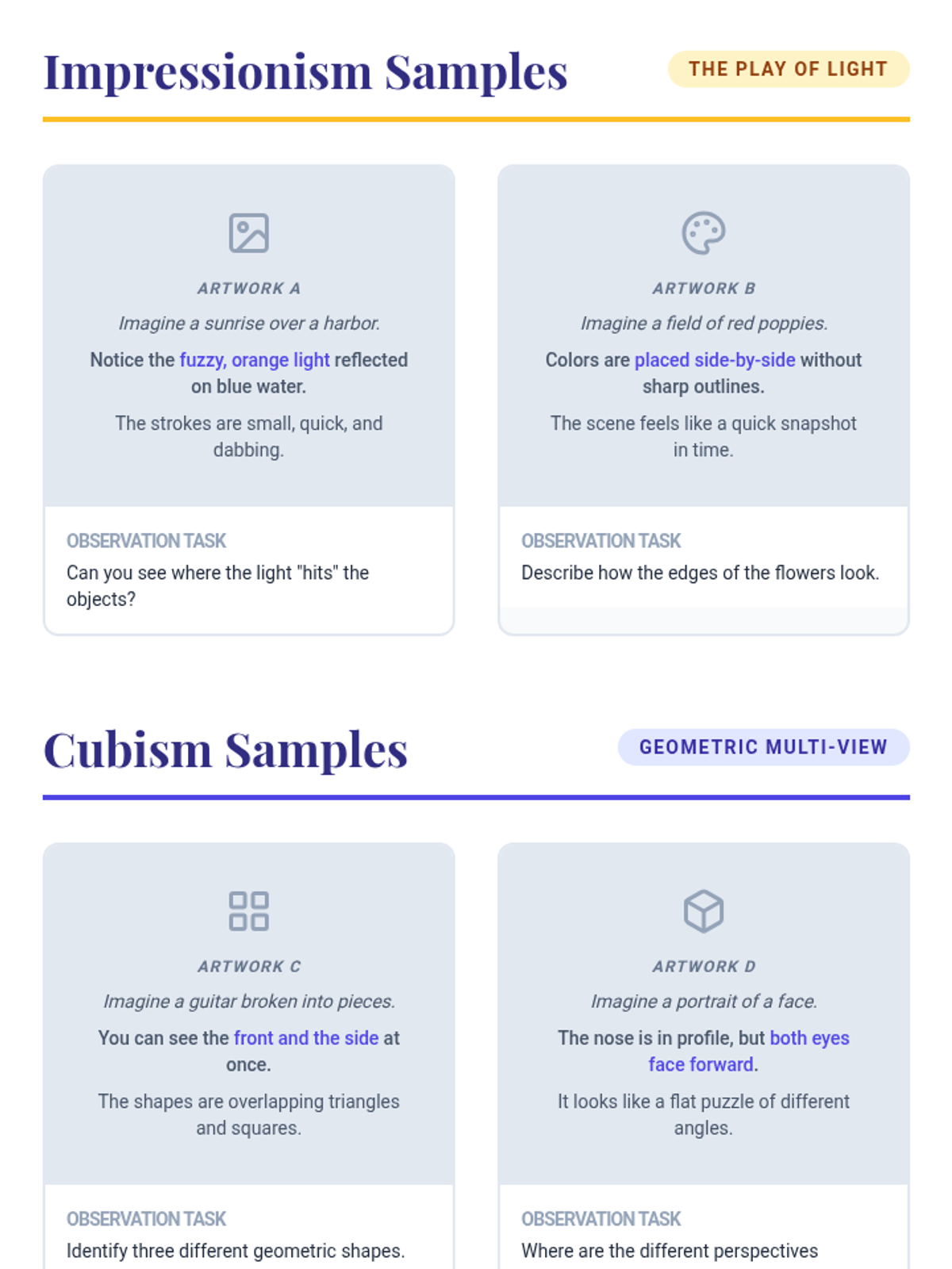 A 30-minute individual lesson introducing high school students to four major art styles: Impressionism, Cubism, Surrealism, and Abstract Expressionism. The lesson focuses on visual literacy and vocabulary through multi-sensory exploration and identification.