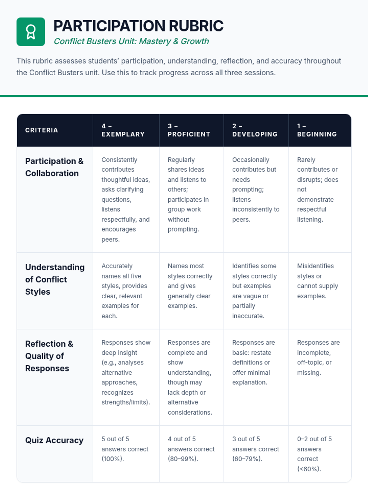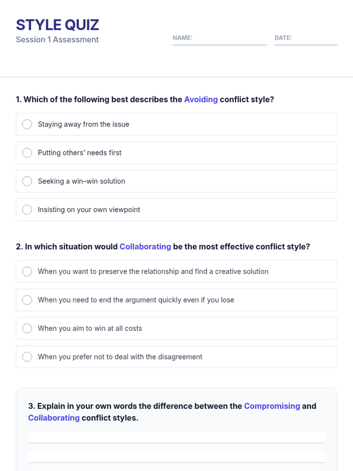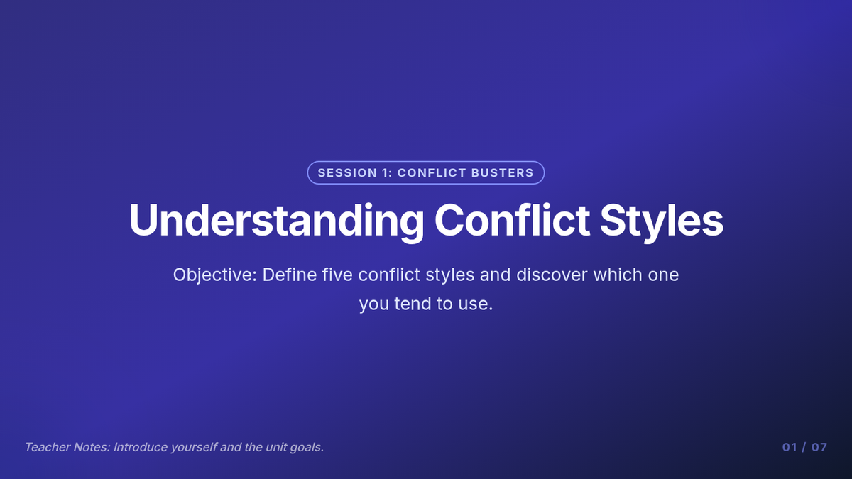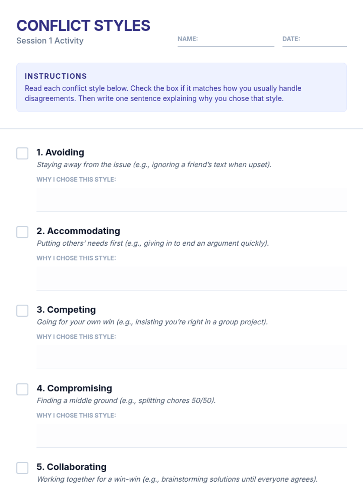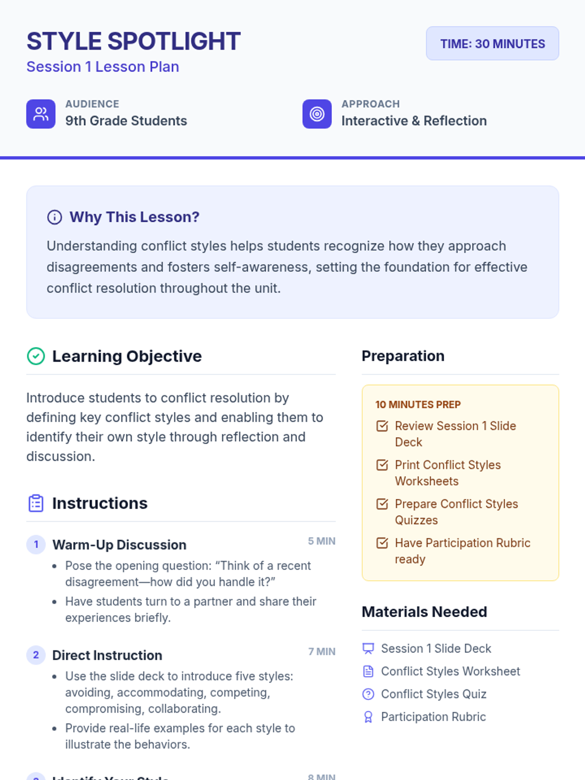 Introduce students to conflict resolution by defining key conflict styles and enabling them to identify their own style through reflection and discussion.