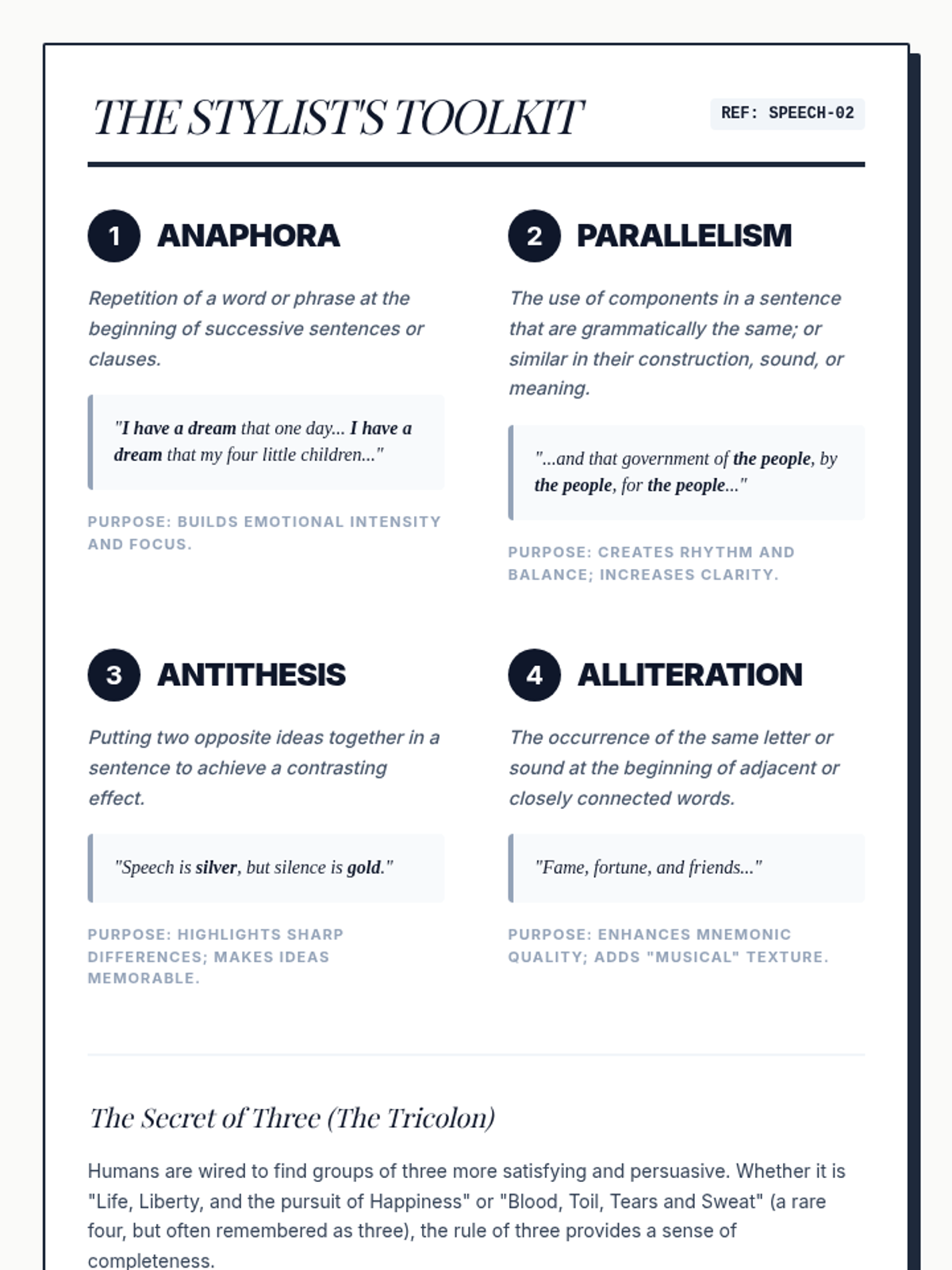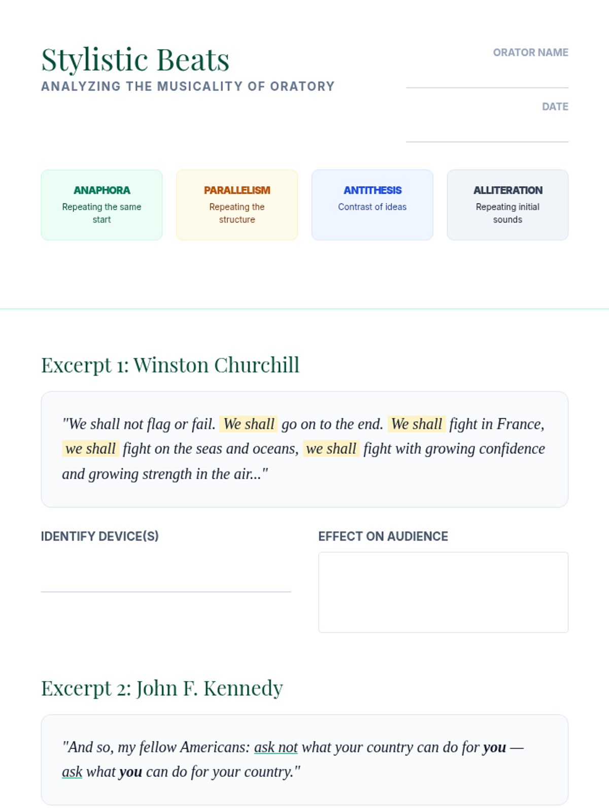 Exploration of stylistic devices such as anaphora, parallelism, and antithesis, focusing on how these 'musical' elements enhance a speech's impact and rhythm.