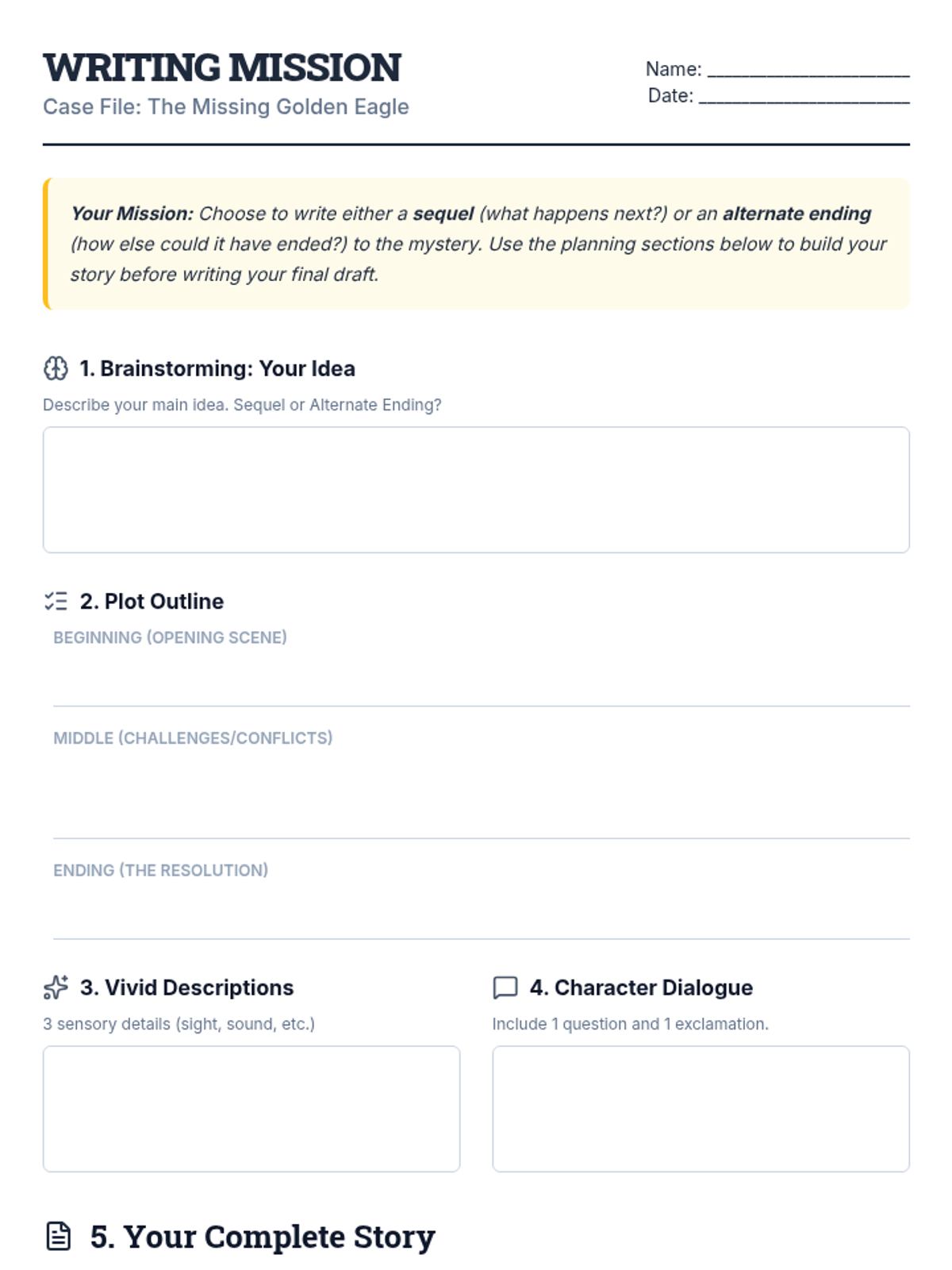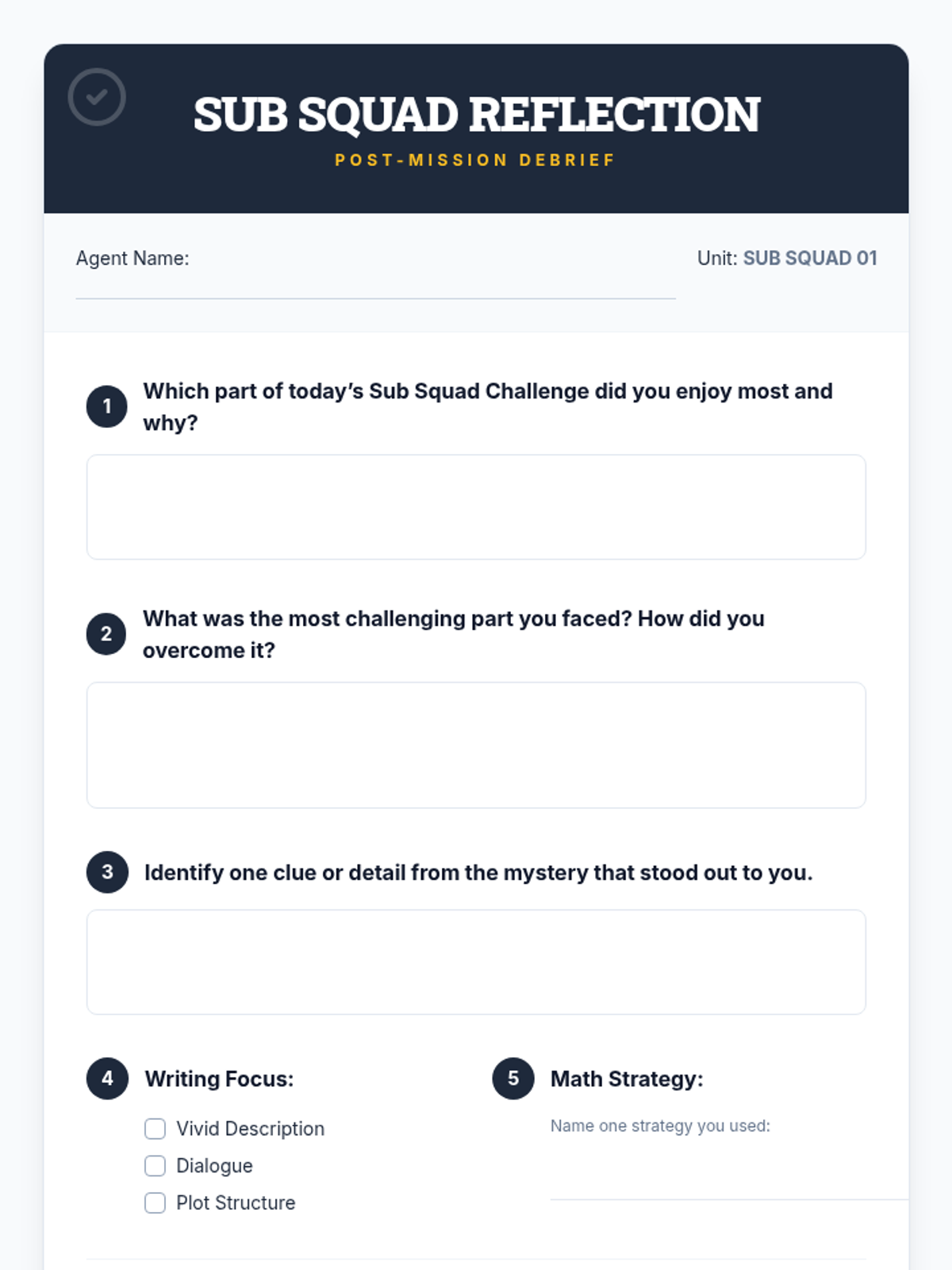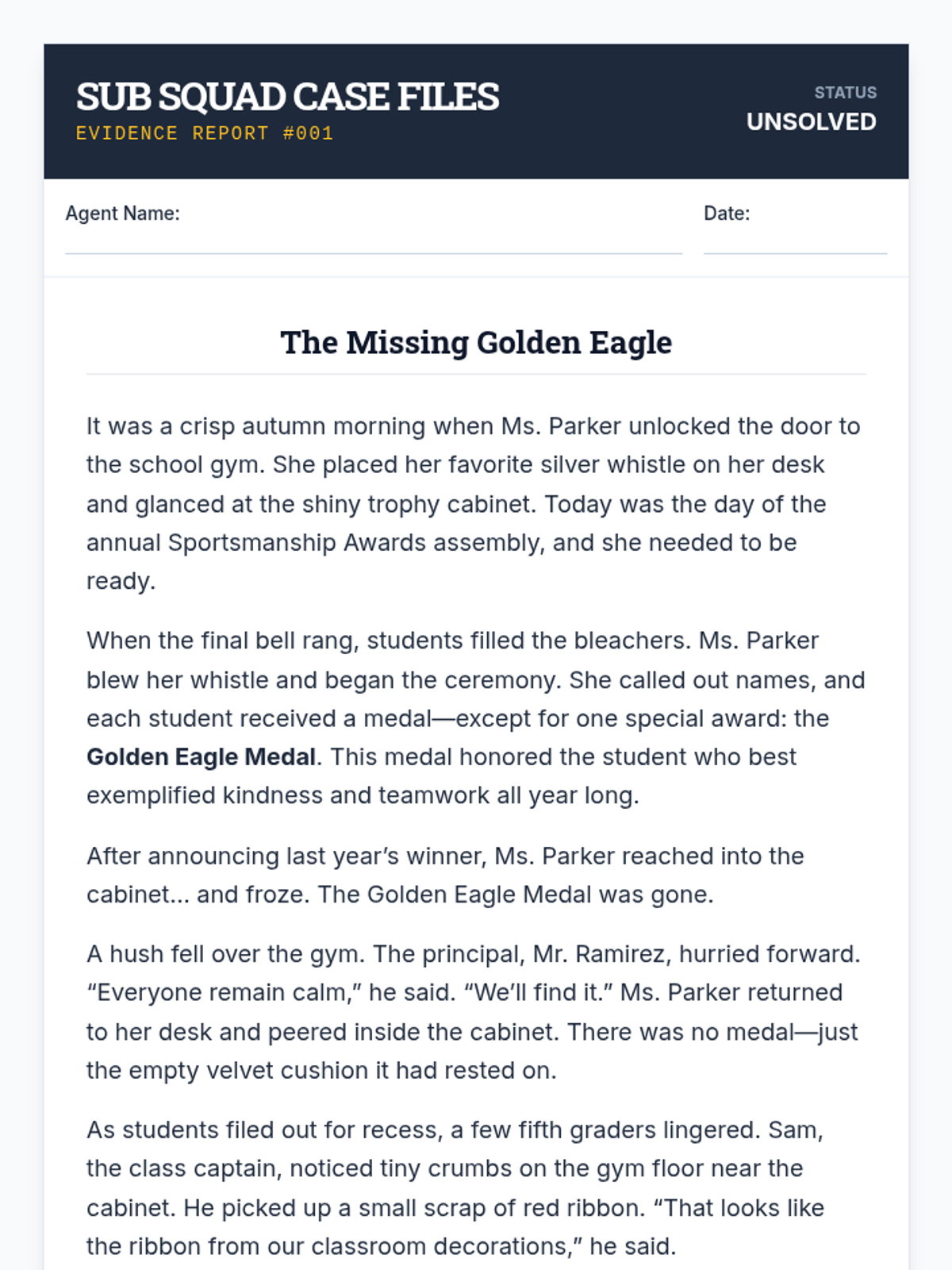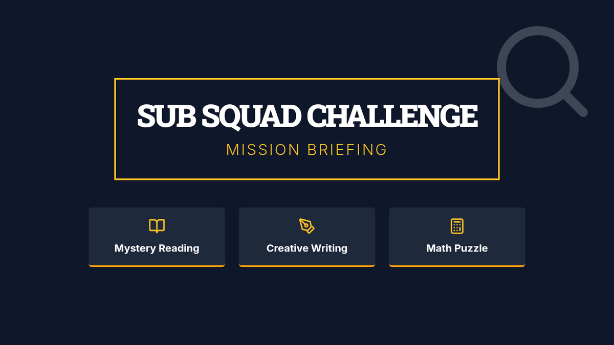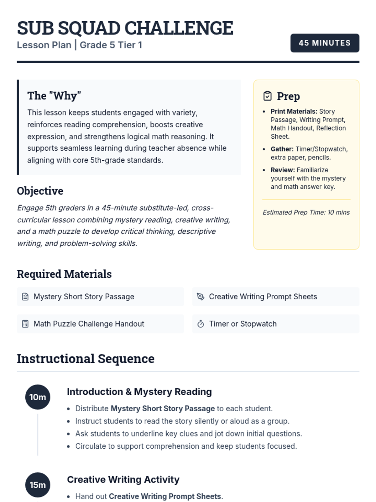 A 45-minute Tier 1 substitute lesson for 5th graders featuring a mystery reading, creative writing task, and math puzzle challenge. Designed for high engagement and minimal prep.