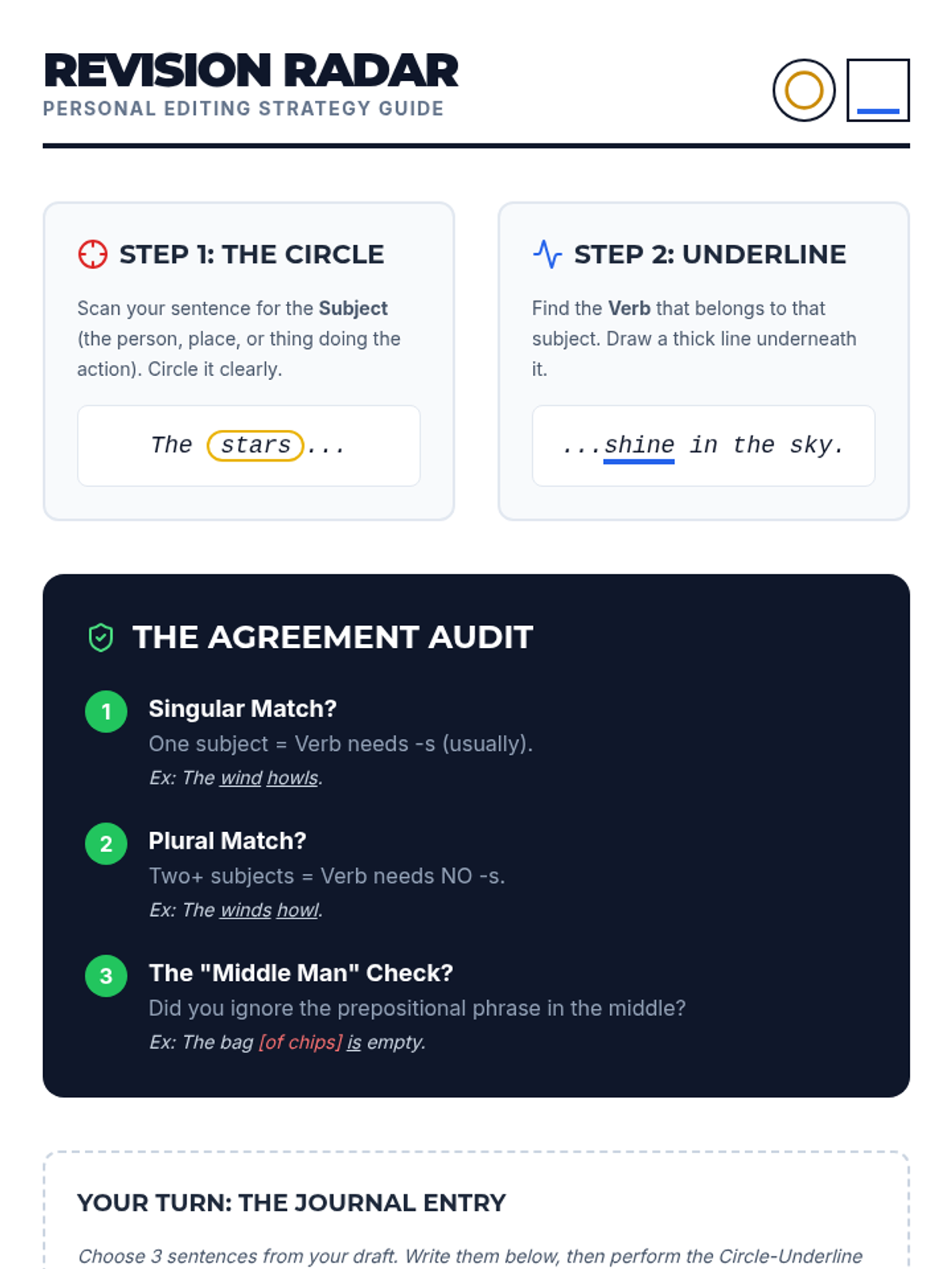 Students learn a 'Circle and Underline' self-audit strategy to verify subject-verb agreement in their own drafts, promoting self-regulation and intentional revision.