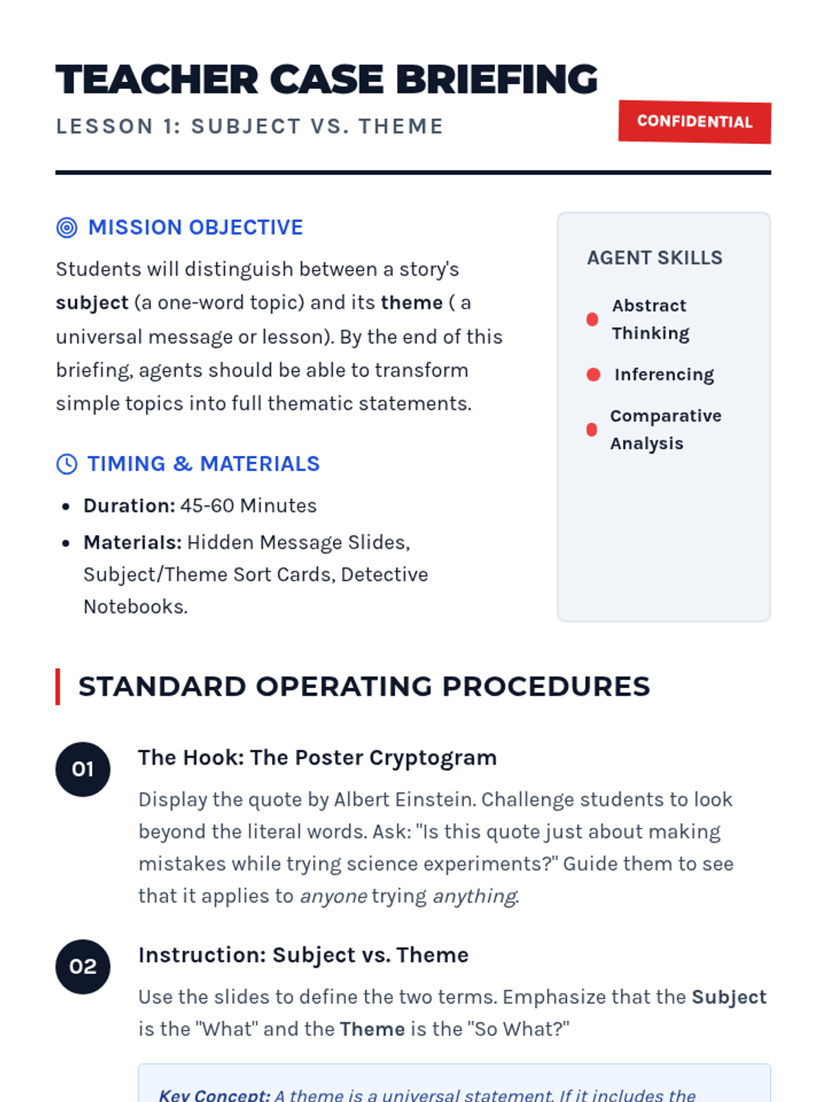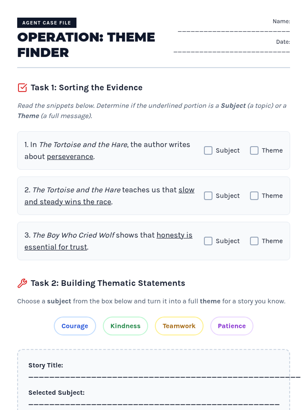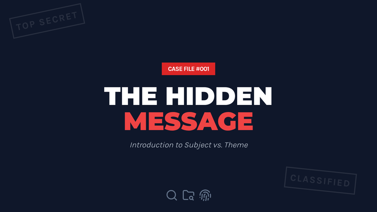 Students distinguish between a story's subject (what it's about) and its theme (the message the author is sending). They practice turning one-word topics into full thematic statements using familiar stories.