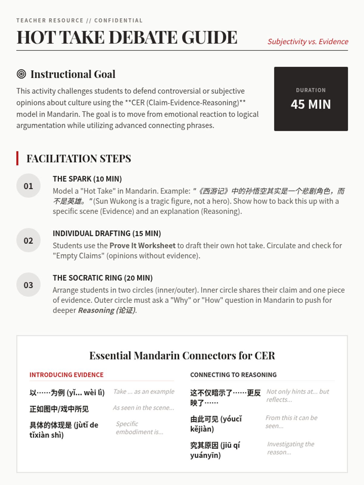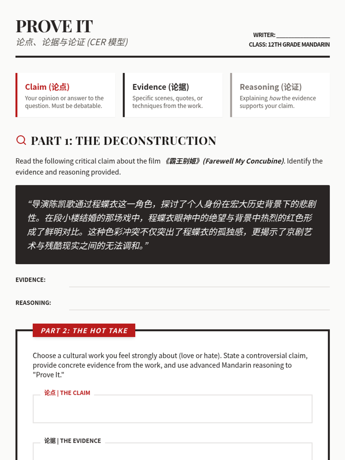 Focuses on backing up subjective opinions with concrete evidence using the Claim-Evidence-Reasoning (CER) model in a critical context.