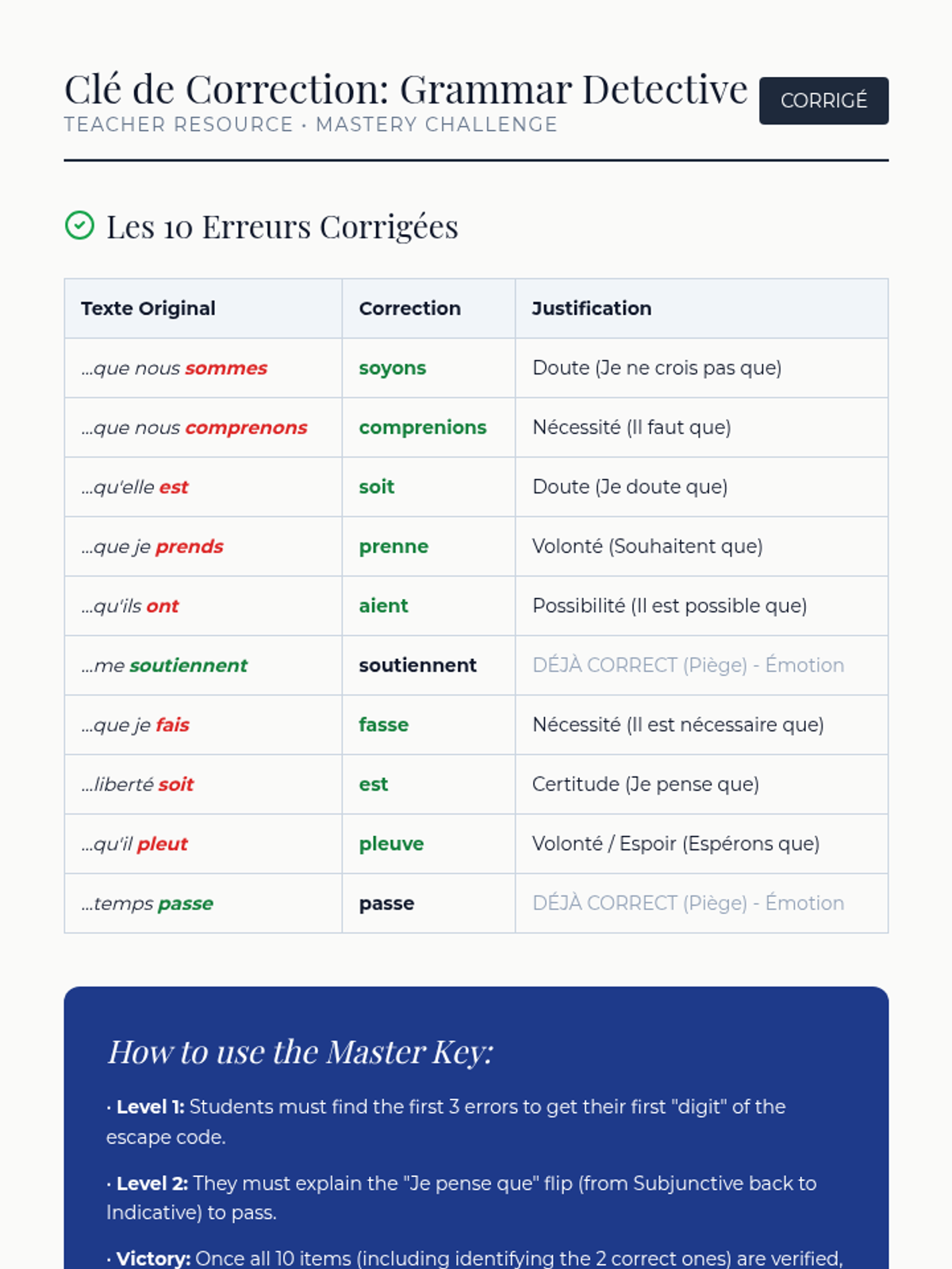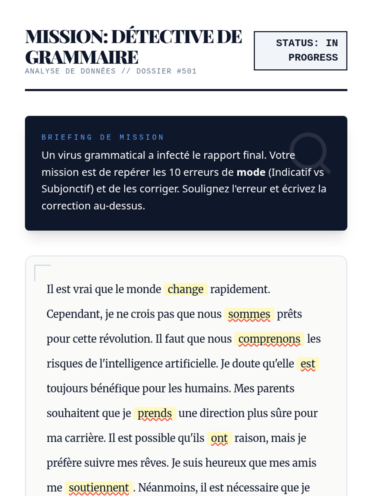 A mastery-based review challenge where students analyze complex sentences and edit texts to decide if the subjunctive is triggered.