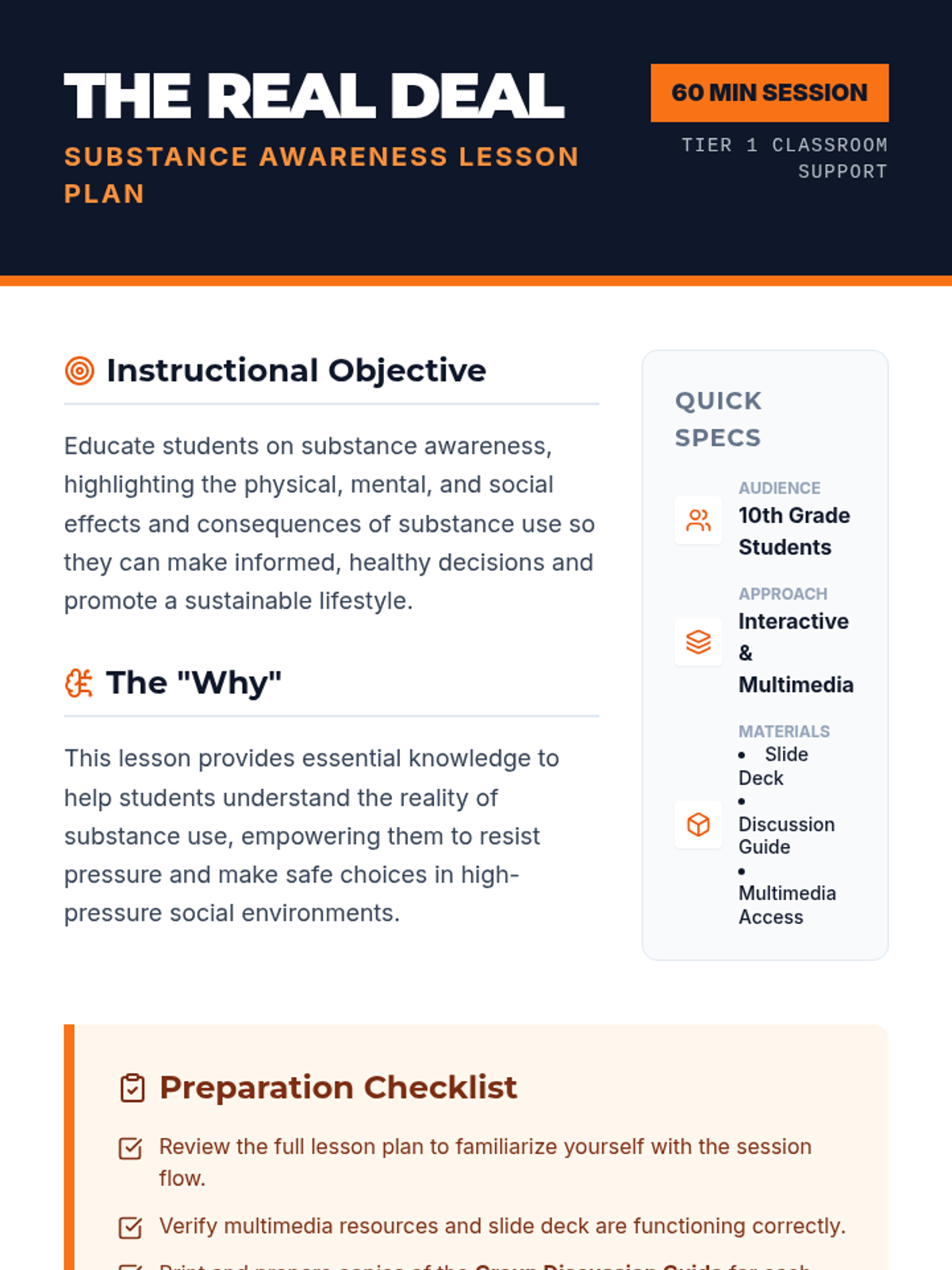A 60-minute session for 10th-grade students focused on the physical, mental, and social consequences of substance use, designed to empower informed decision-making.