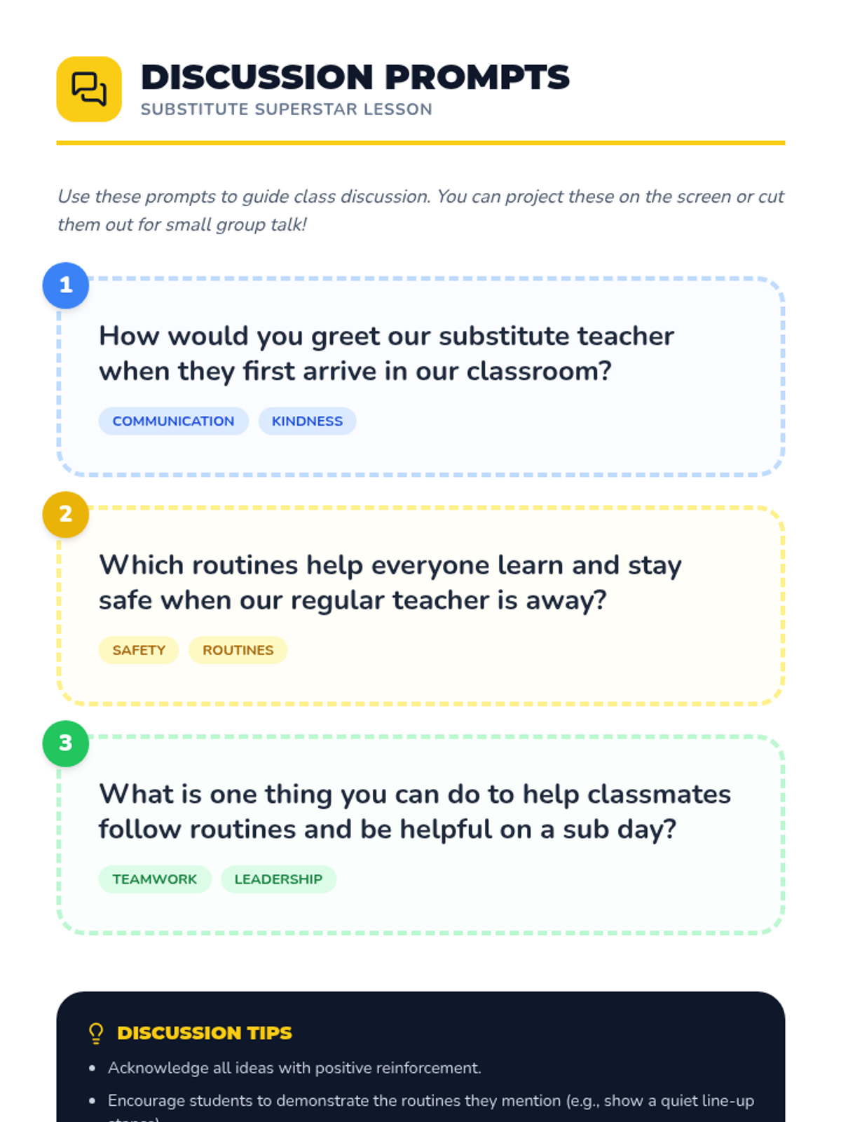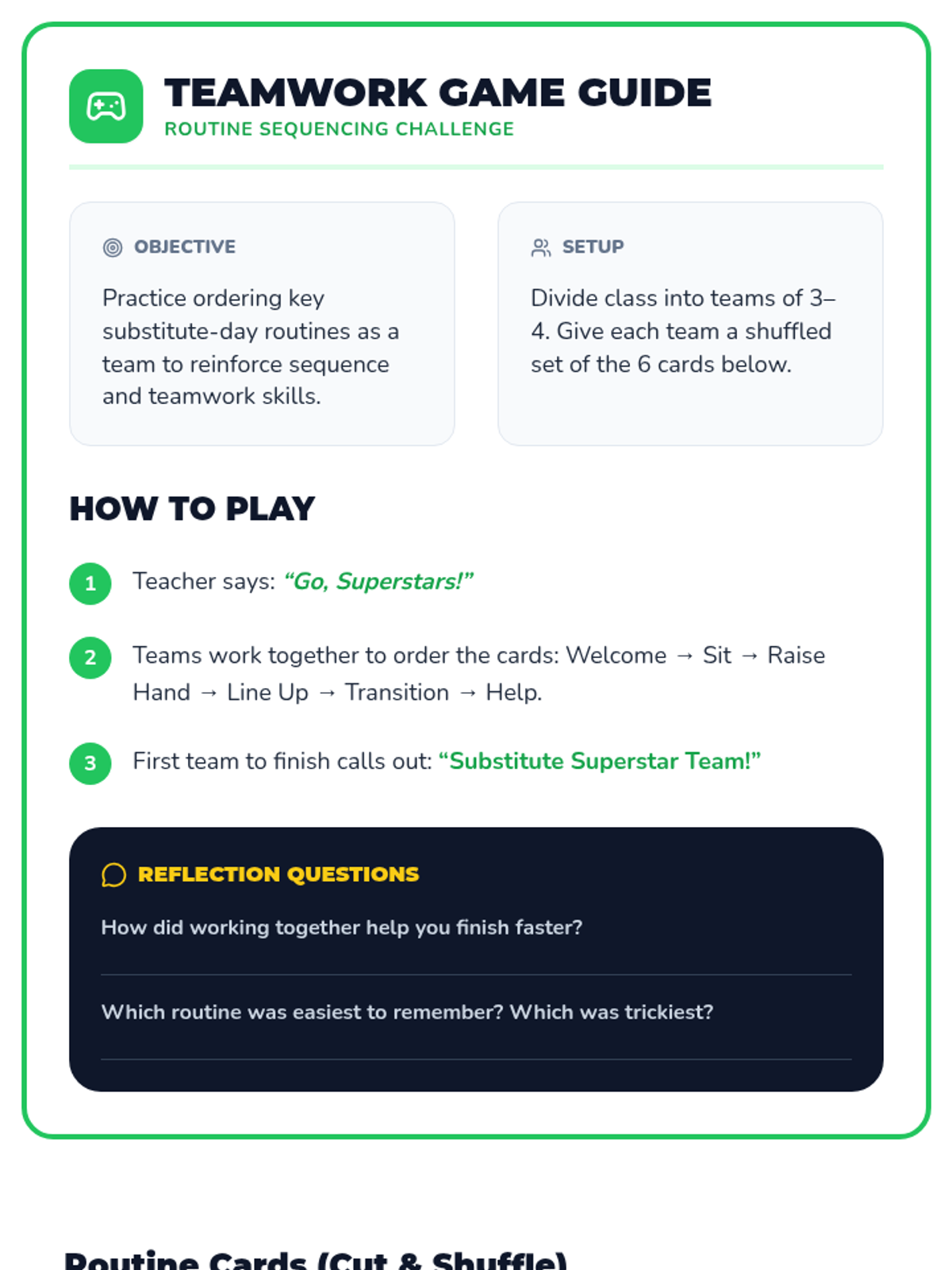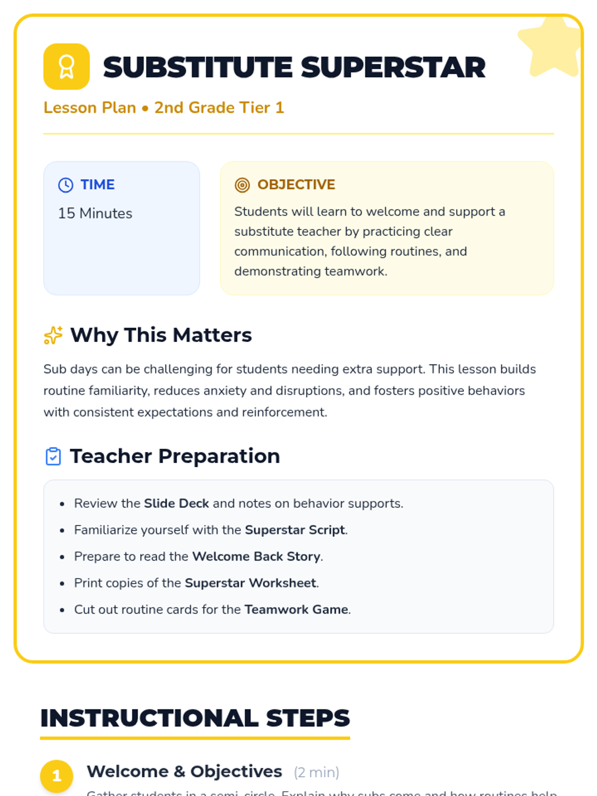 A 15-minute Tier 1 lesson for 2nd graders to learn and practice classroom routines with a substitute teacher, focusing on communication, expectations, and teamwork.