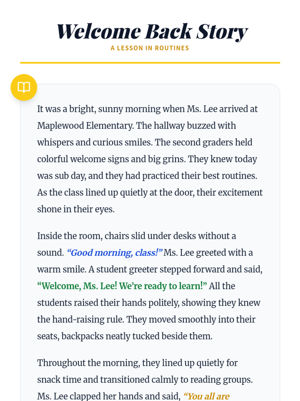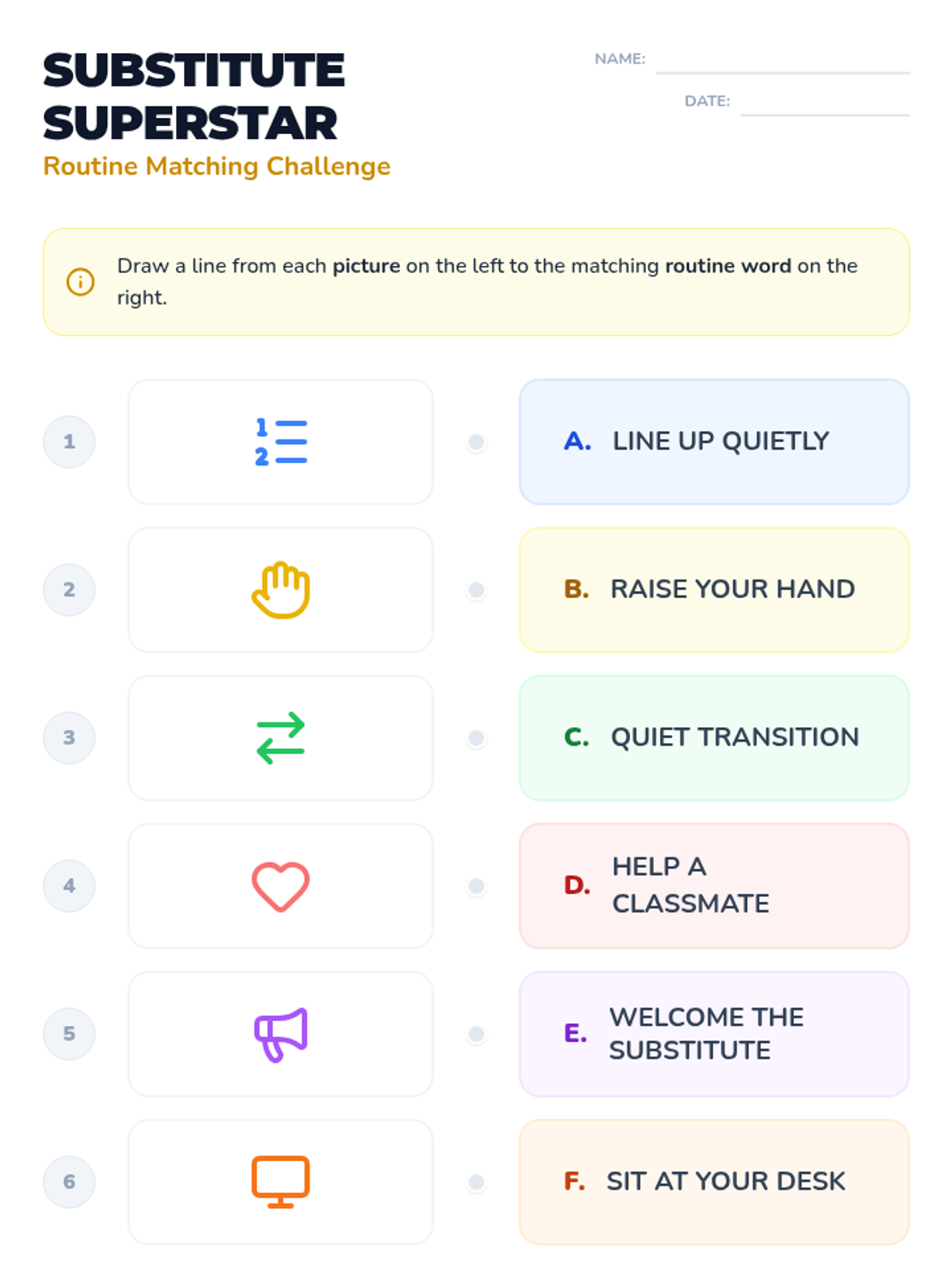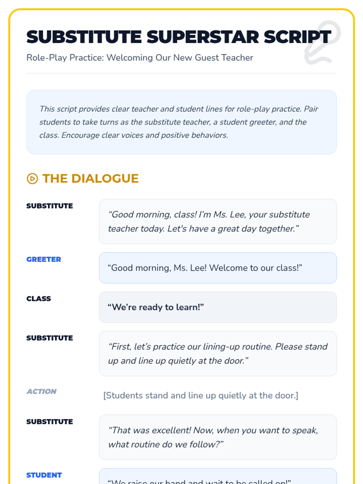 A 15-minute Tier 1 lesson for 2nd graders to learn and practice classroom routines with a substitute teacher, focusing on communication, expectations, and teamwork.