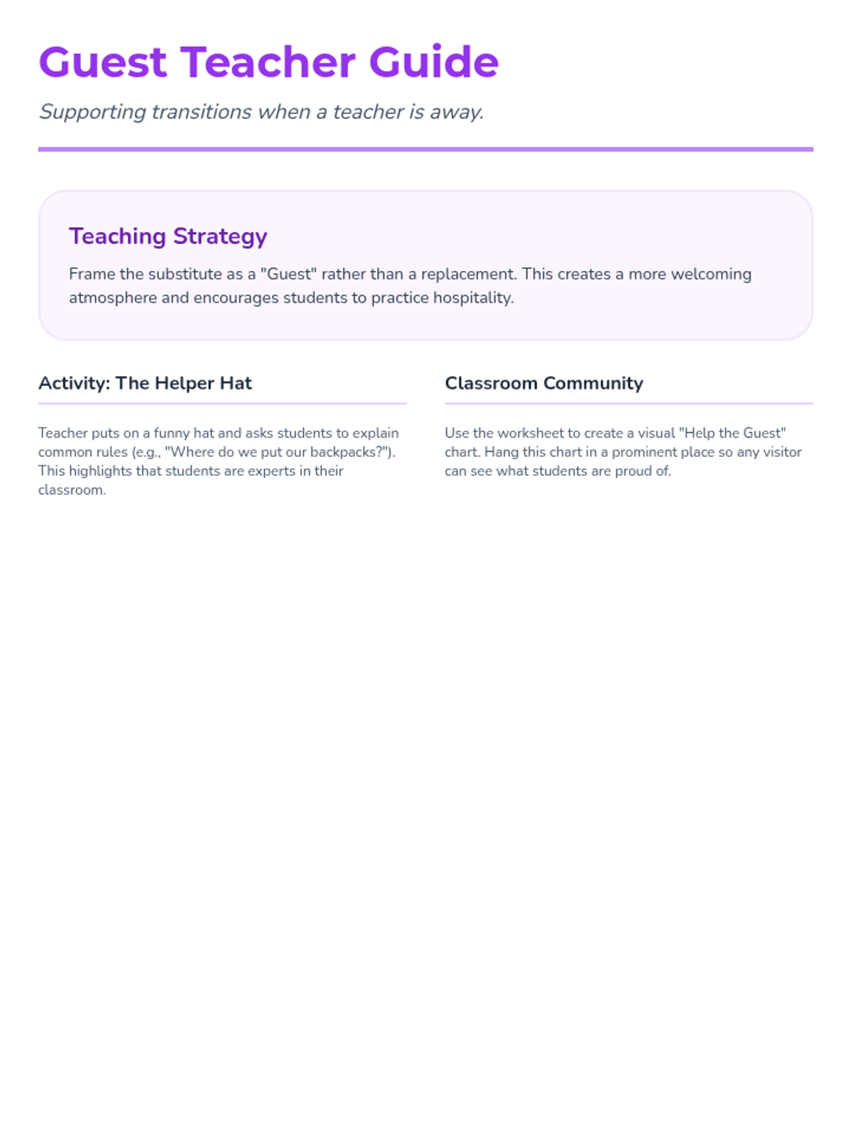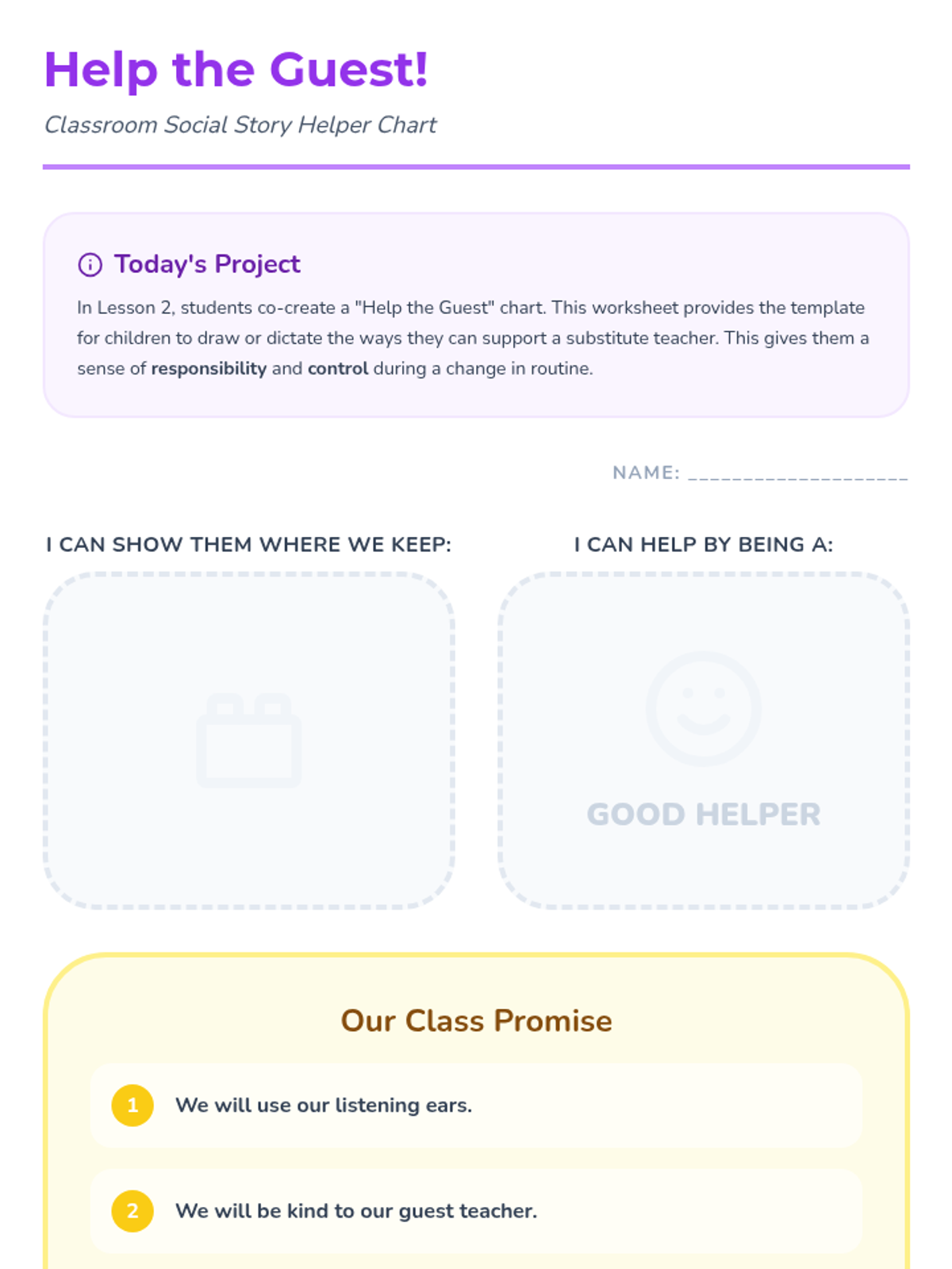 The class reads a story about what happens when the regular teacher is away. They co-create a 'Help the Guest' chart based on the story, listing things they can do to help a substitute teacher.