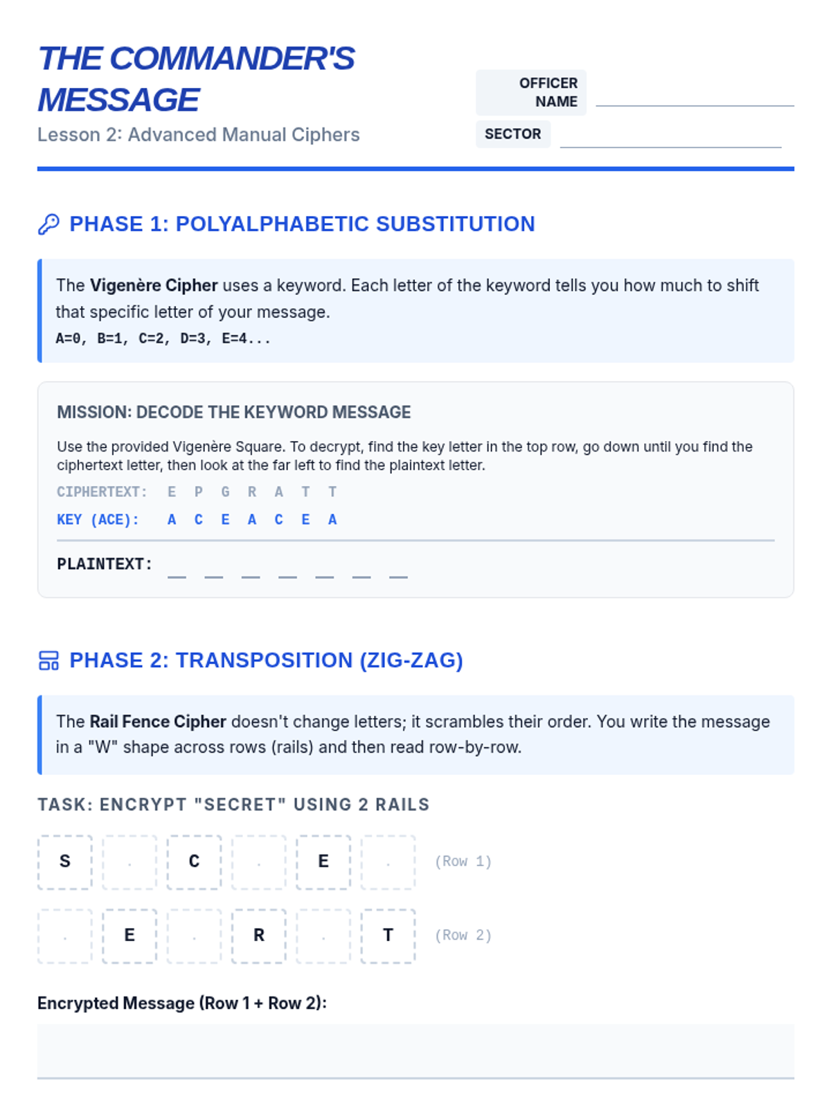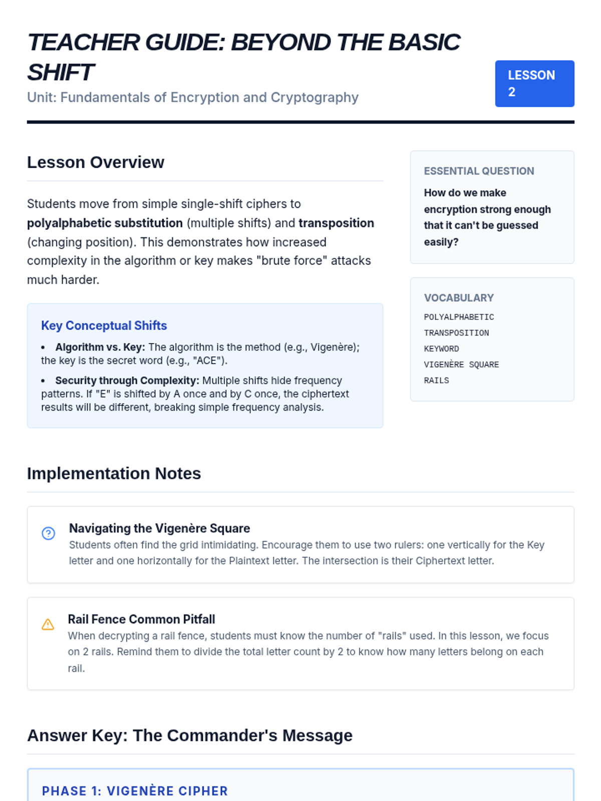 Building on simple shifts, students learn more complex manual encryption methods, including the Vigenère cipher and rail fence cipher. They discuss the concept of 'keys' and how adding complexity to the key increases security.