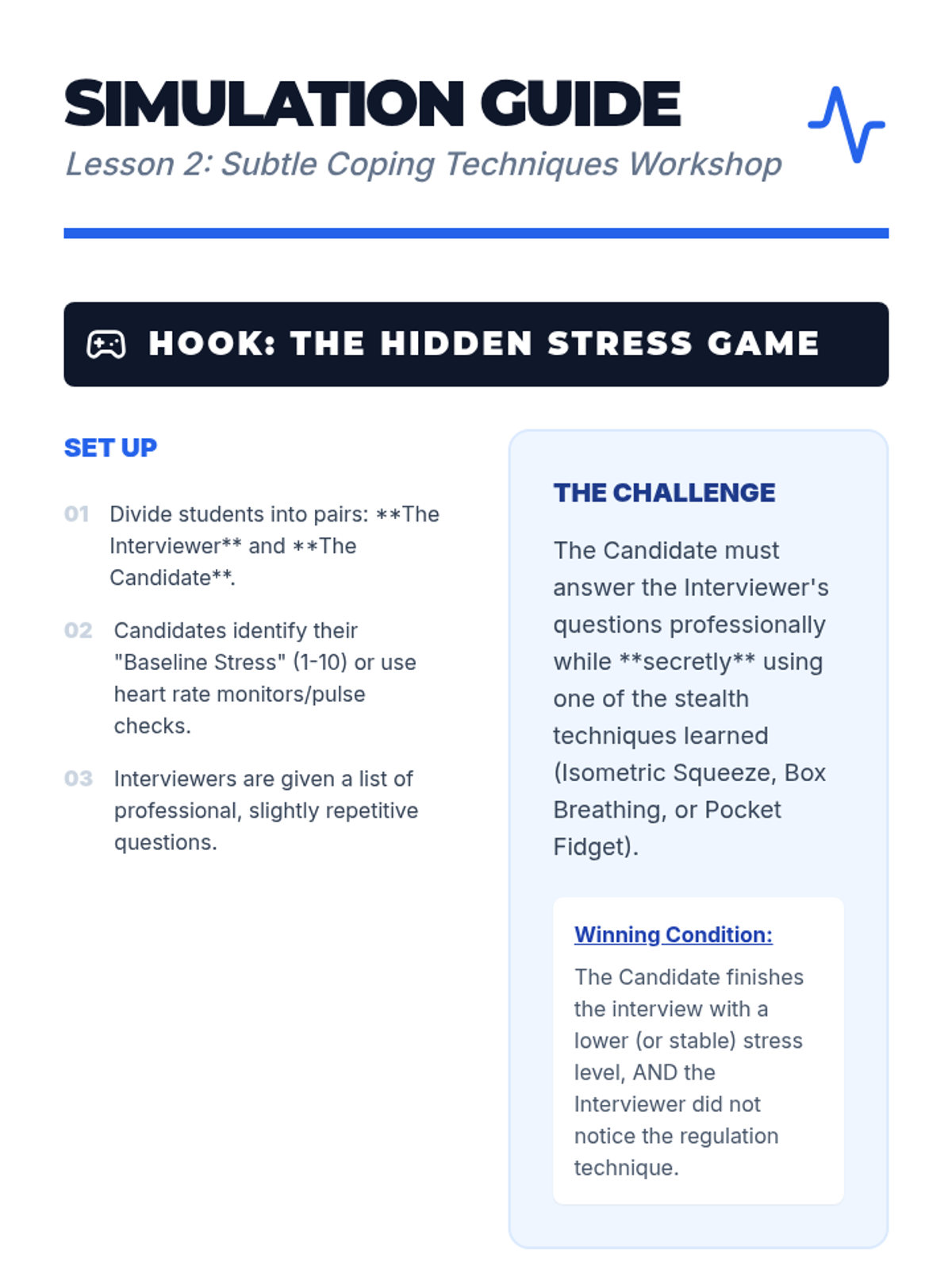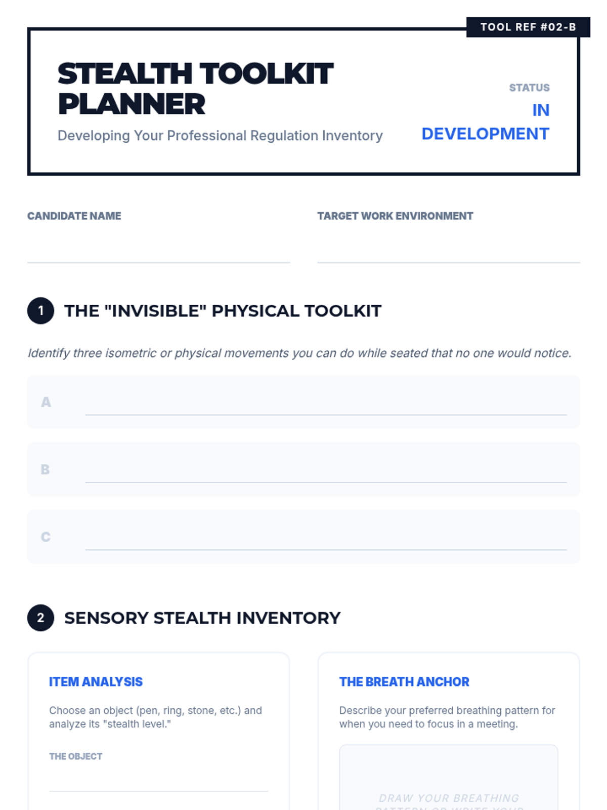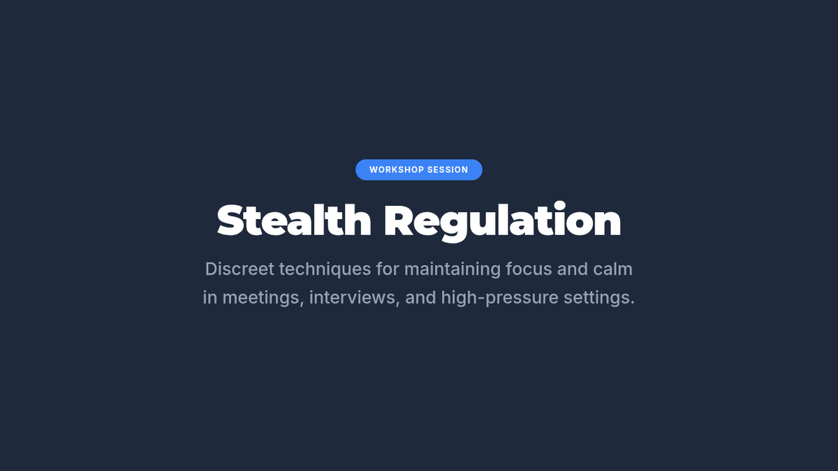 A workshop on discreet regulation tools and 'stealth' techniques like controlled breathing and isometric exercises for meetings and interviews.