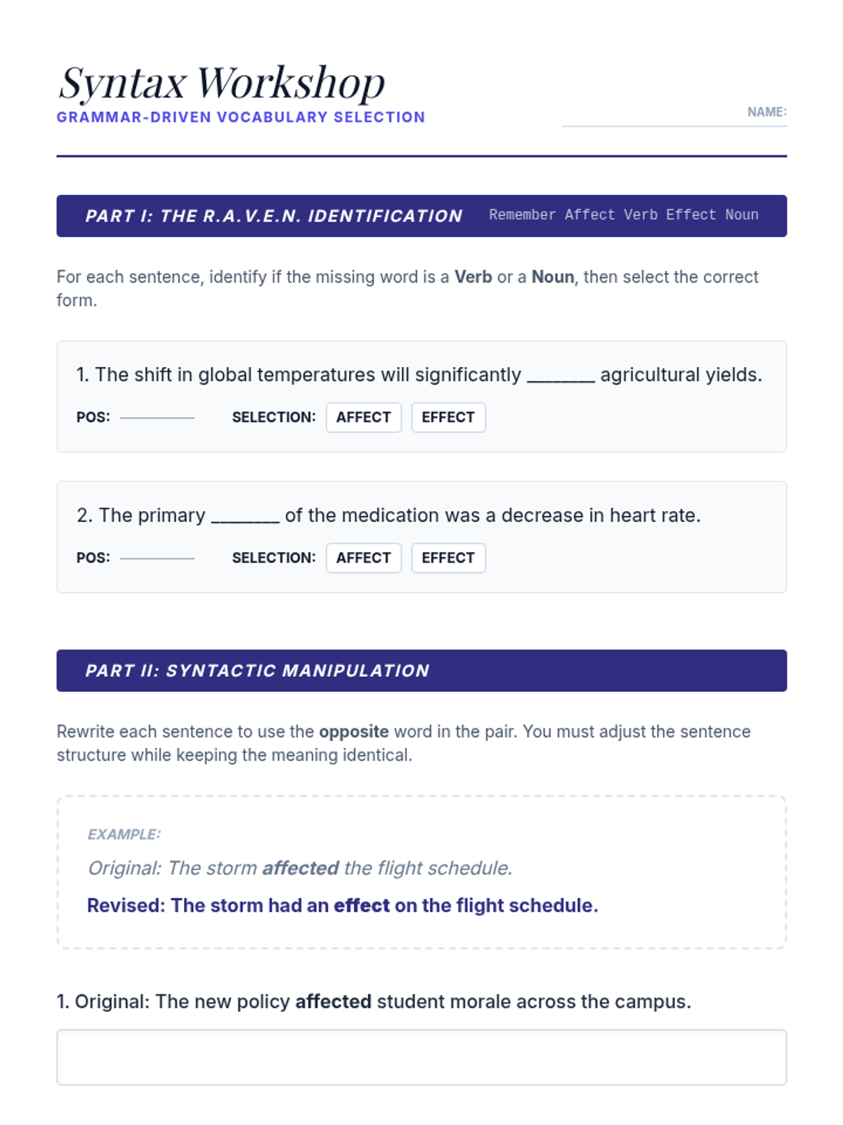 A workshop-style lesson focusing on syntax-dependent pairs like affect/effect. Students learn how parts of speech and sentence structure determine the correct homophone.