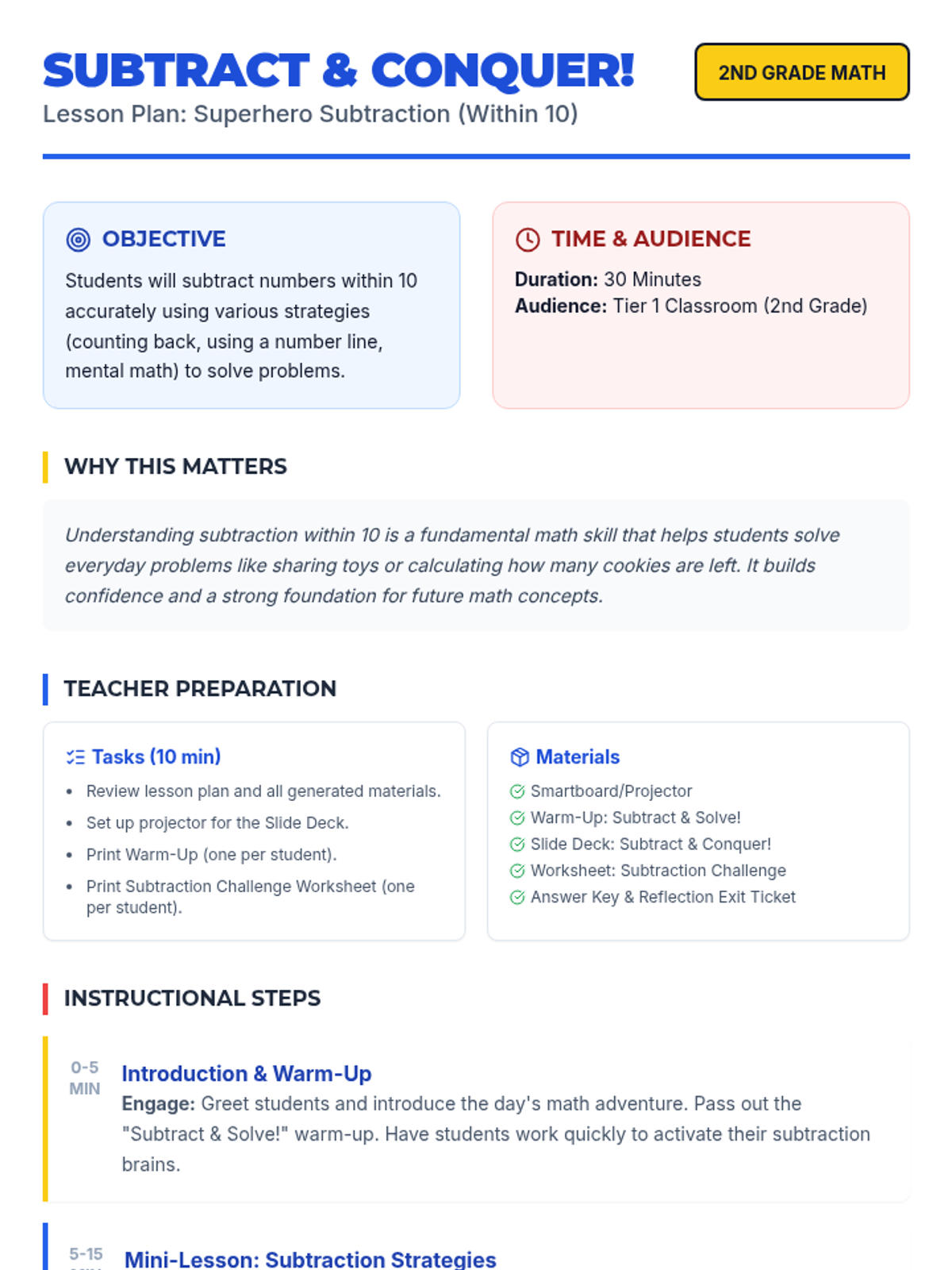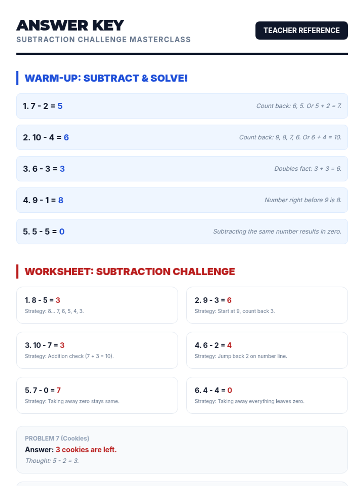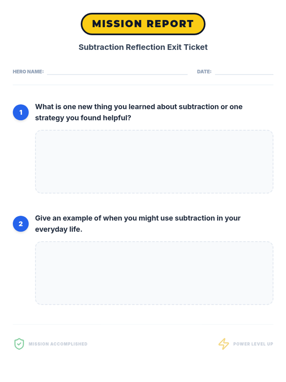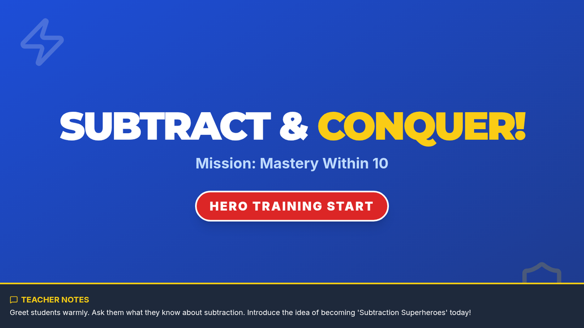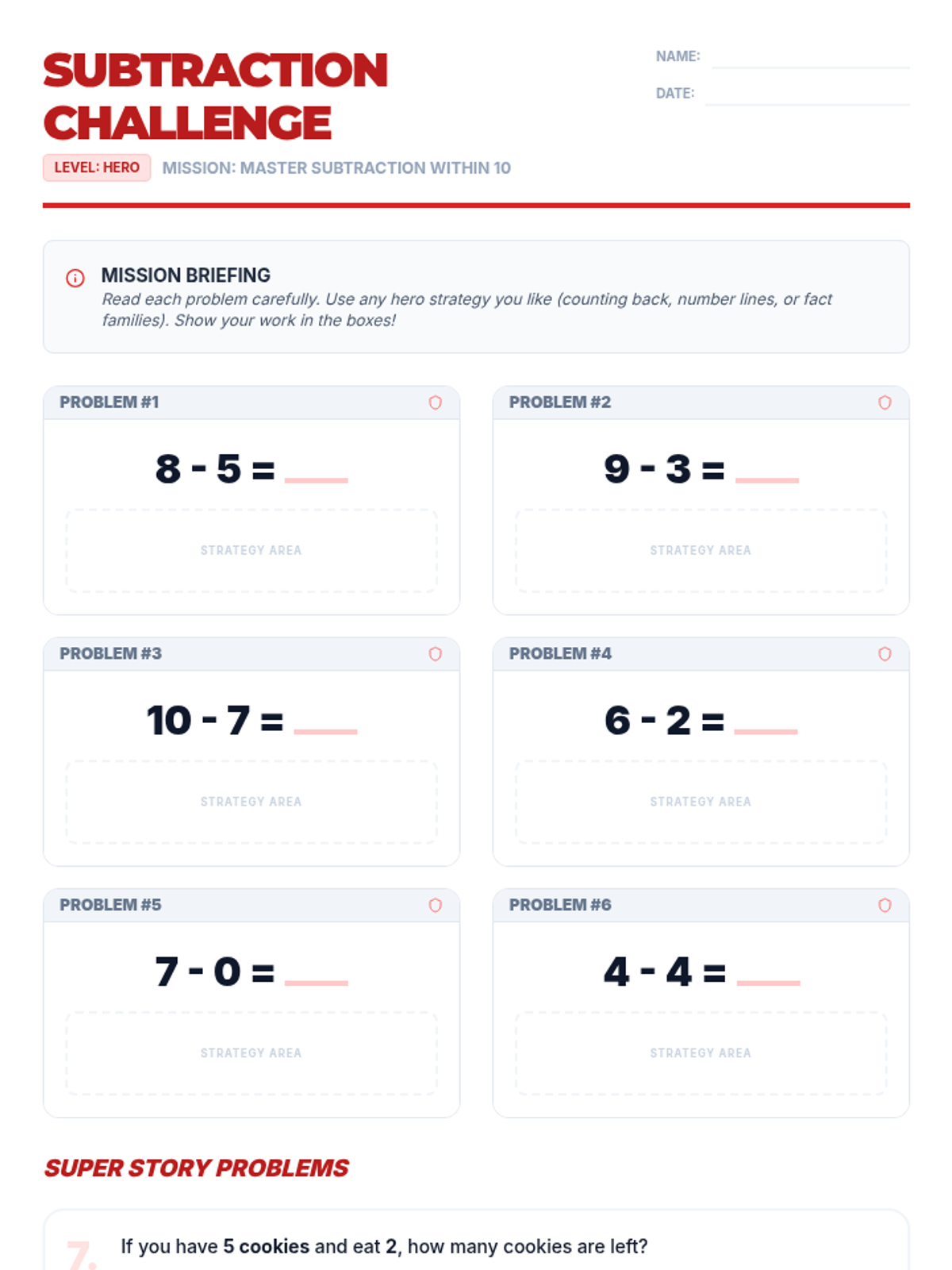Students master subtraction within 10 using strategies like counting back, number lines, and fact families in a high-energy superhero-themed environment.