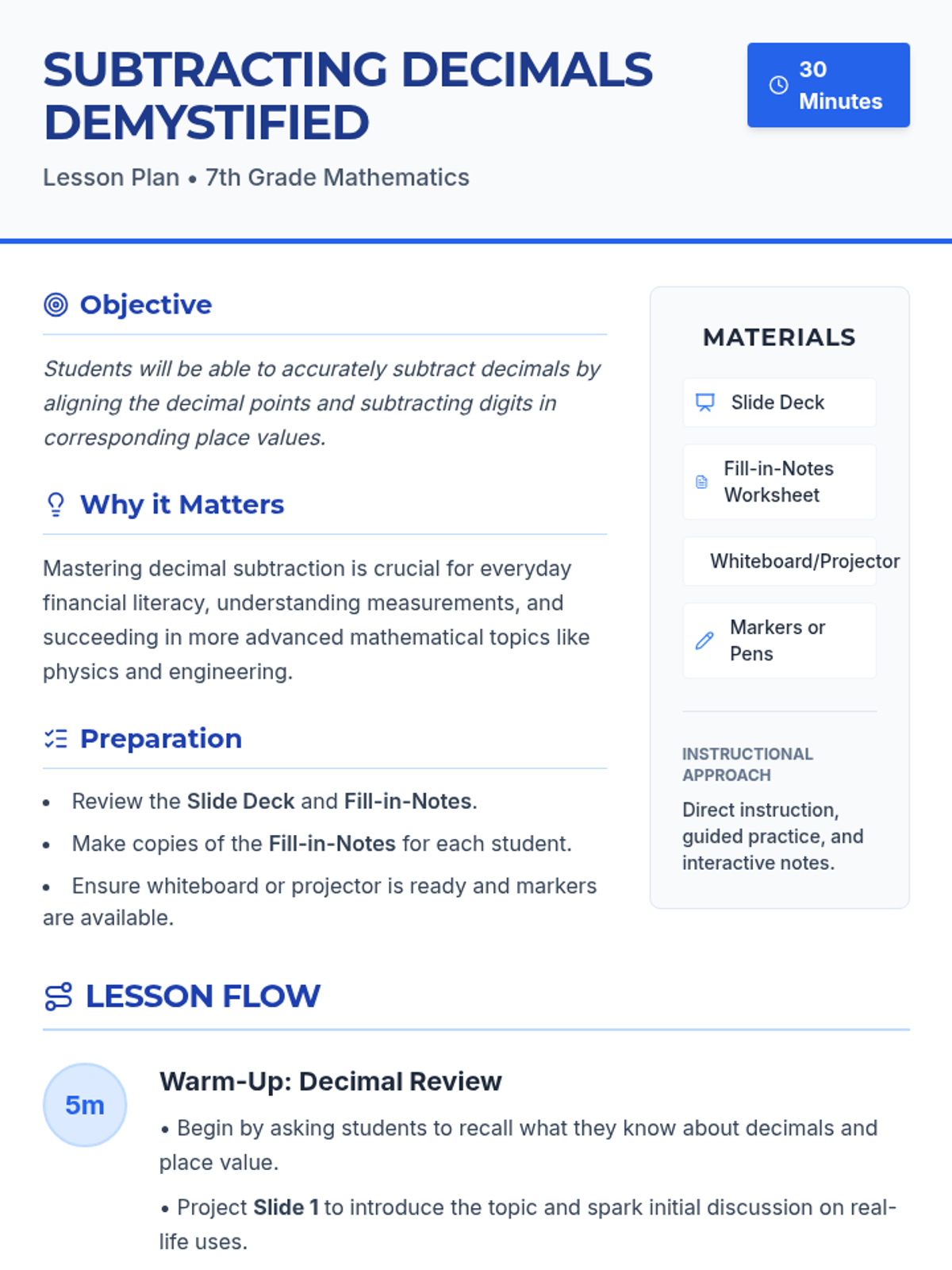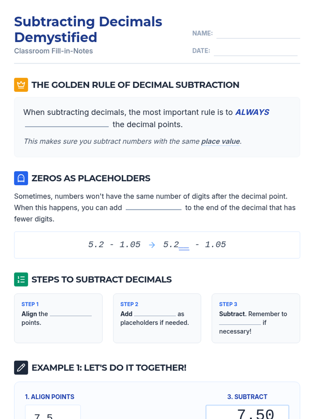 A 30-minute introductory session for 7th graders focusing on the precision of aligning decimal points and using placeholders for accurate subtraction.