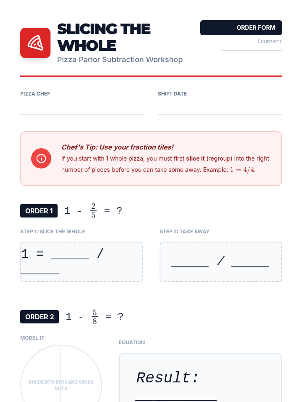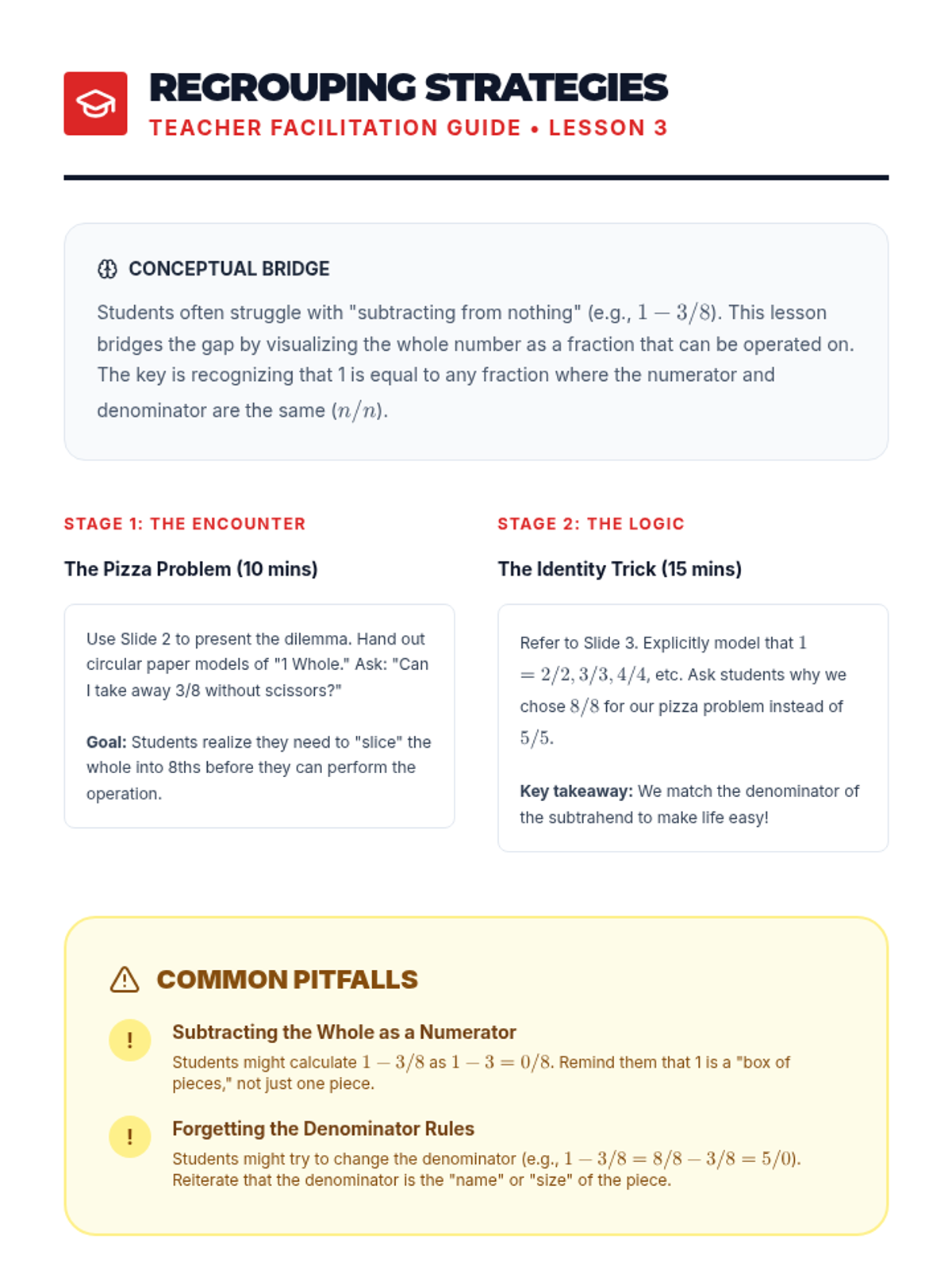 Focusing on subtraction, students learn to decompose a whole number into a fraction to solve problems (e.g., 1 - 2/5 = 5/5 - 2/5). Manipulative models help students visualize the "regrouping" of wholes.
