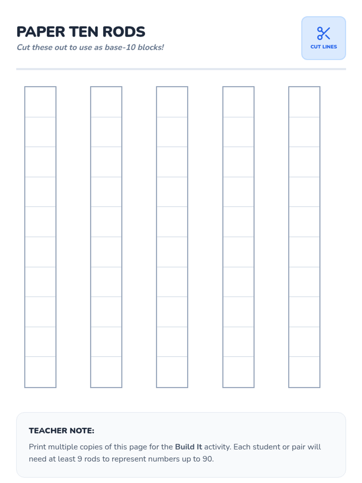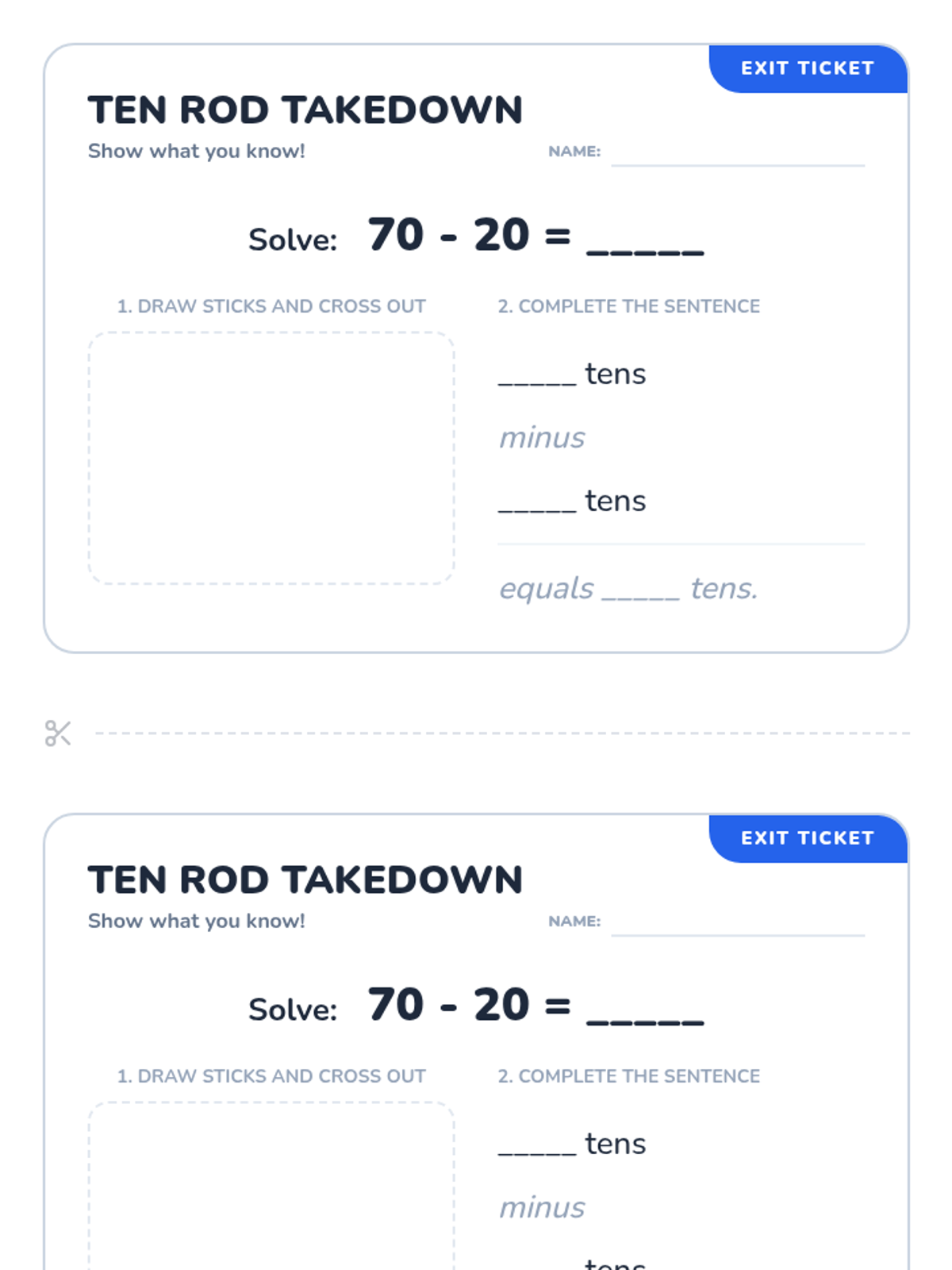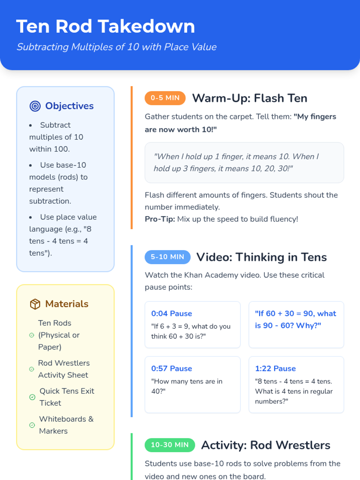 Students learn to subtract multiples of 10 by thinking in 'tens' and using base-10 rods as concrete models, transitioning from physical manipulation to drawing and place value language.