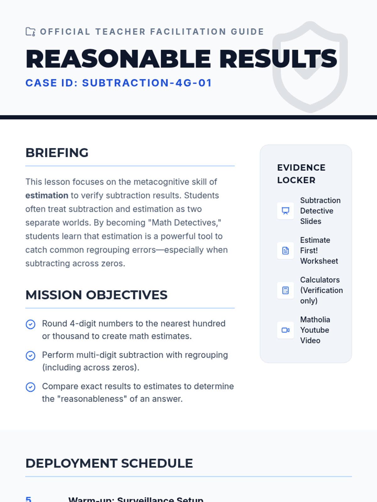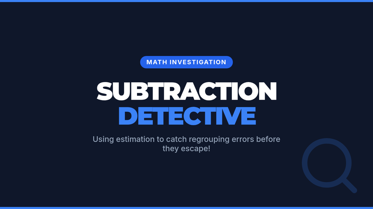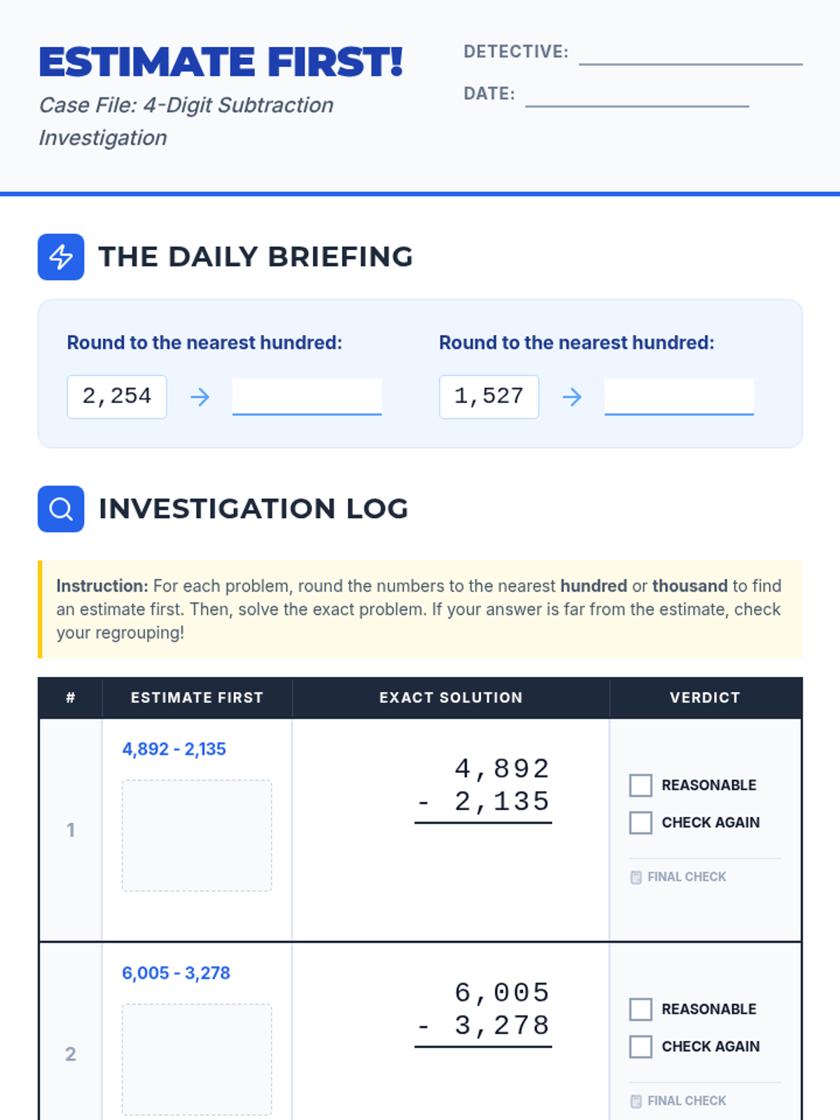 Students investigate subtraction problems by using rounding and estimation to catch regrouping errors, focusing on 4-digit numbers and subtracting across zeros.