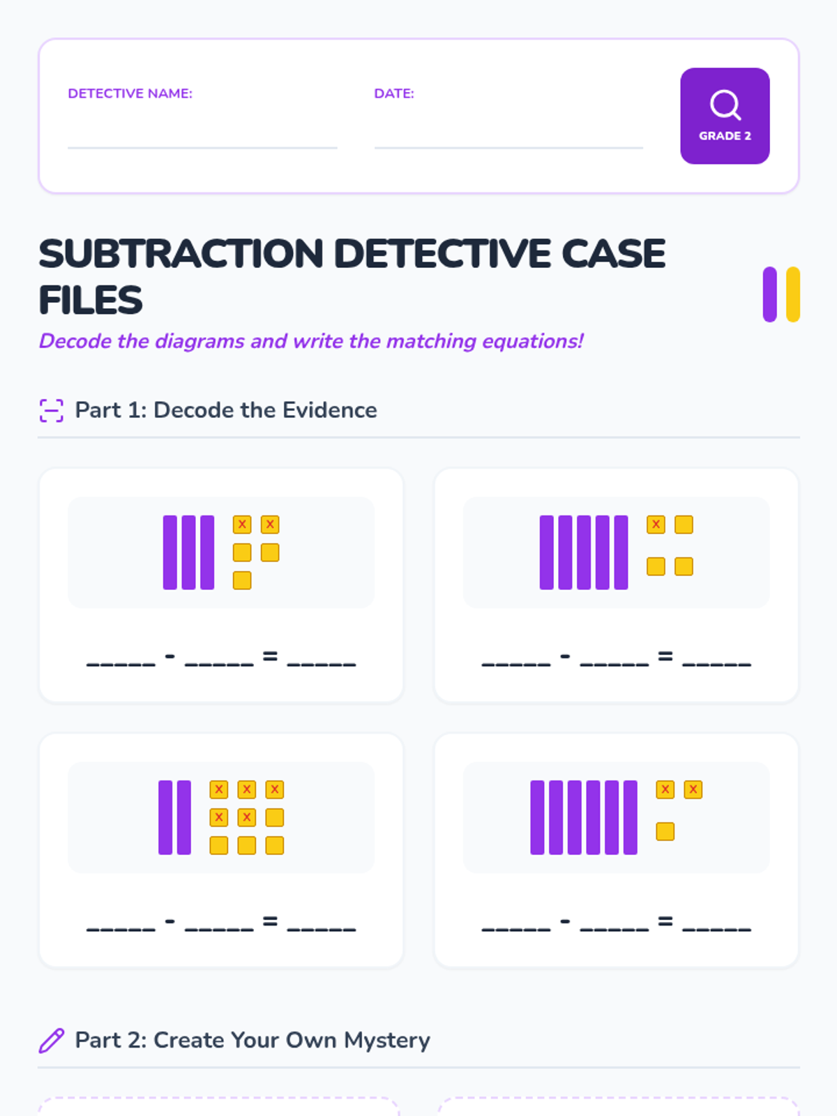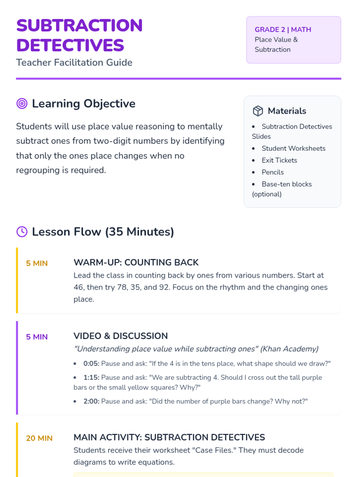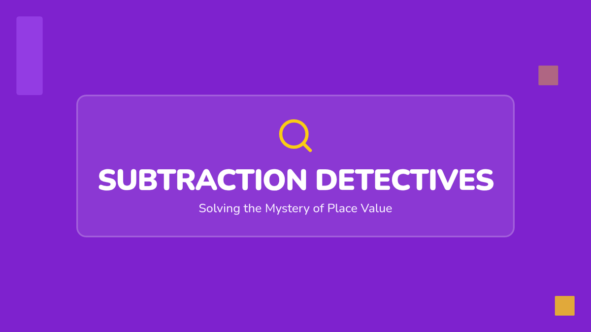 A 2nd-grade math lesson focused on subtracting ones from two-digit numbers using place value reasoning and base-ten models. Students act as 'Subtraction Detectives' to decode and create visual math problems.