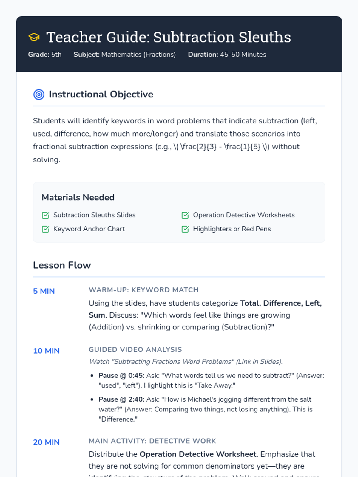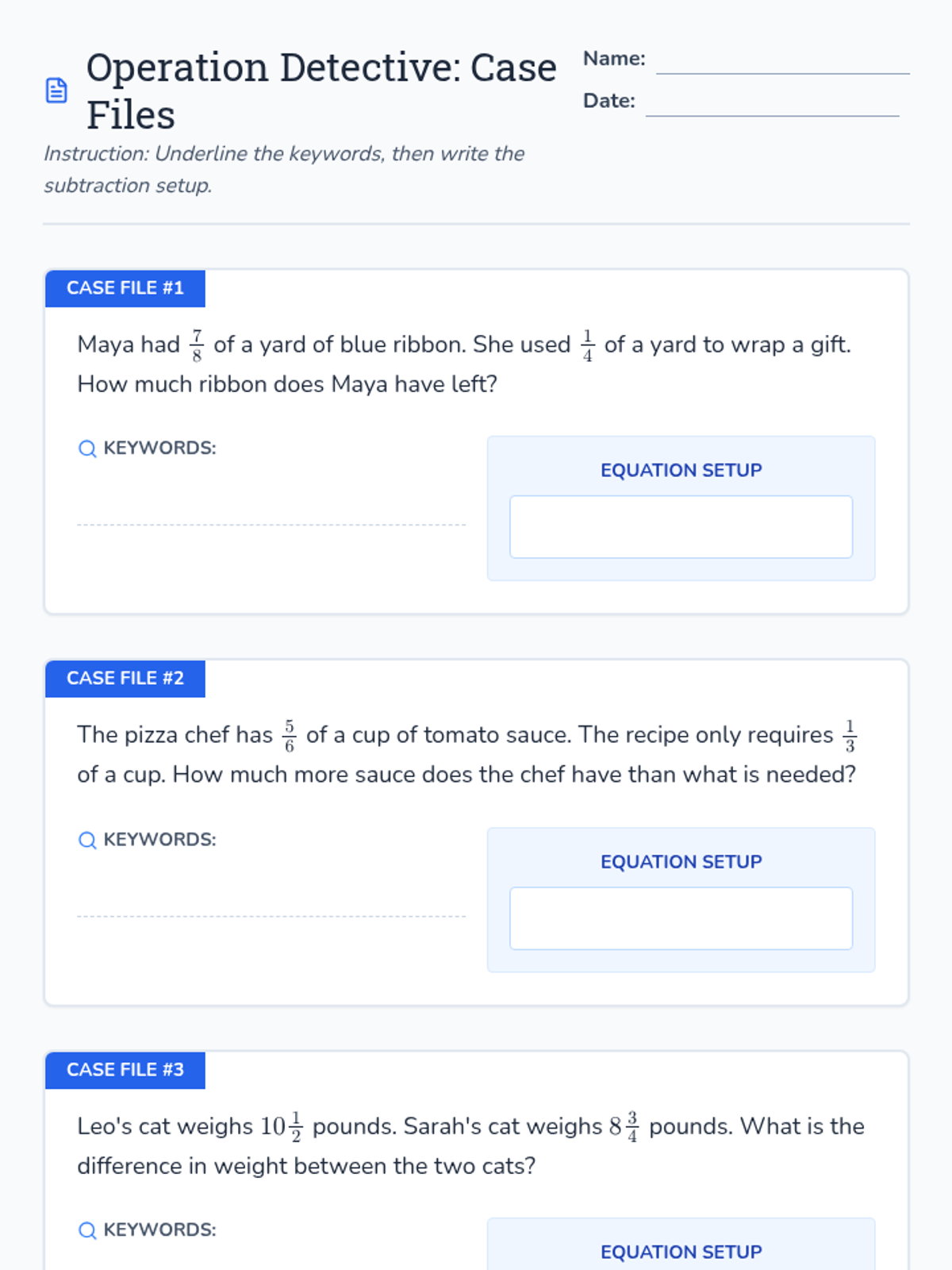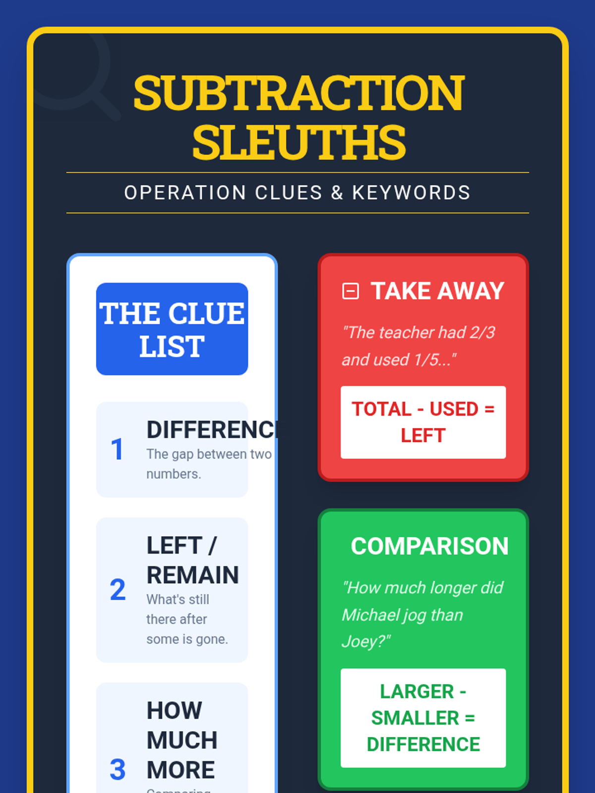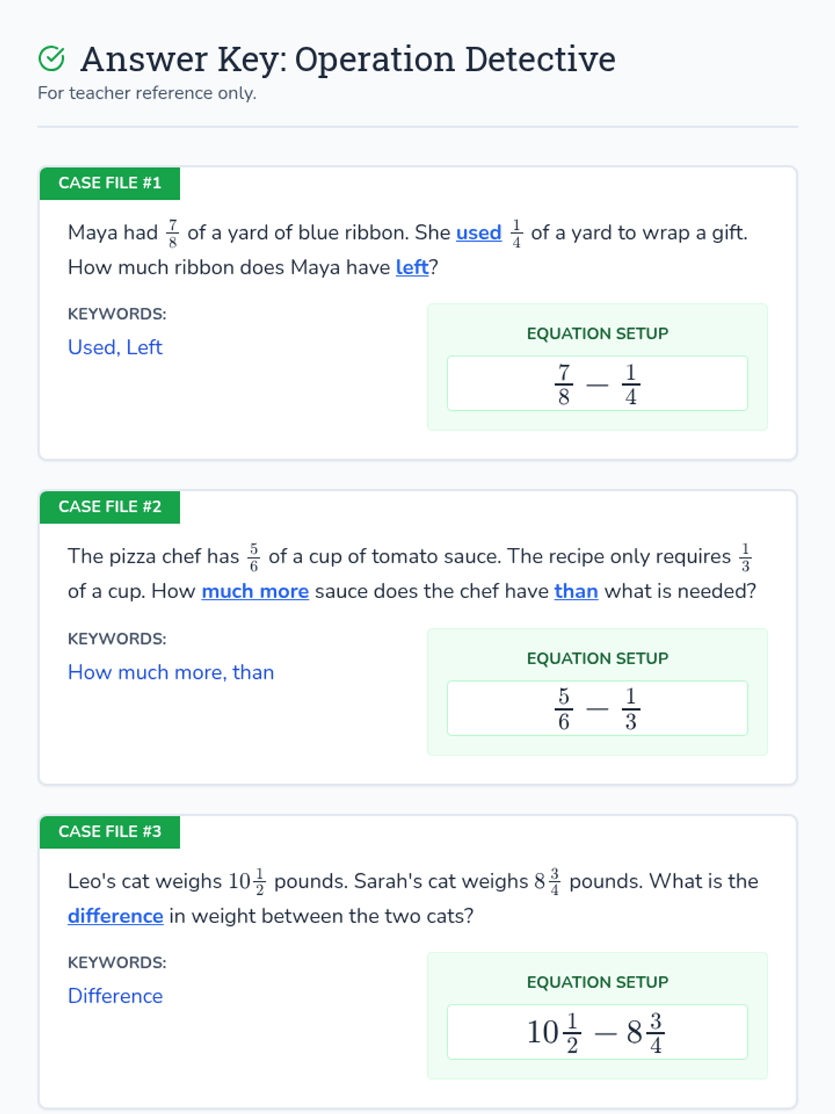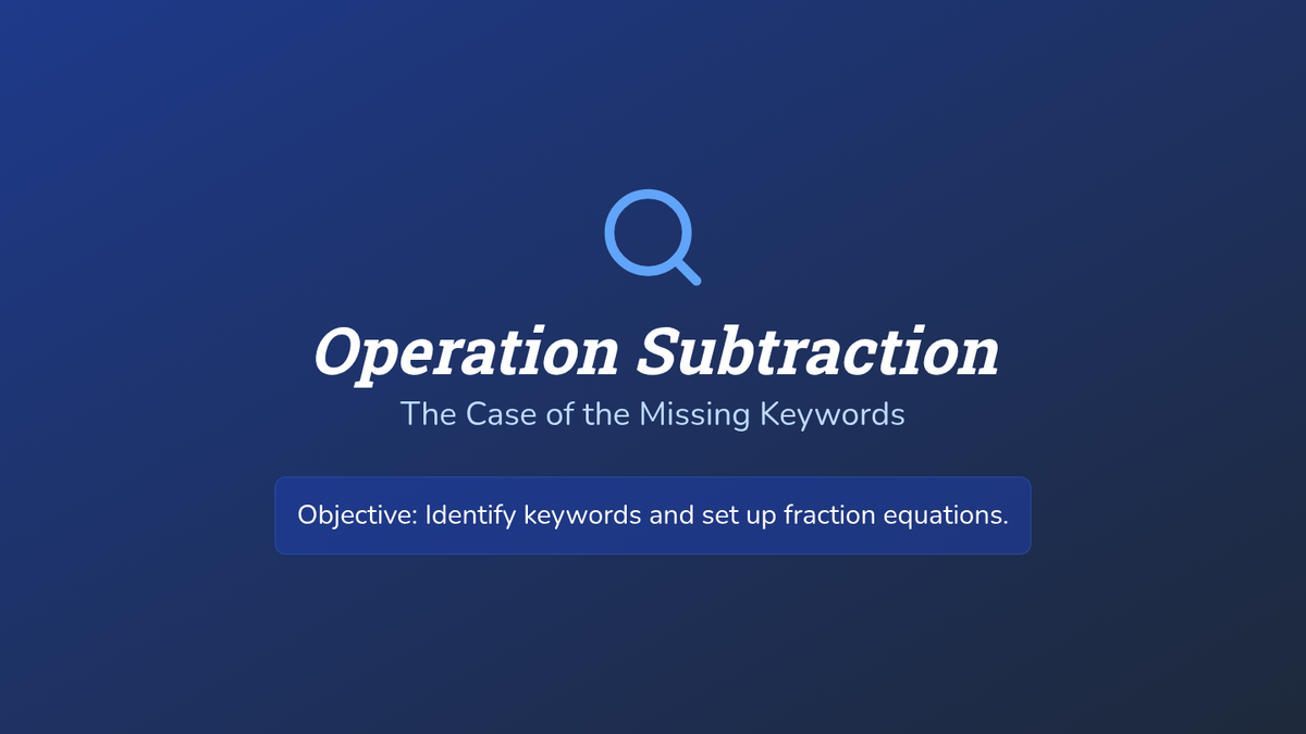 Students become 'Operation Detectives' to identify subtraction keywords in fraction word problems, comparing 'take-away' scenarios with 'comparison' scenarios.