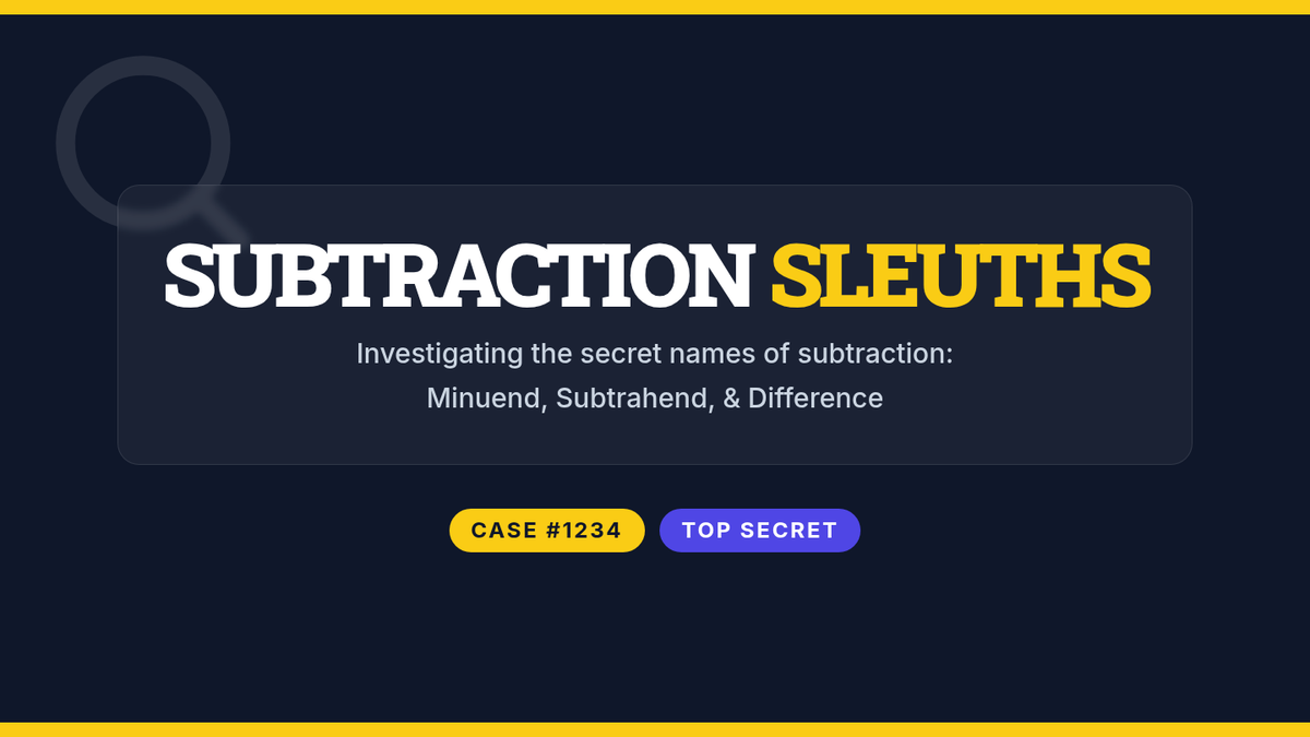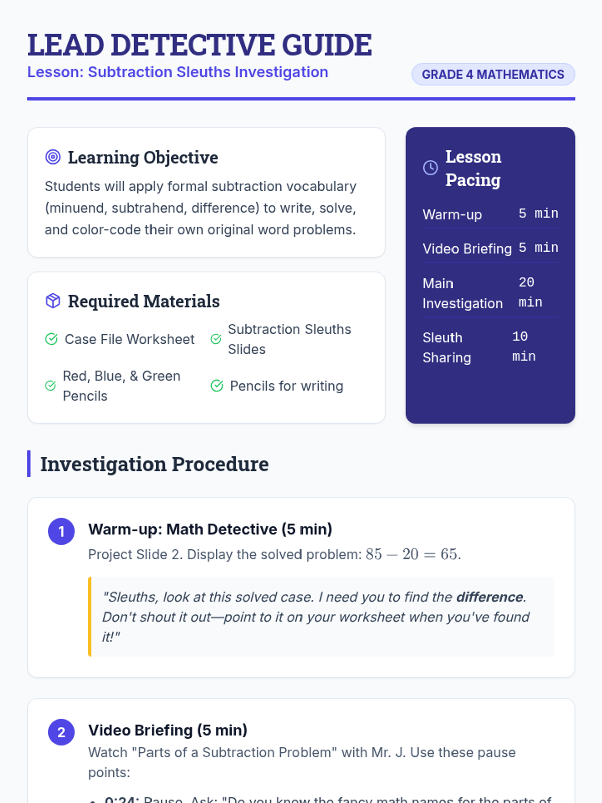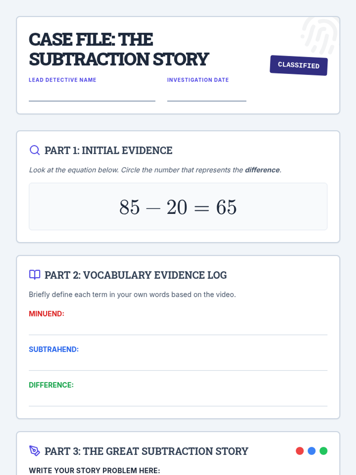 A detective-themed lesson where students investigate subtraction vocabulary (minuend, subtrahend, and difference) and apply their knowledge by writing original word problems.