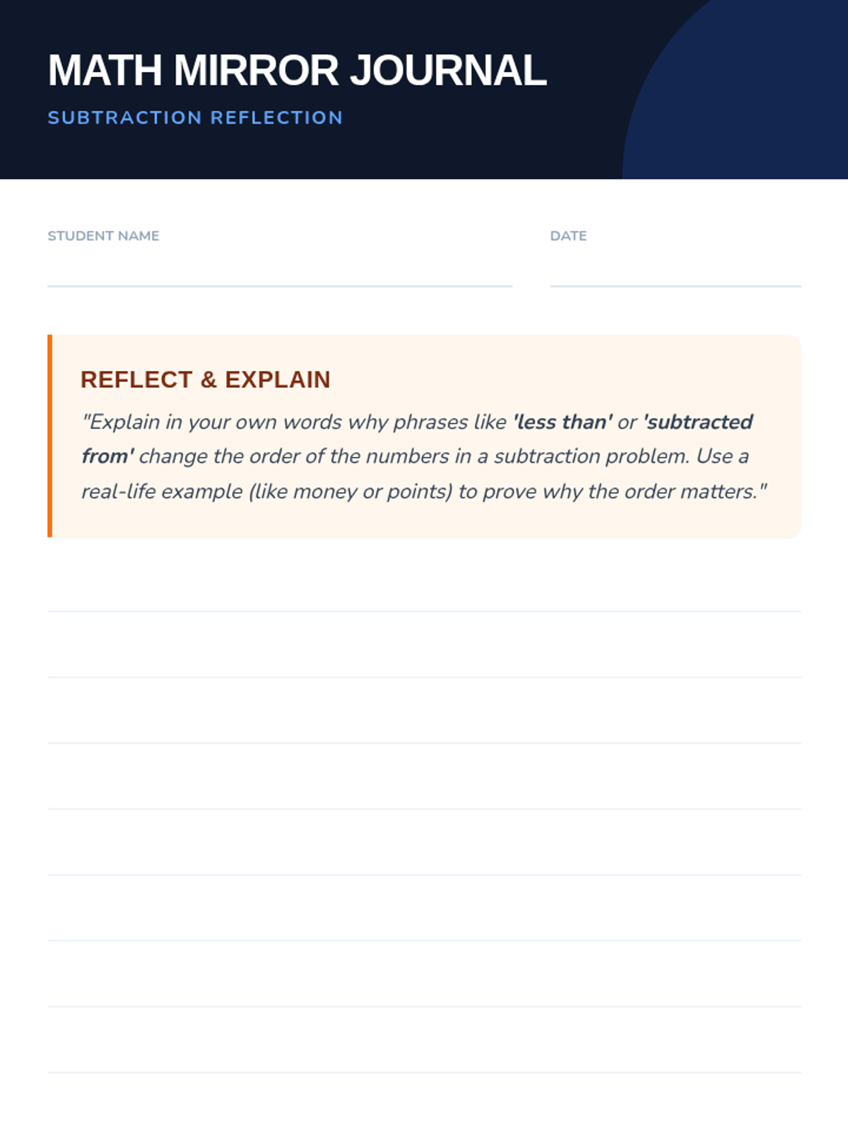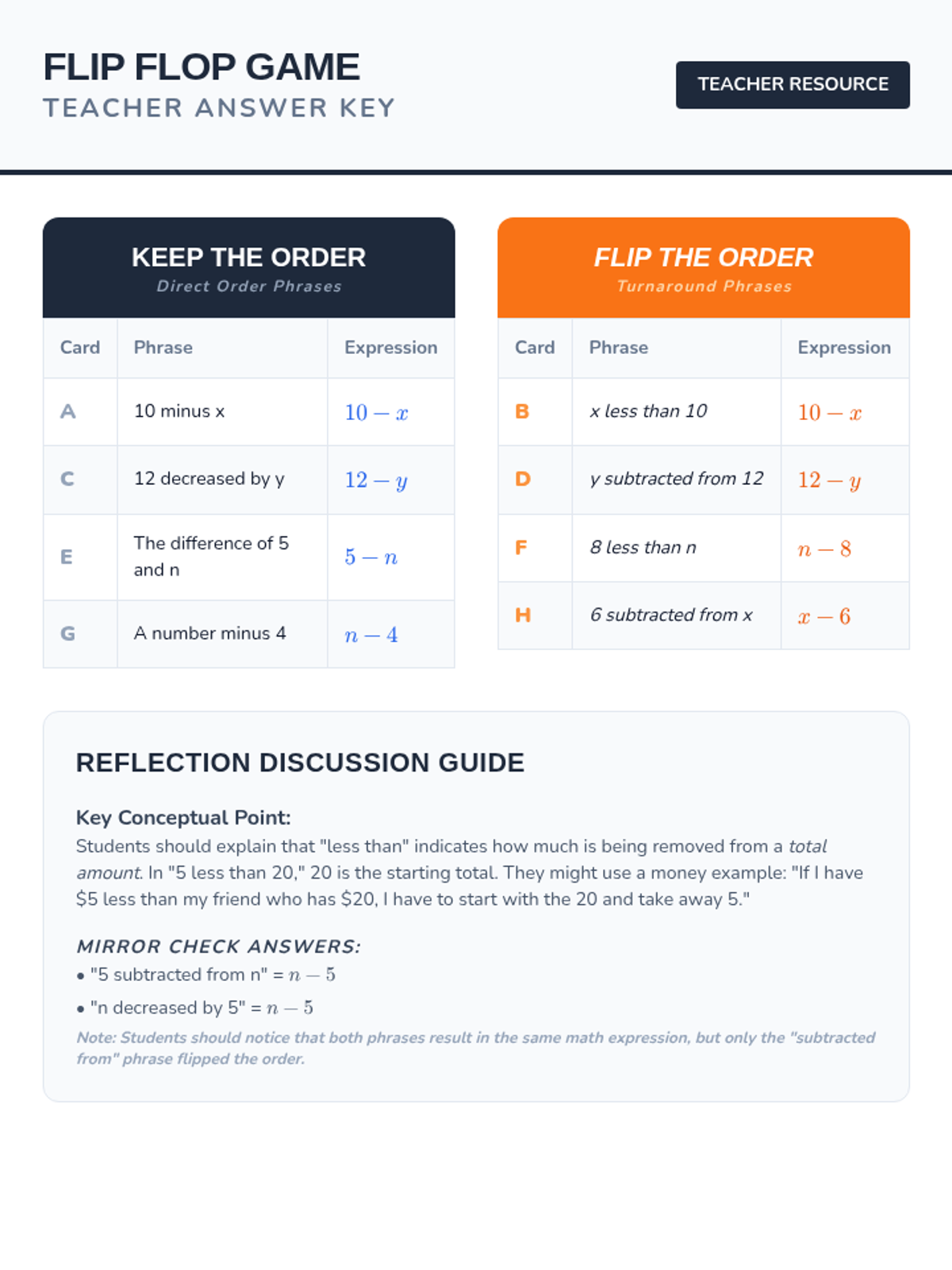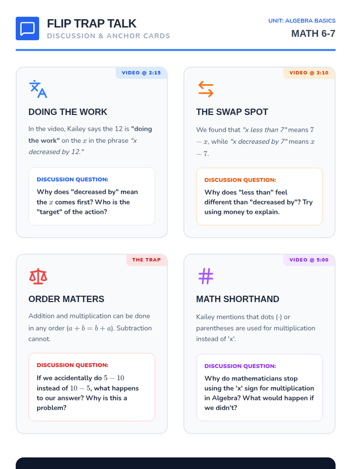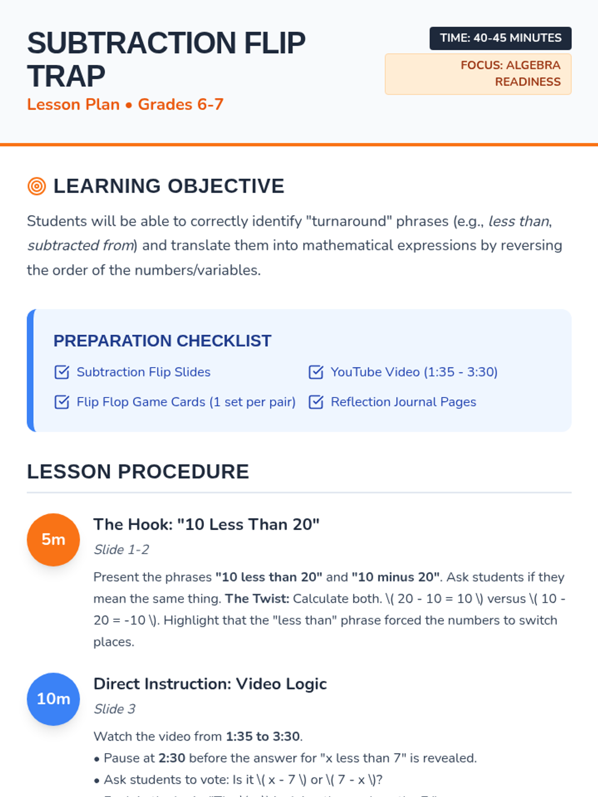 A focused math lesson for 6th-7th graders on the 'turnaround rule' for subtraction phrases like 'less than' and 'subtracted from.' Includes a hook, video analysis, sorting activity, and reflection.