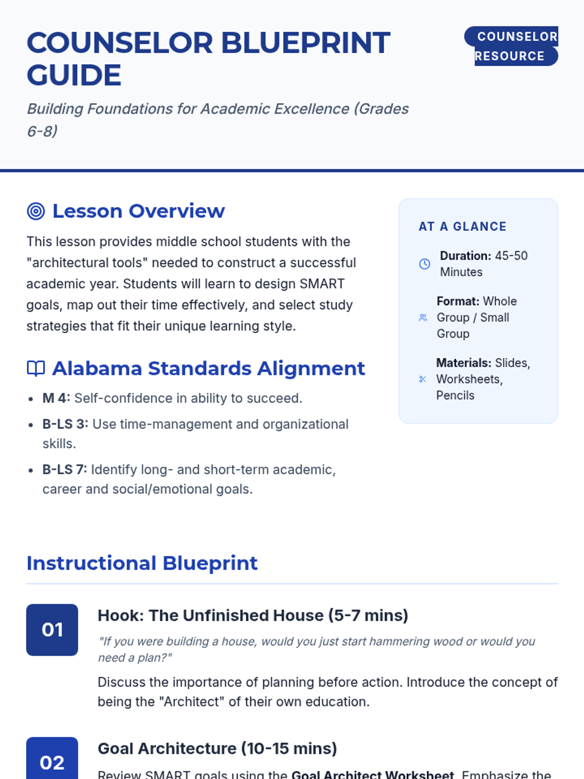 A comprehensive middle school counseling lesson focused on developing SMART goals, mastering time management, and implementing effective study habits, aligned with Alabama school counseling standards.