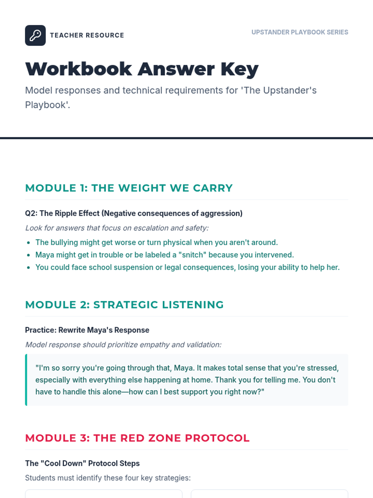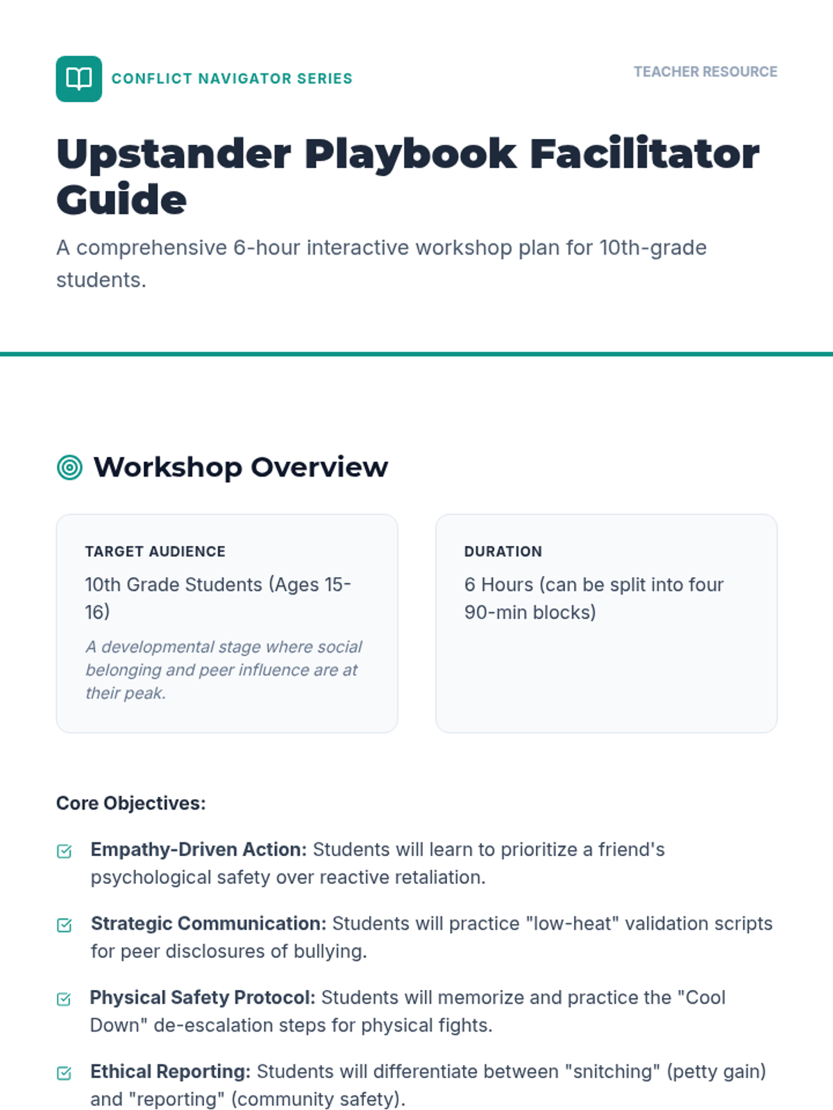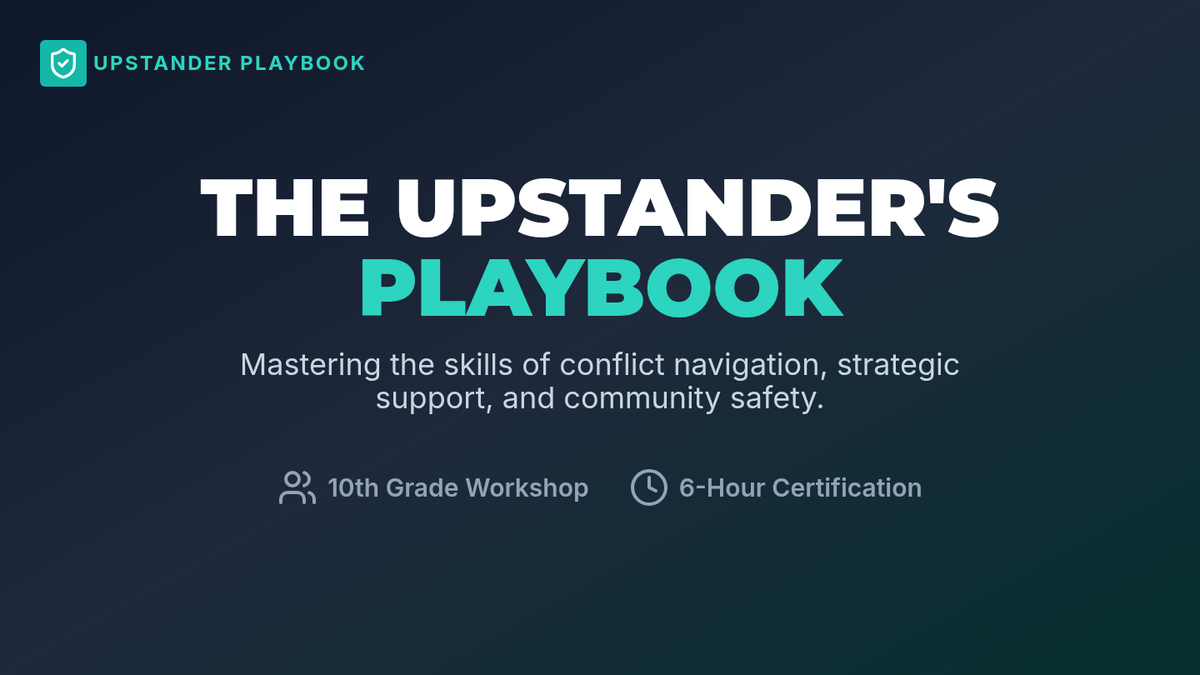 A comprehensive 6-hour interactive program designed for 10th-grade students to master the skills of an 'upstander.' Students learn empathetic listening, strategic reporting, and de-escalation techniques for bullying and physical conflicts.