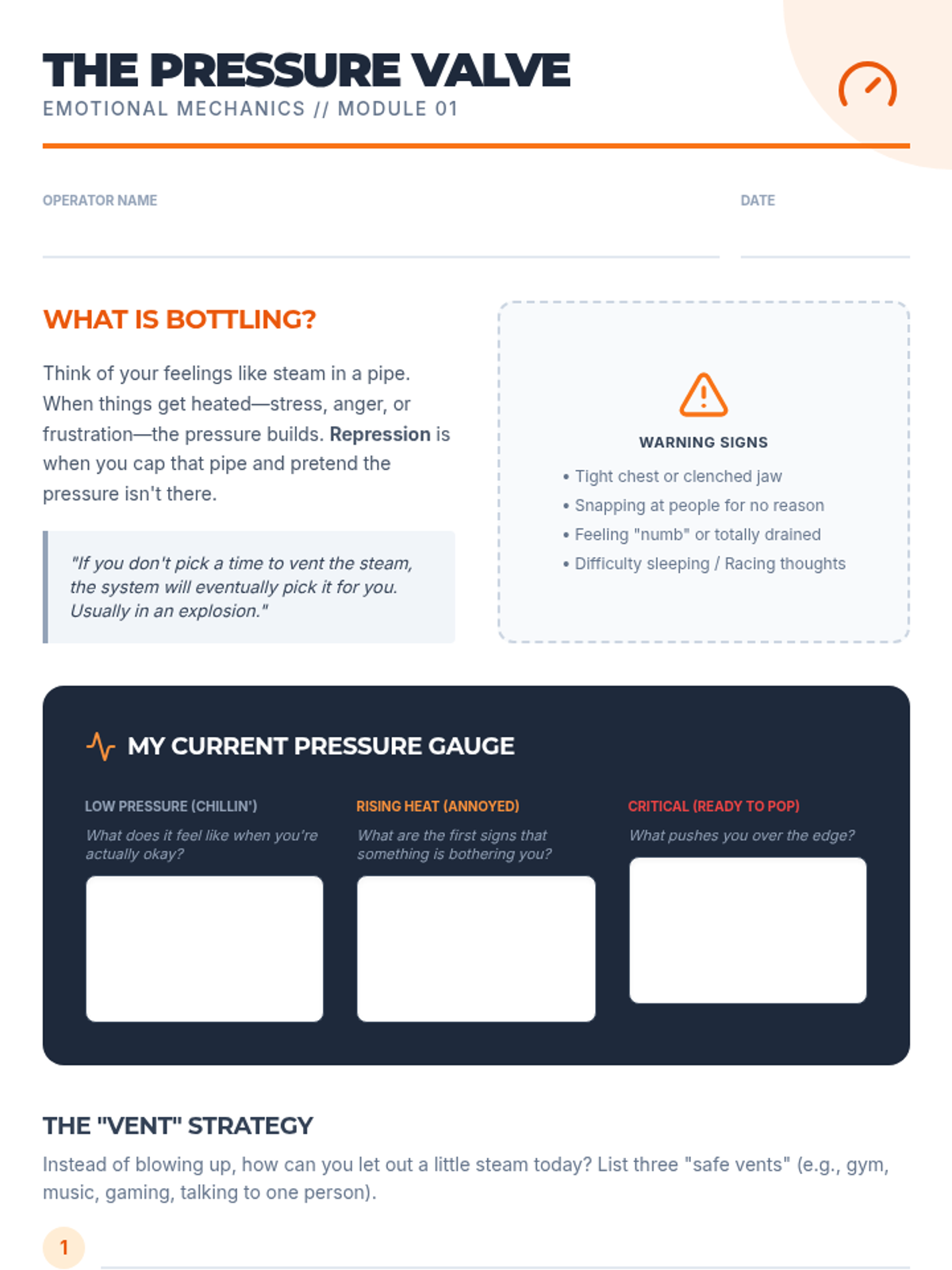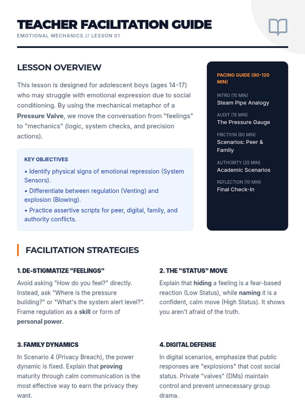 A lesson for adolescent boys on identifying emotional repression and practicing conflict resolution through the 'Pressure Valve' metaphor. Includes a student workbook and a teacher facilitation guide.