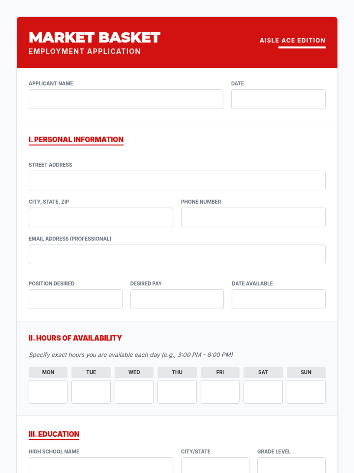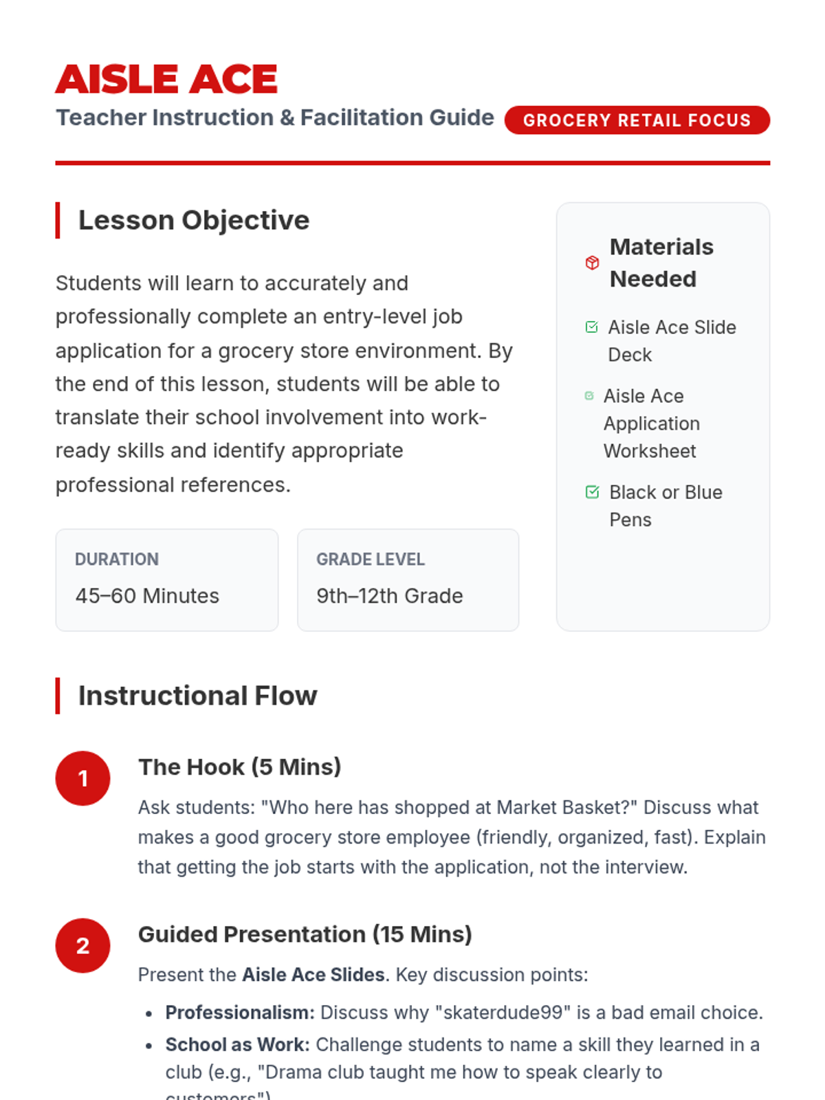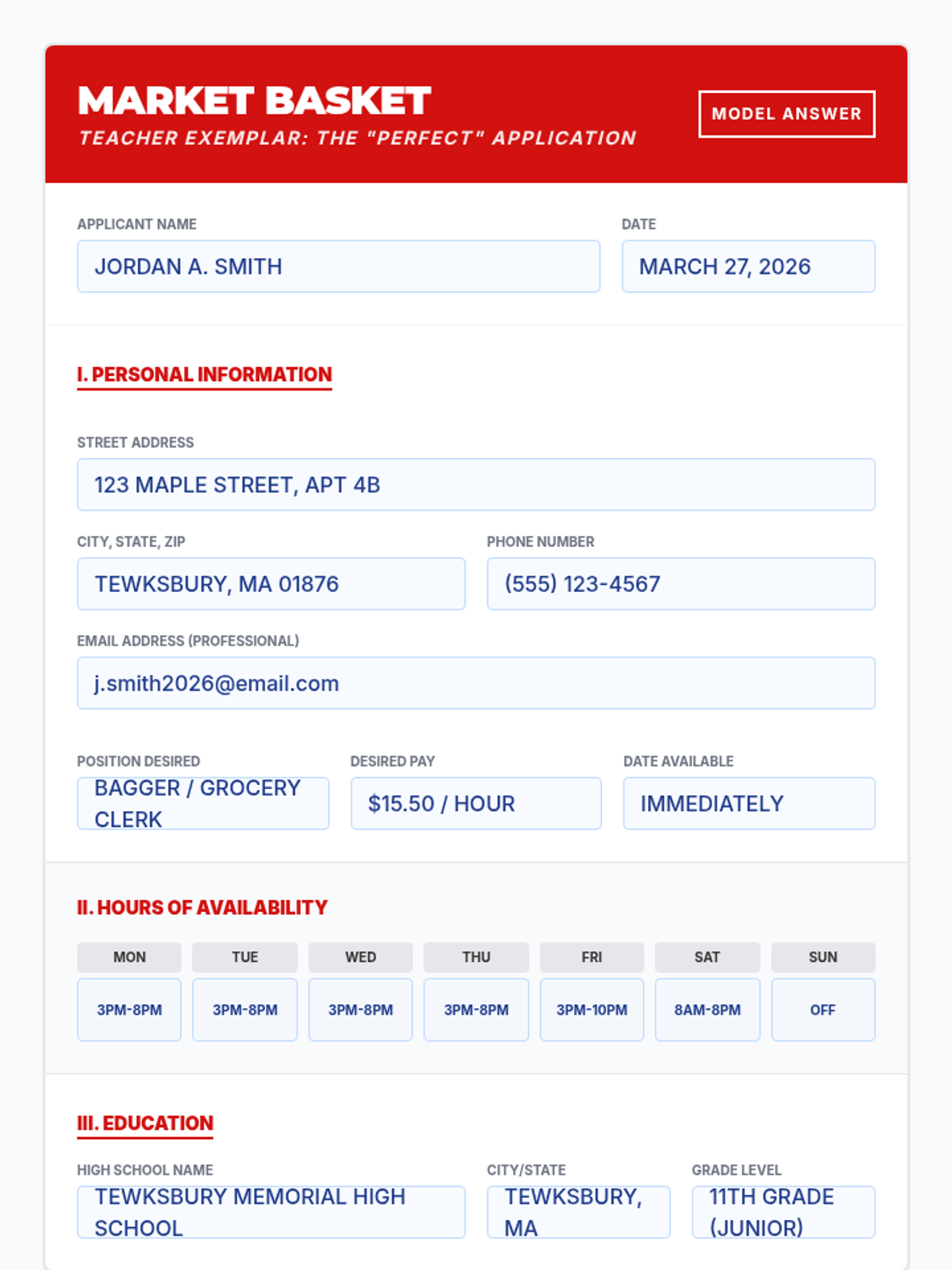 A comprehensive lesson teaching high school students how to accurately and professionally complete an entry-level job application, specifically tailored for a grocery store environment like Market Basket. Students will learn to translate school activities into relevant experience and select professional references.