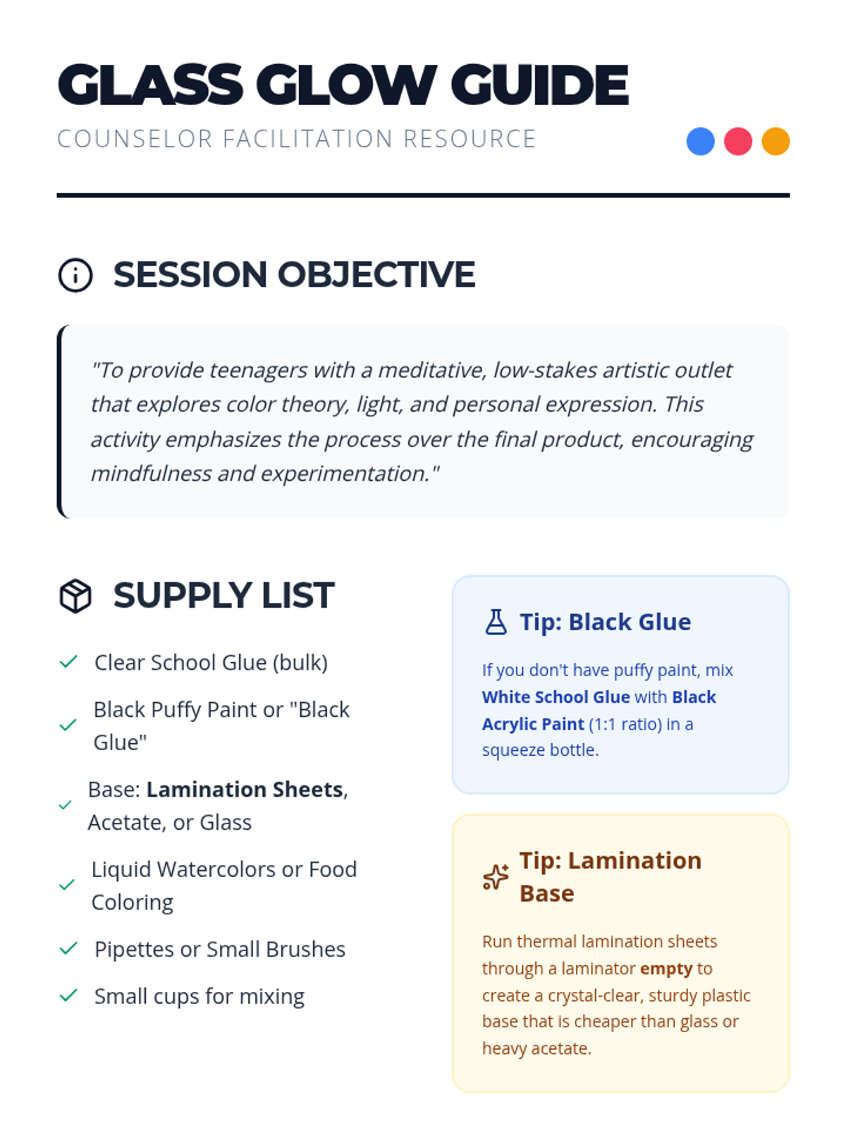 A counselor-led artistic expression session where teenagers create faux stained glass using simple materials. The activity focuses on mindfulness, color theory, and personal expression through light and color.