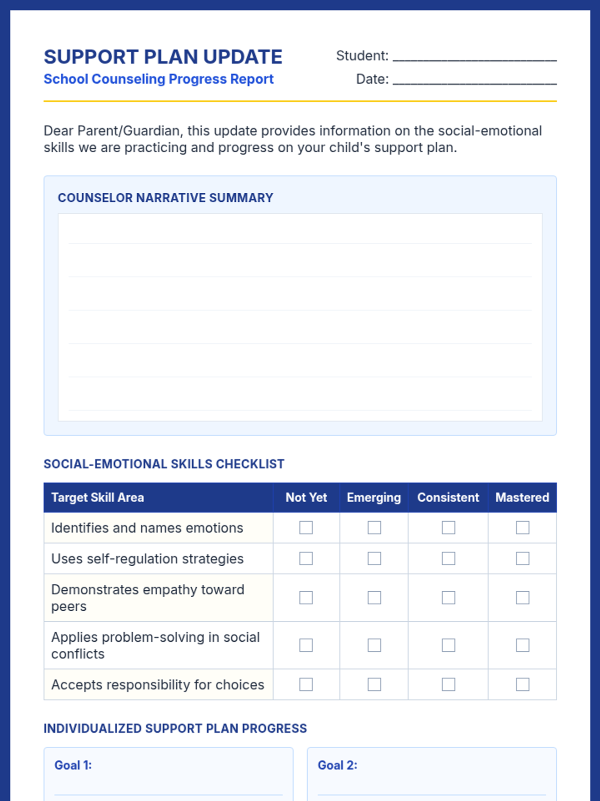 A set of tools for school counselors to effectively communicate student social-emotional progress with families, ensuring a collaborative approach to support.