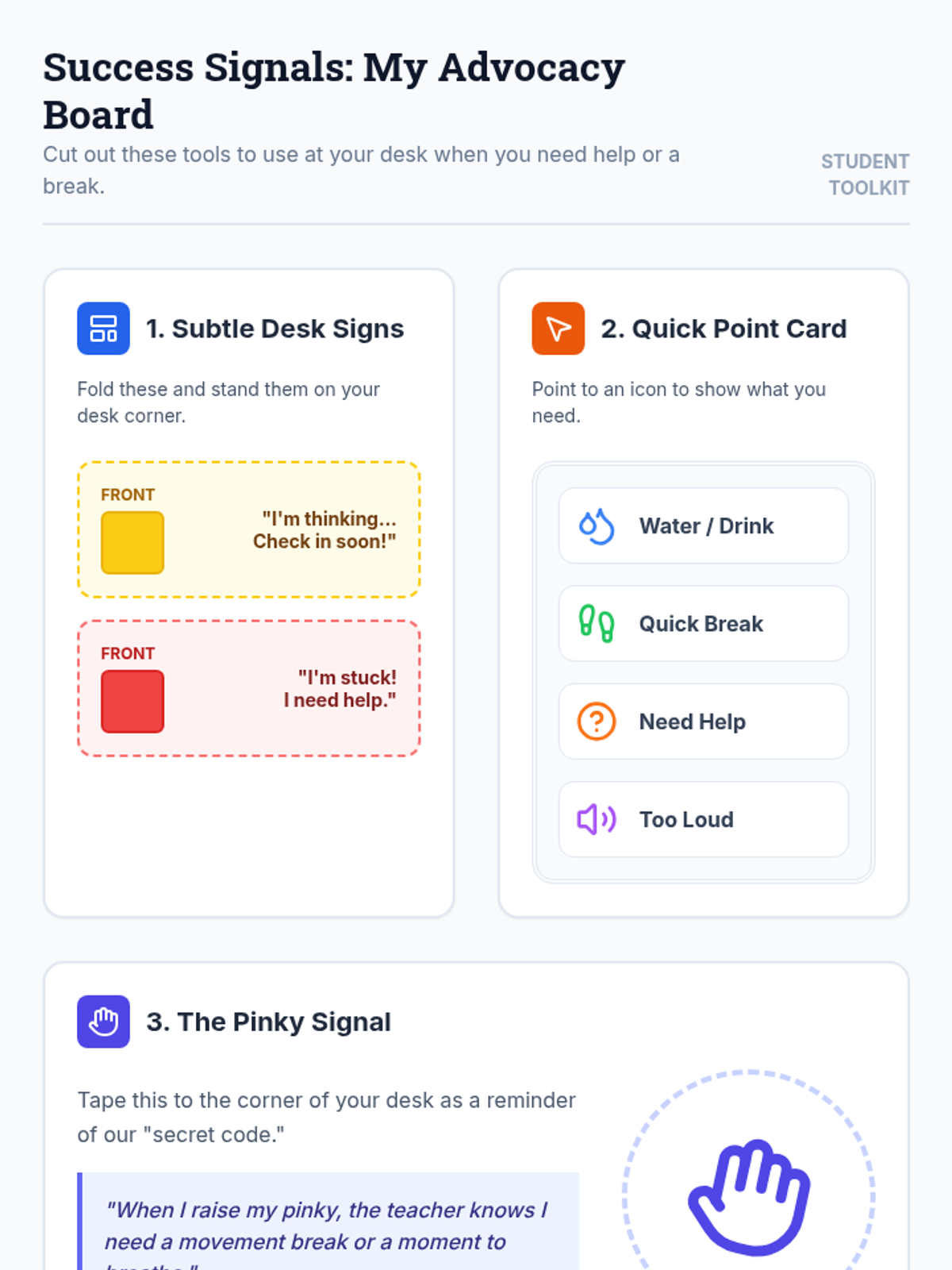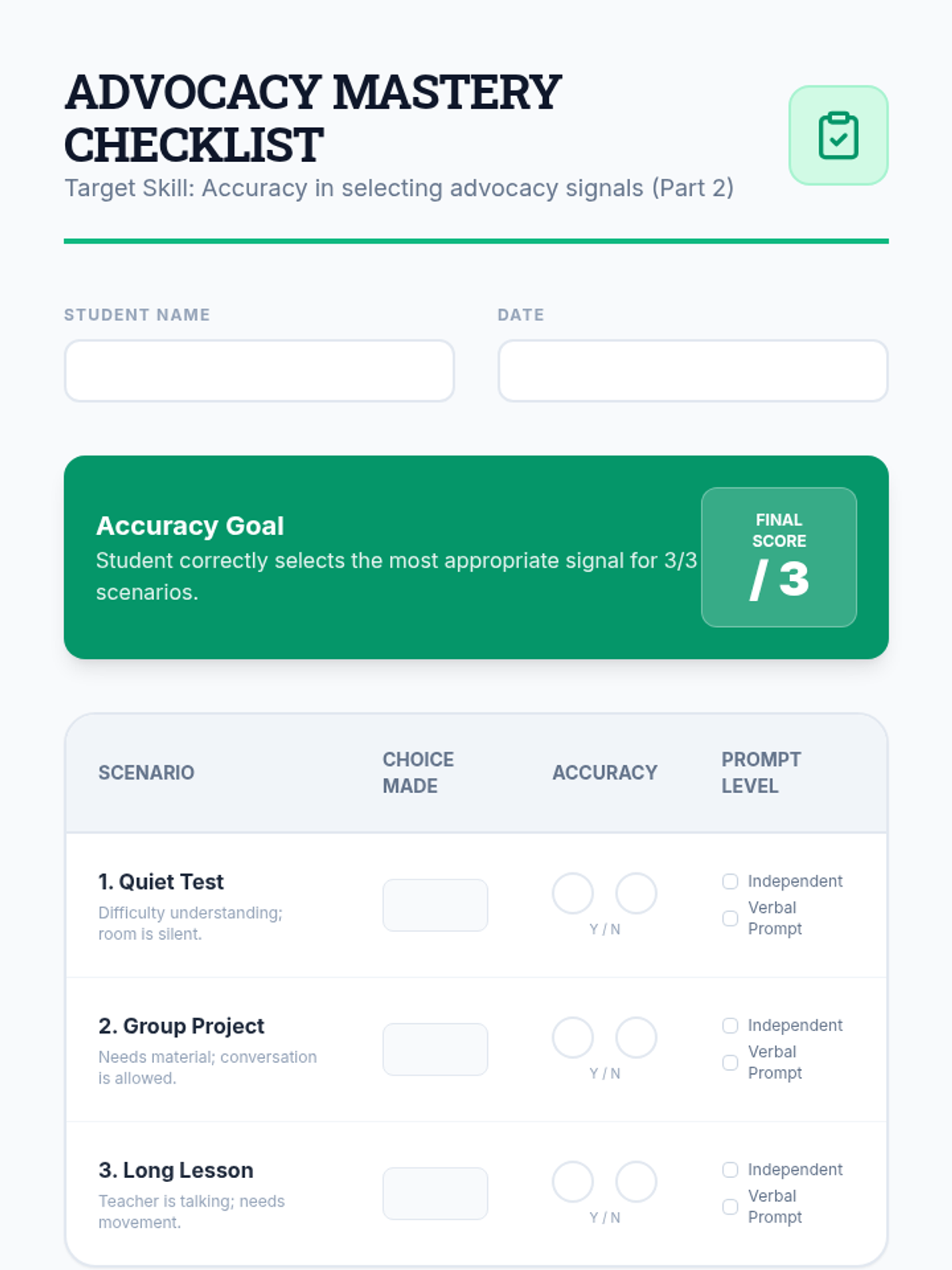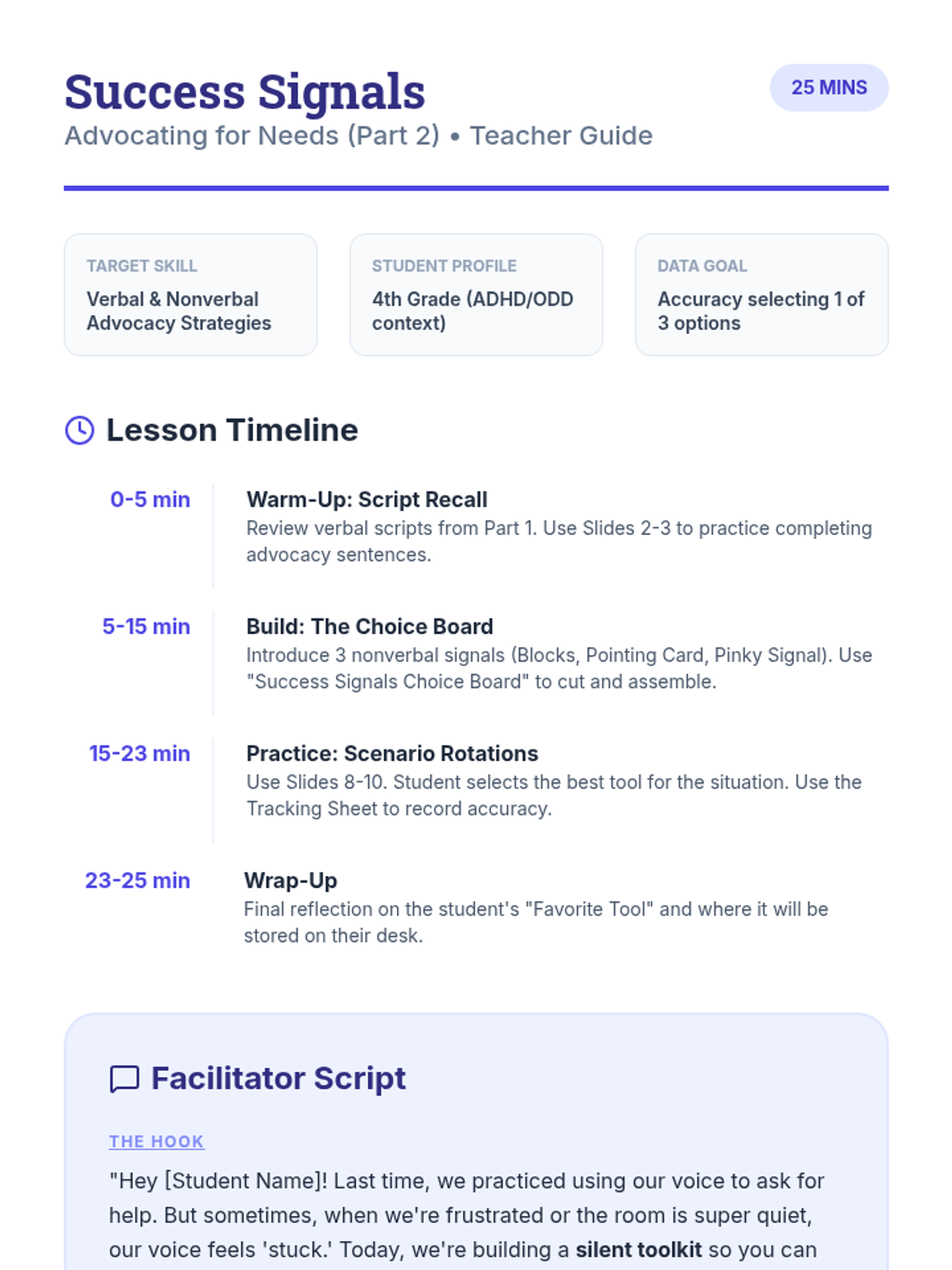 A 25-minute lesson focused on mastering verbal and nonverbal advocacy strategies, specifically building a choice board of signals and practicing their use in varied school scenarios.