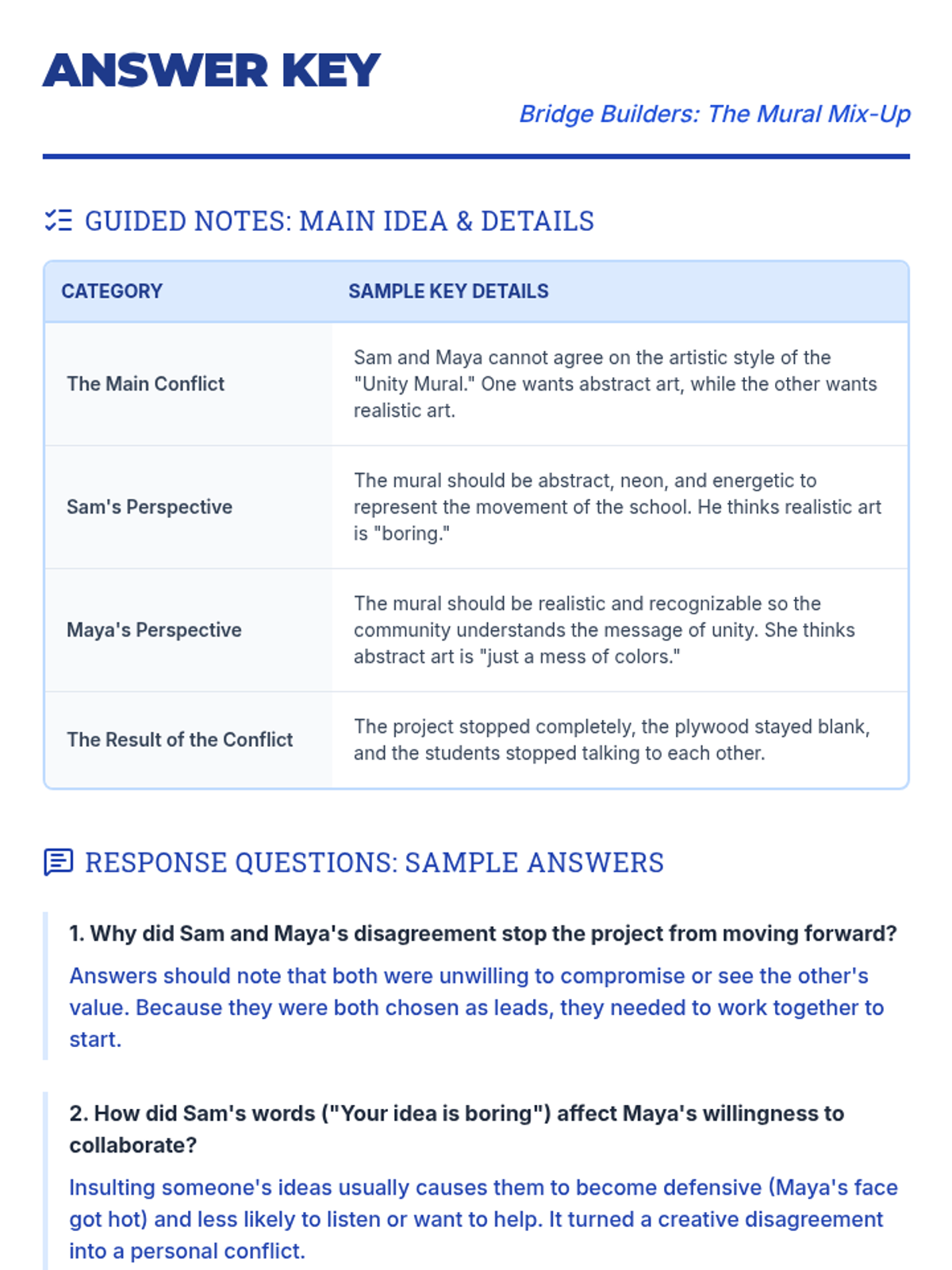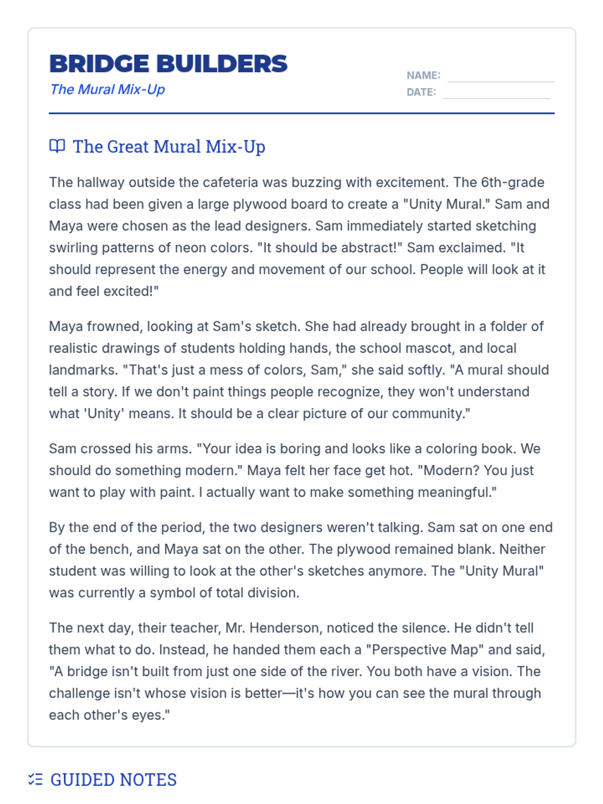 A 6th-grade SEL lesson focused on conflict resolution and perspective taking through a realistic story about collaboration and compromise.
