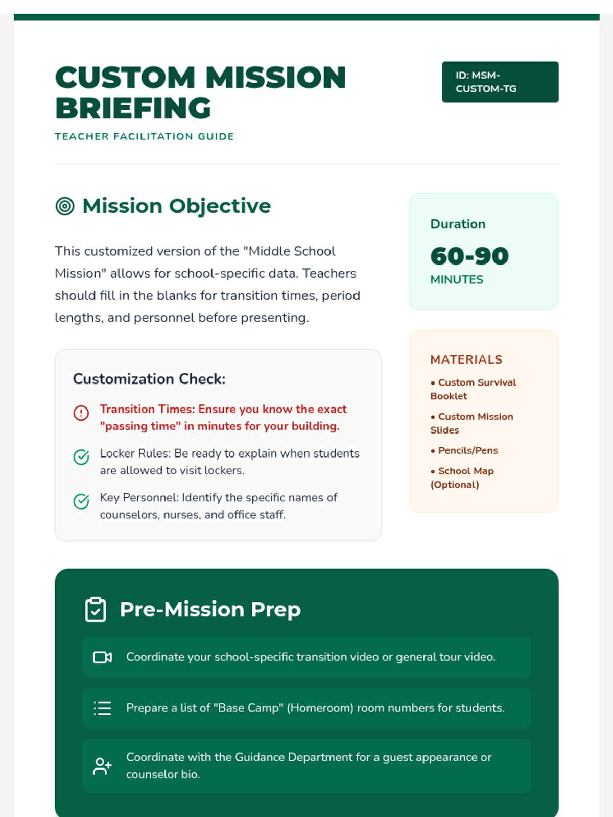 A customizable version of the Middle School Mission lesson, featuring blank fields for specific transition times, locker rules, and school-specific personnel.