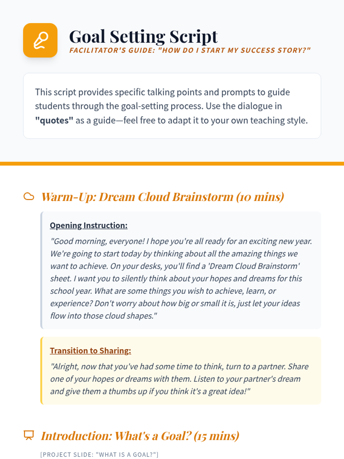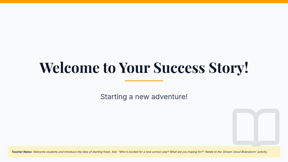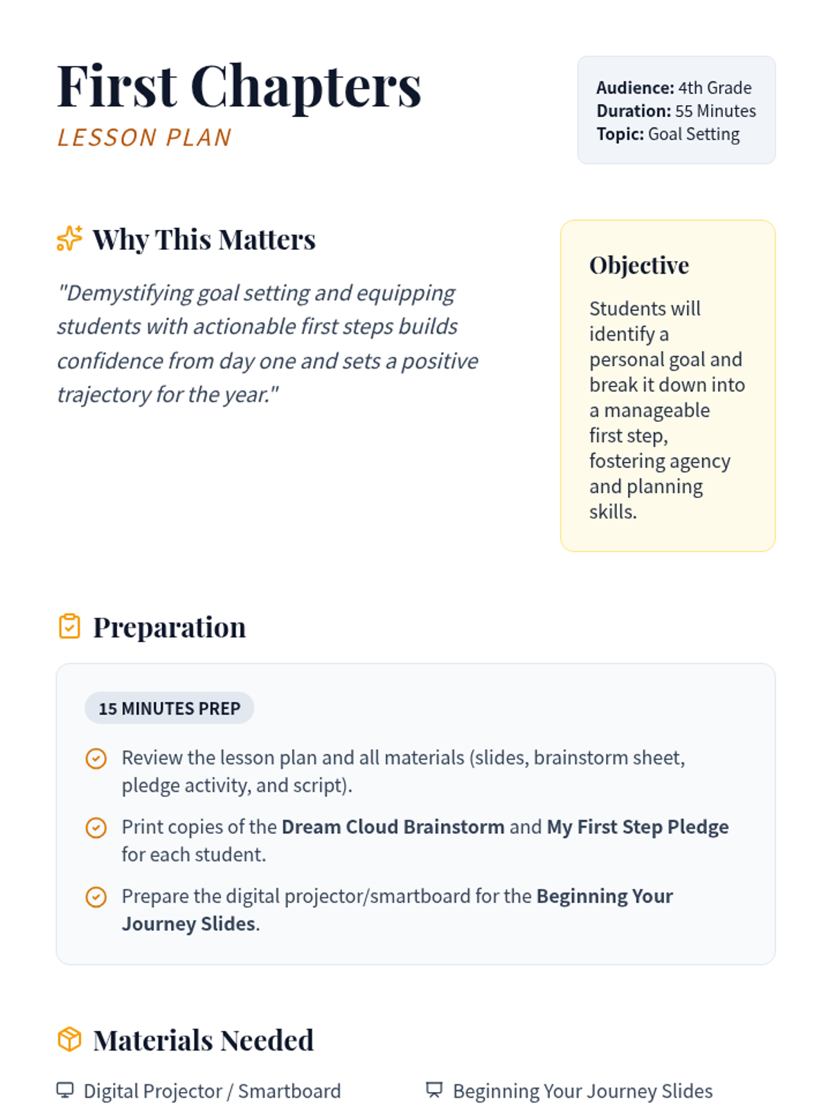 A 4th-grade lesson that demystifies goal setting by helping students identify personal goals and break them down into actionable first steps, themed around 'writing your own success story'.
