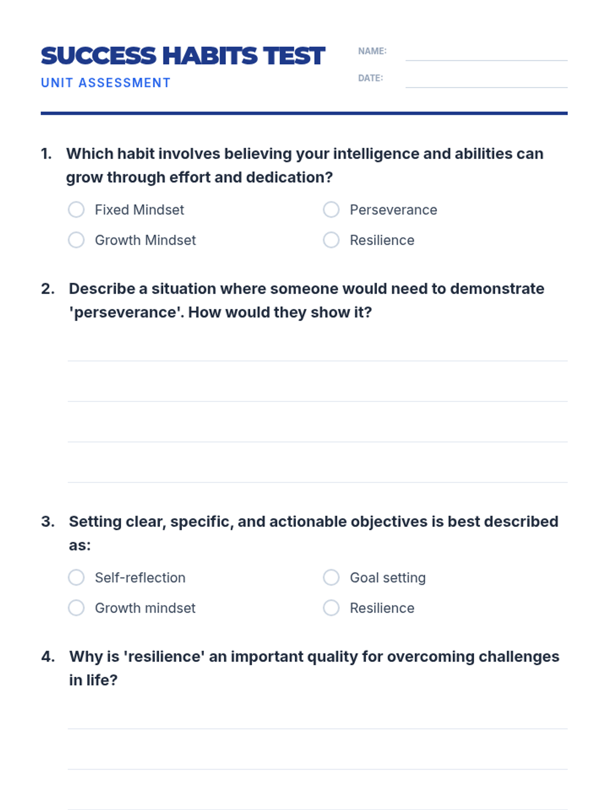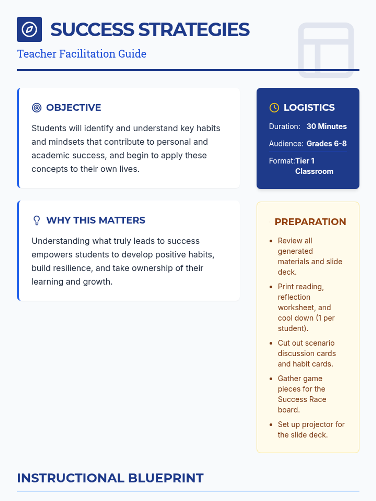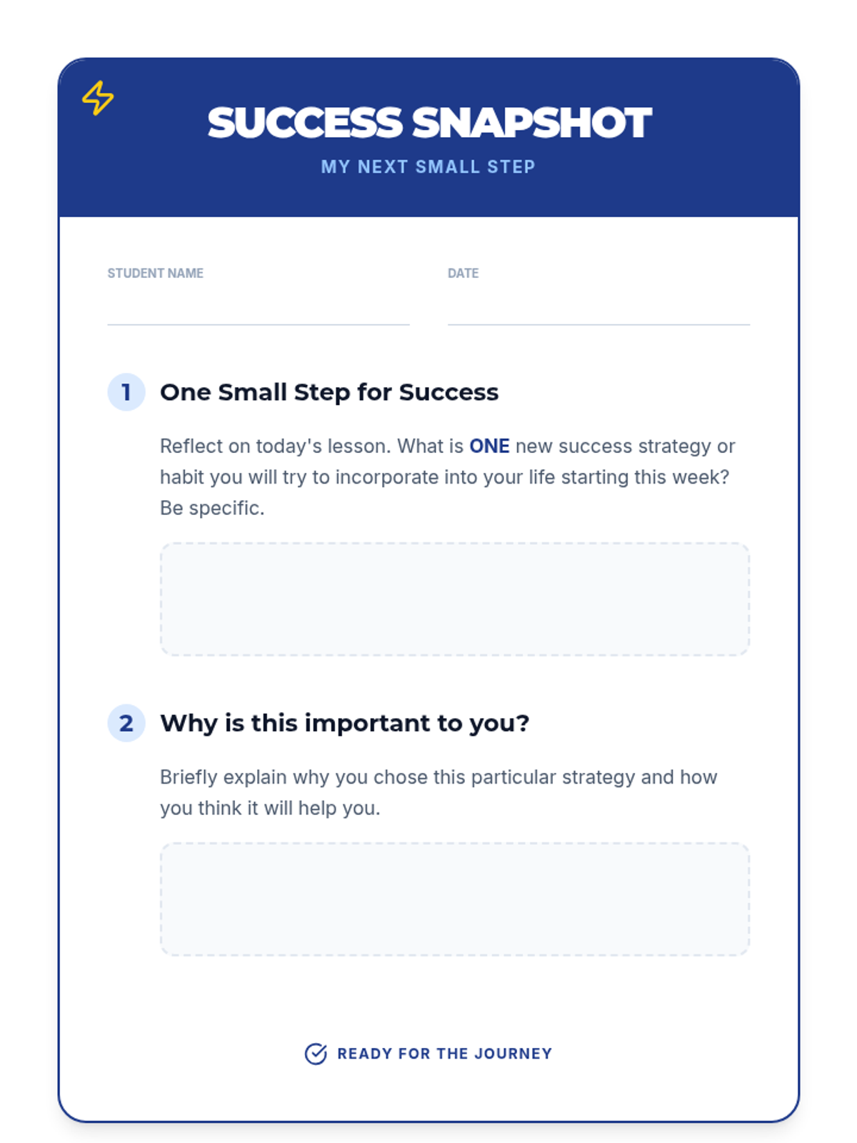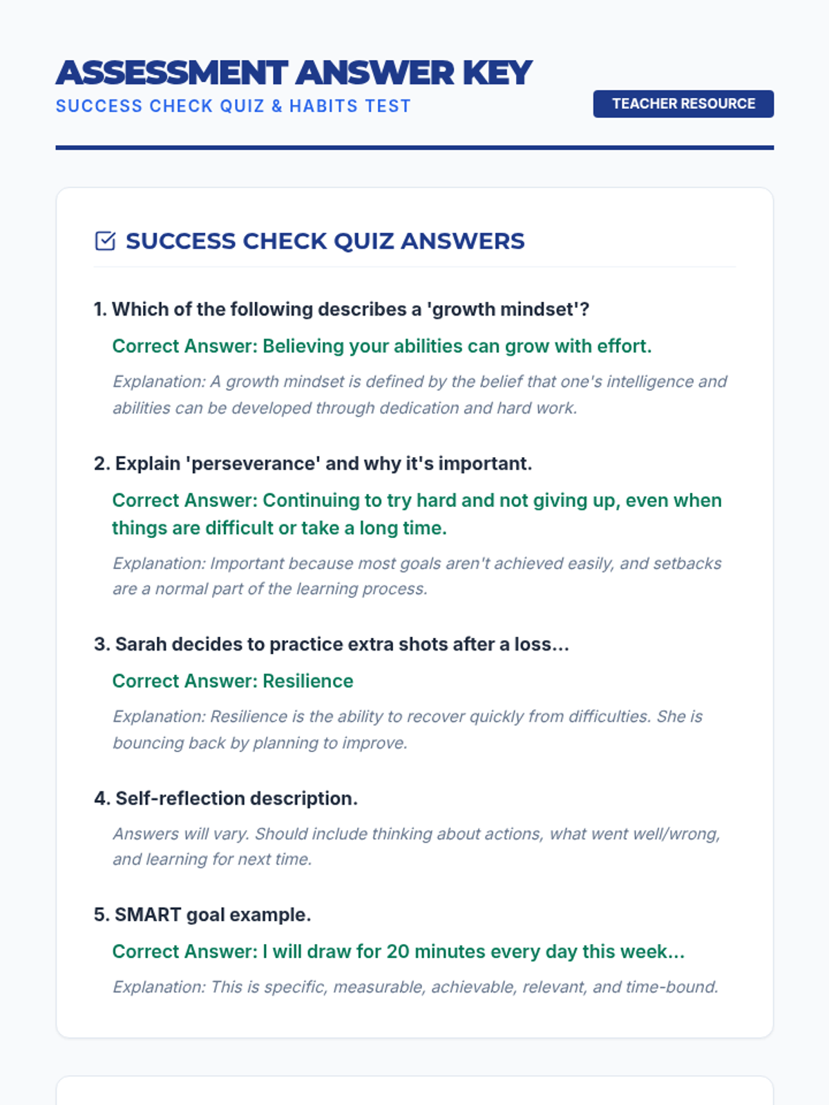 A middle school lesson exploring growth mindset, perseverance, goal setting, resilience, and self-reflection to empower students with actionable success strategies.