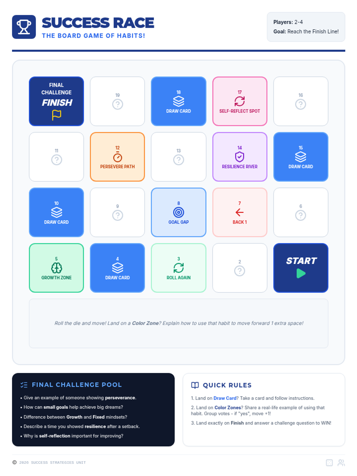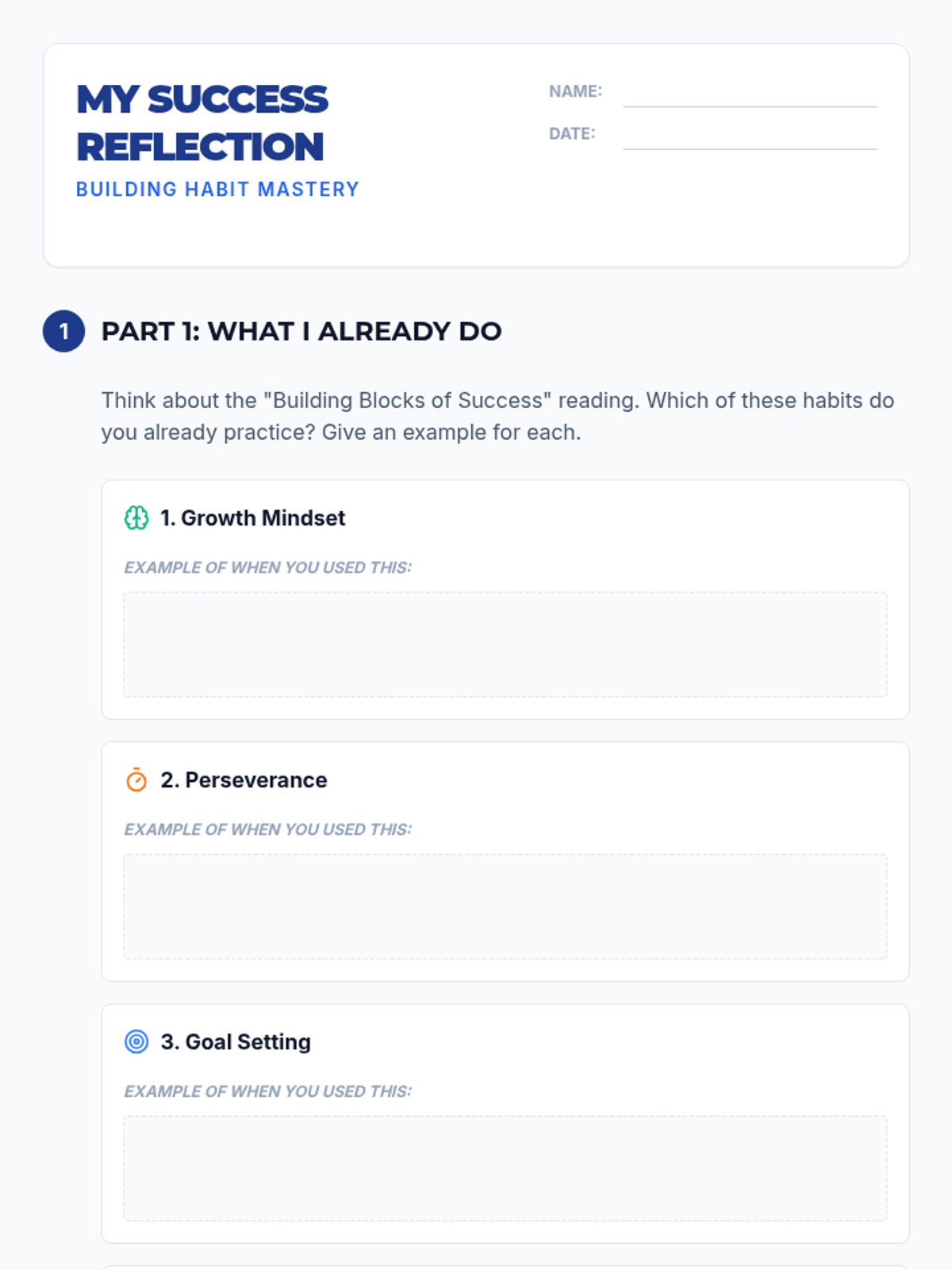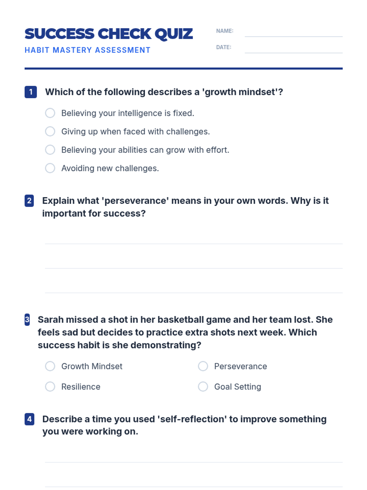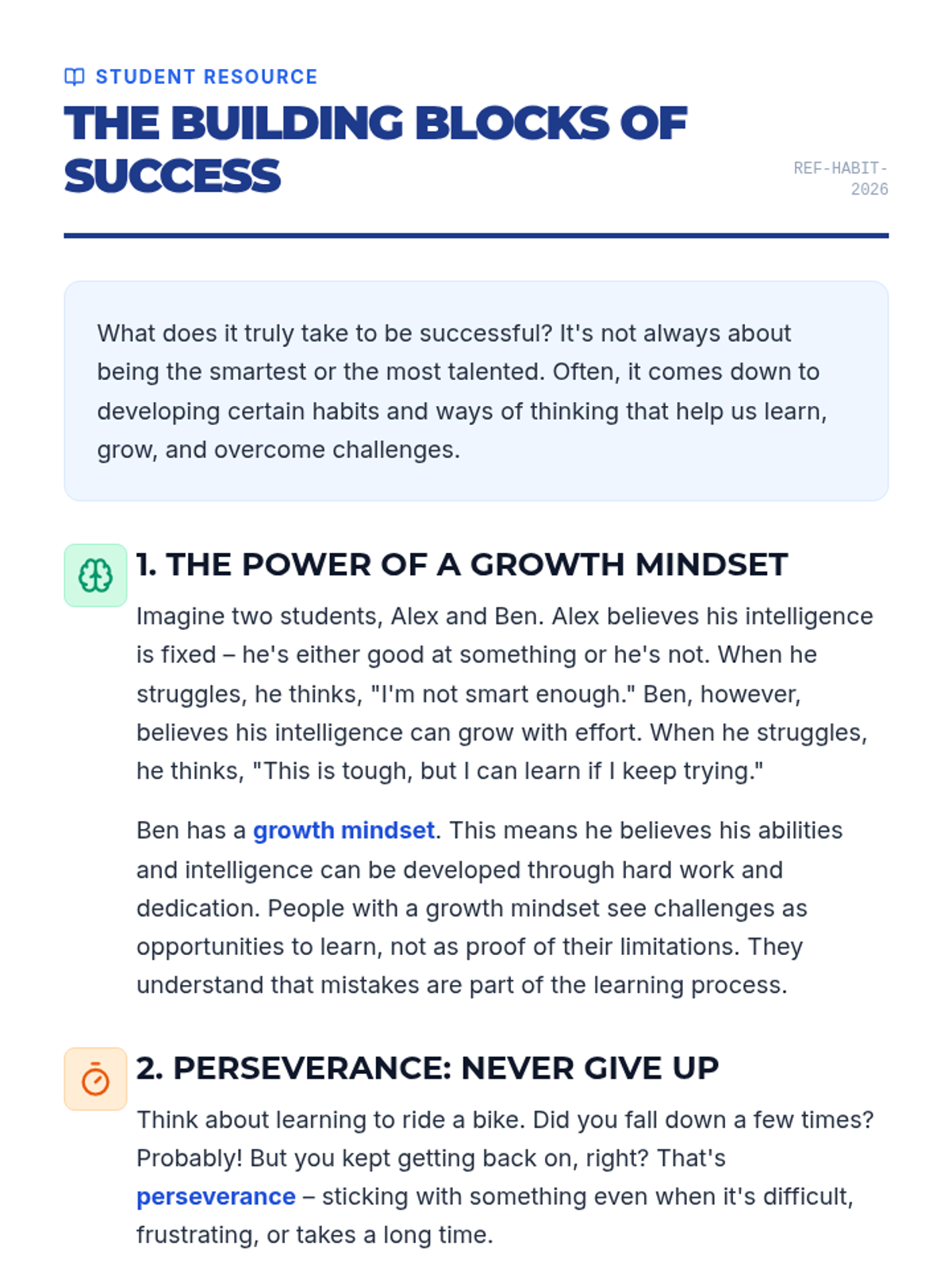 A middle school lesson exploring growth mindset, perseverance, goal setting, resilience, and self-reflection to empower students with actionable success strategies.