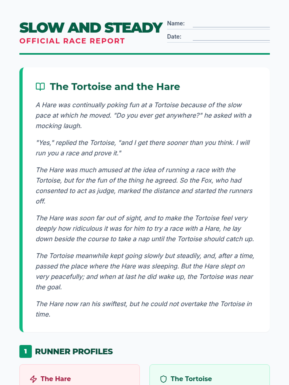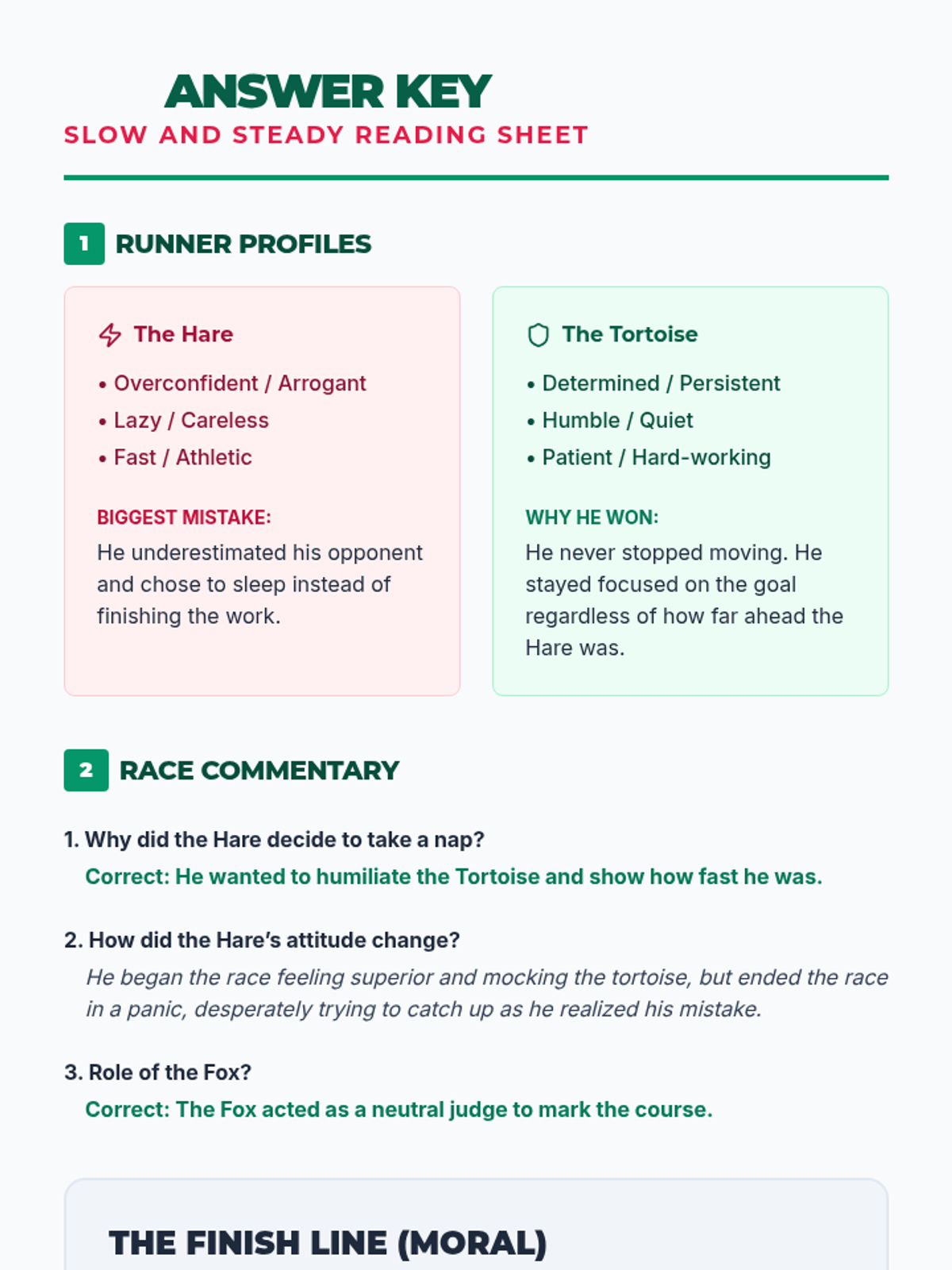 A lesson focused on analyzing the classic fable 'The Tortoise and the Hare', with a specific emphasis on character traits, motivations, and the central moral.