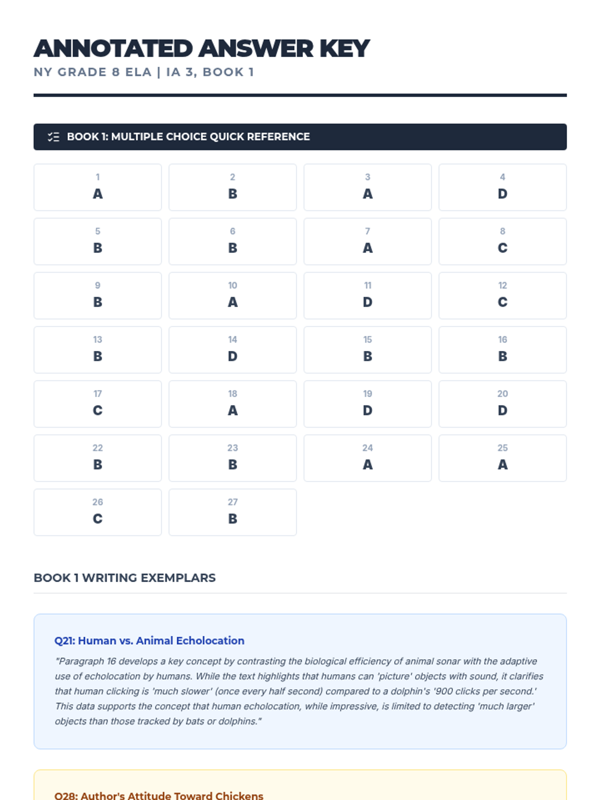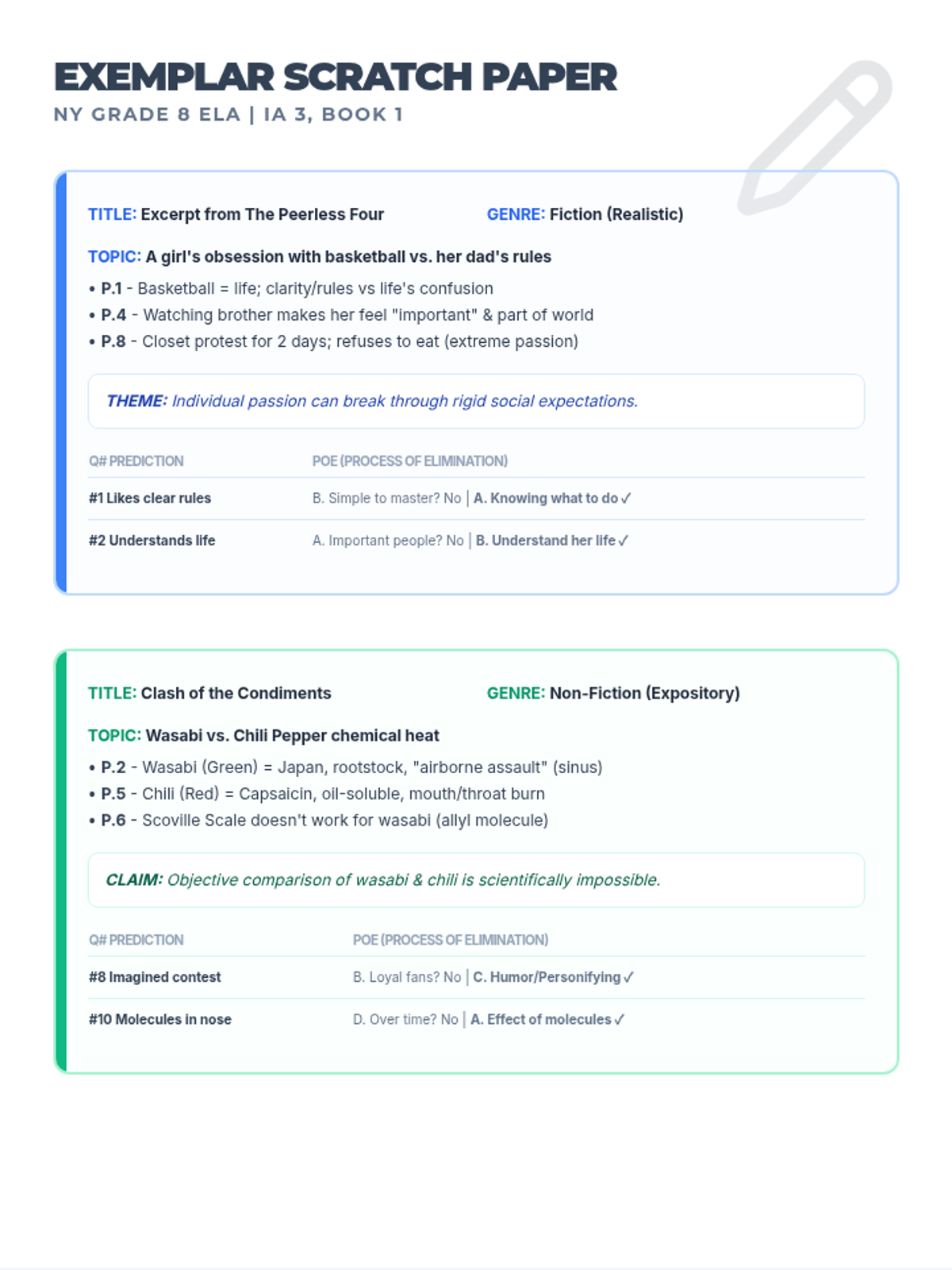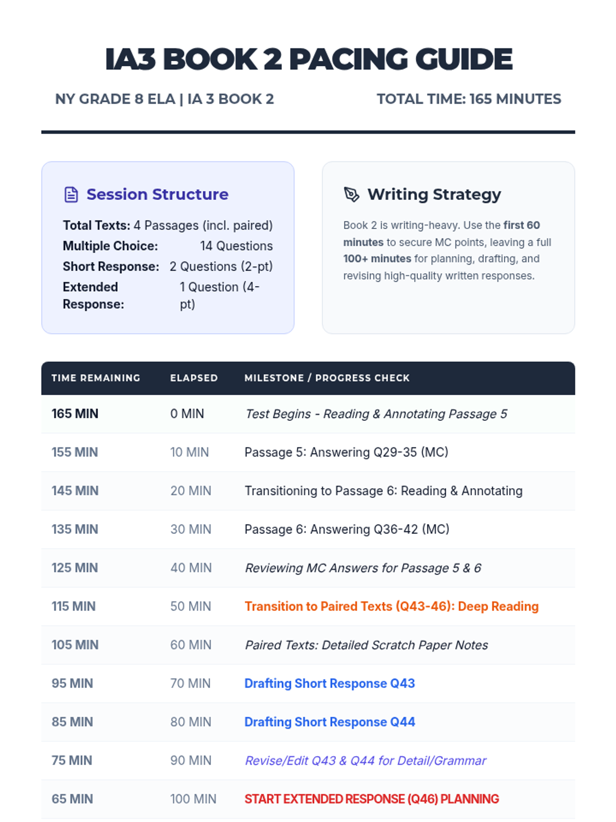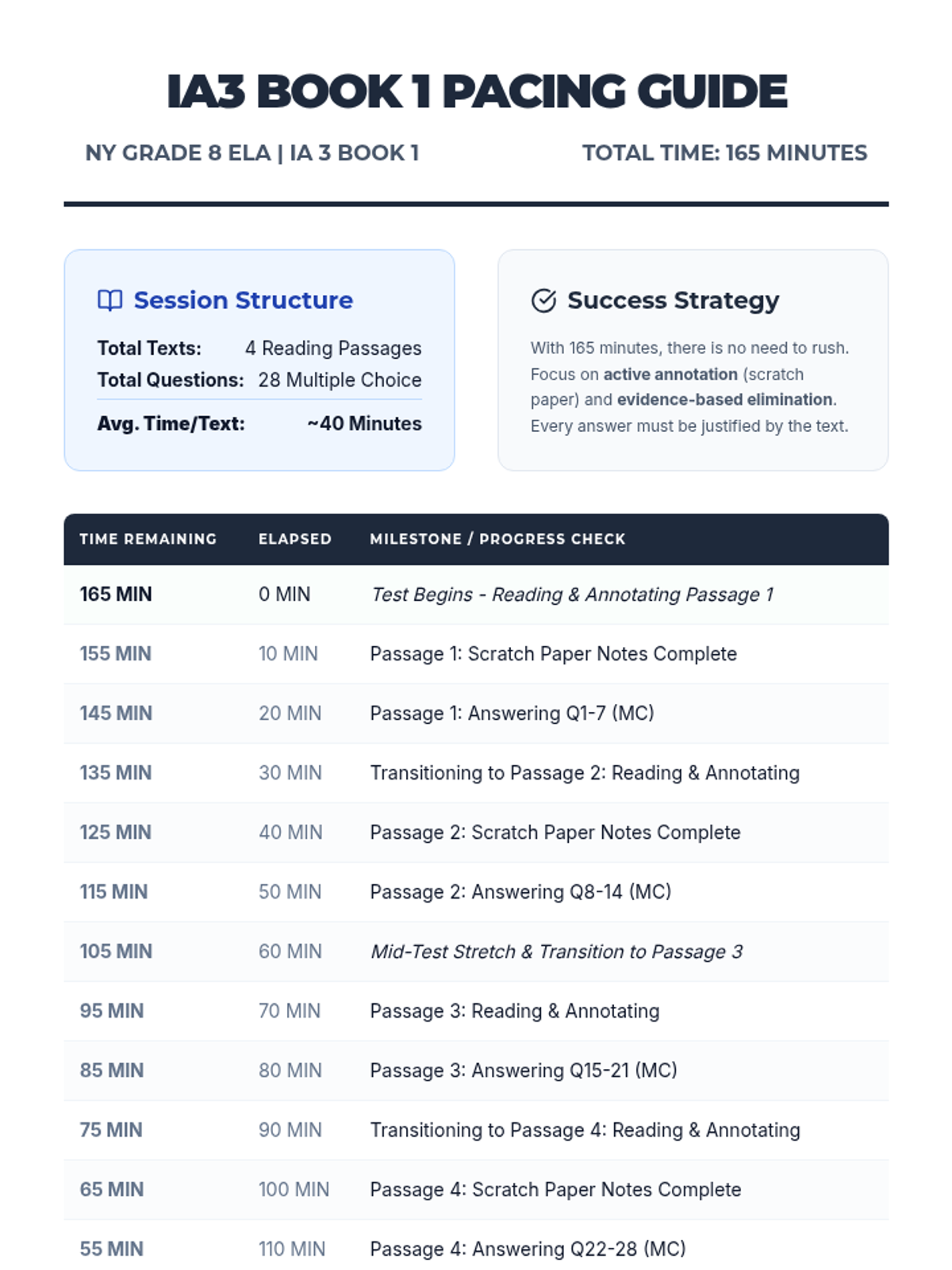A comprehensive set of preparation and review materials for the ELA Grade 8 Interim Assessment 3, featuring time-stamped pacing guides, scratch paper exemplars for textual analysis, and a fully annotated answer key.