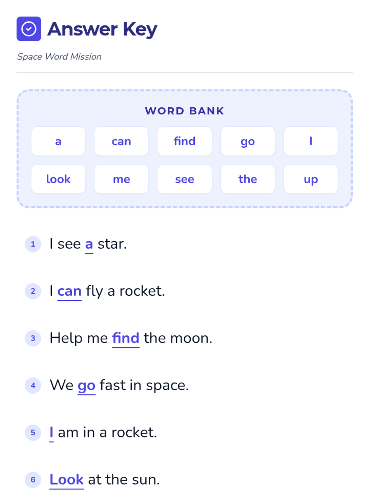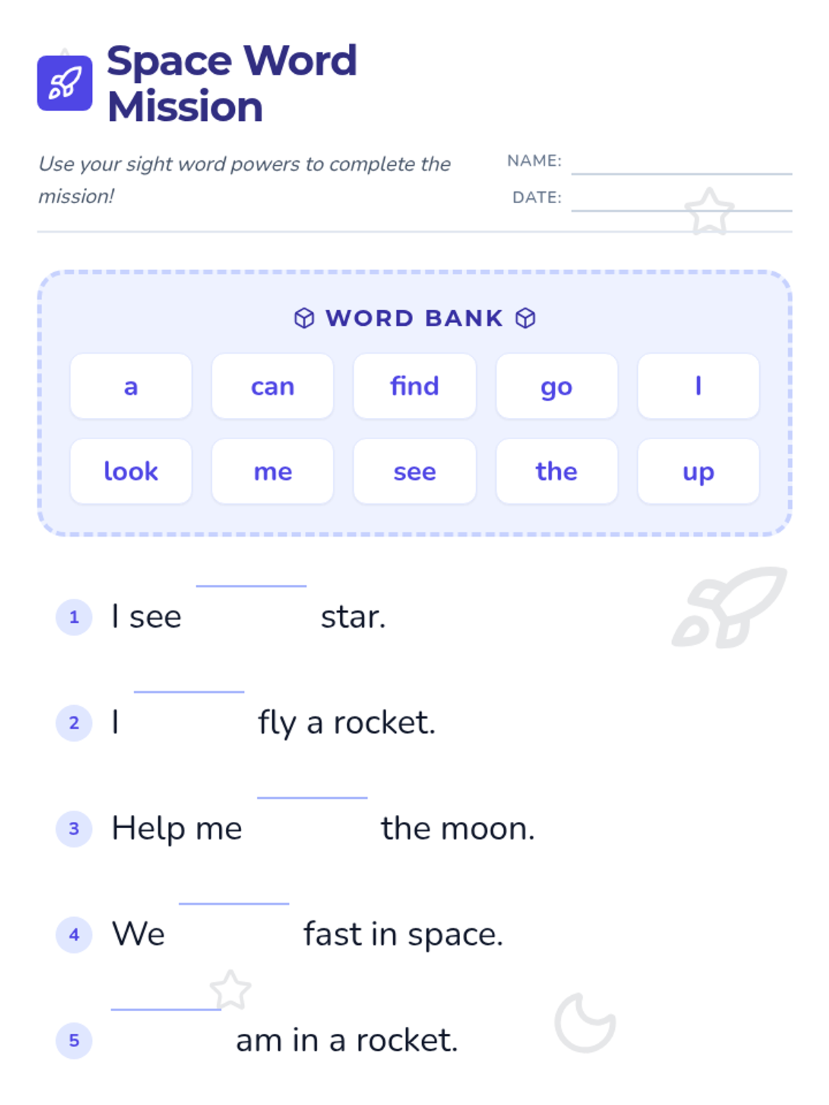 A lesson focused on practicing pre-primer sight words through the engaging theme of outer space exploration. Students use a word bank to complete simple sentences about planets, stars, and rockets.