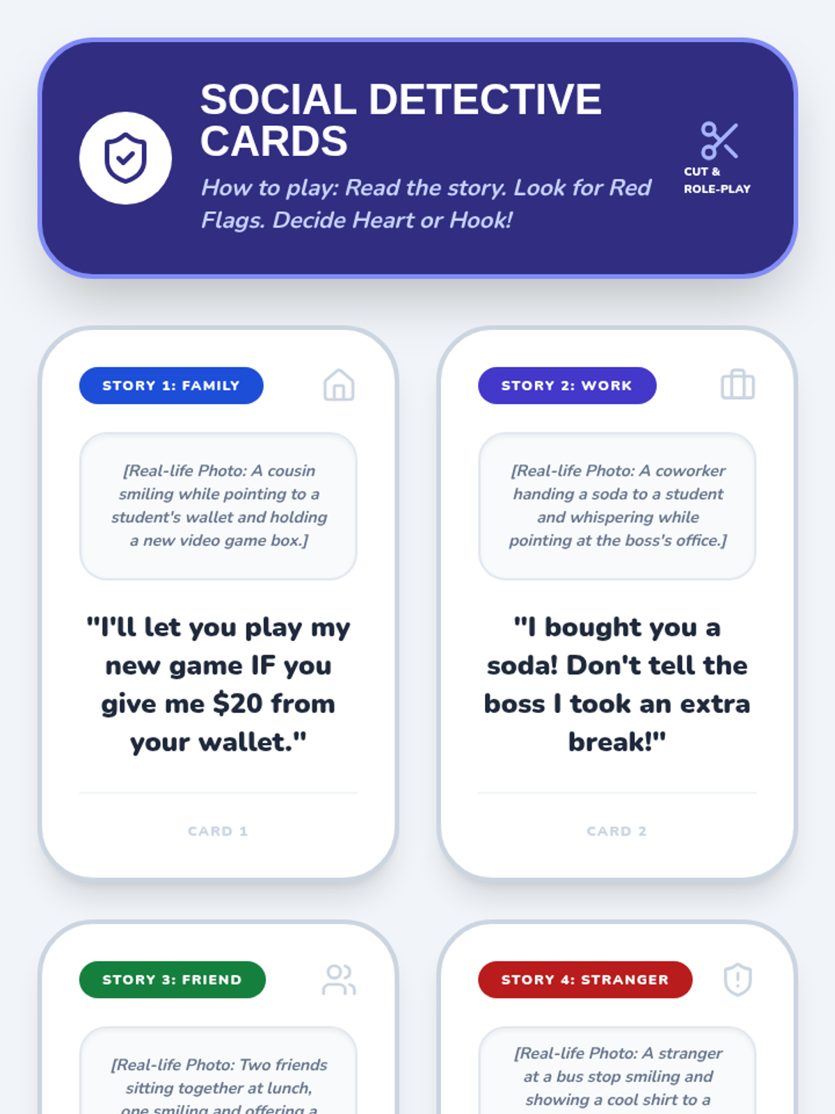 A comprehensive lesson on identity theft designed for high school special education students, focusing on recognizing red flags and protecting personal information through practical scenarios and visual aids.