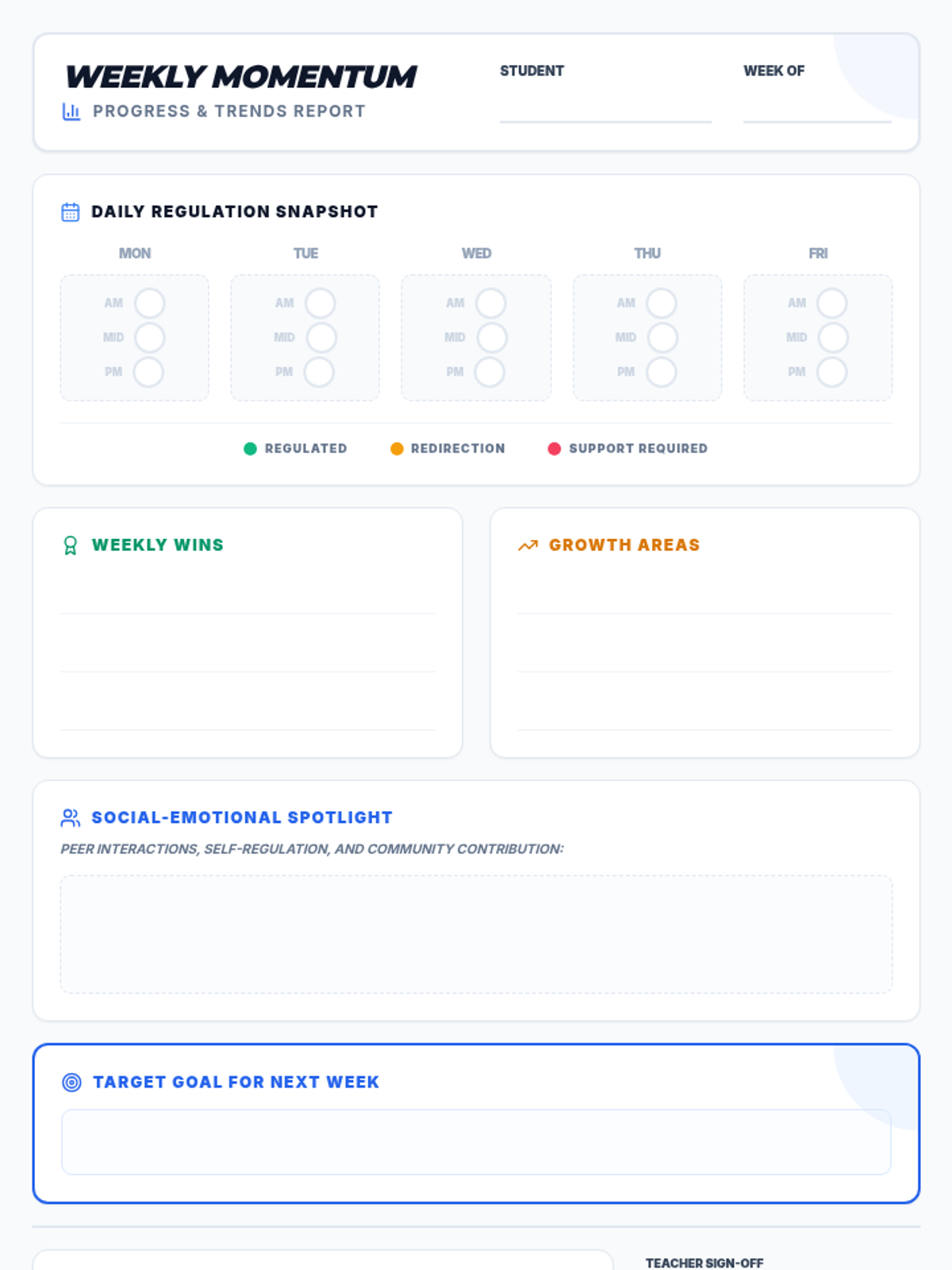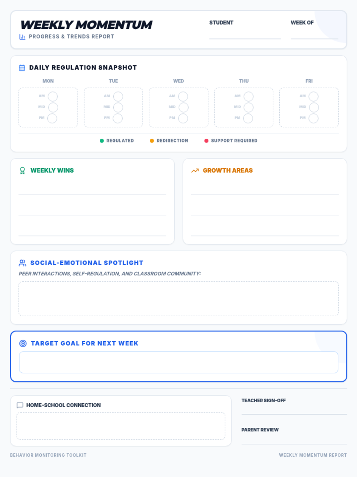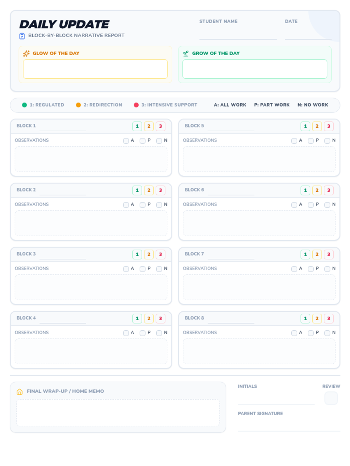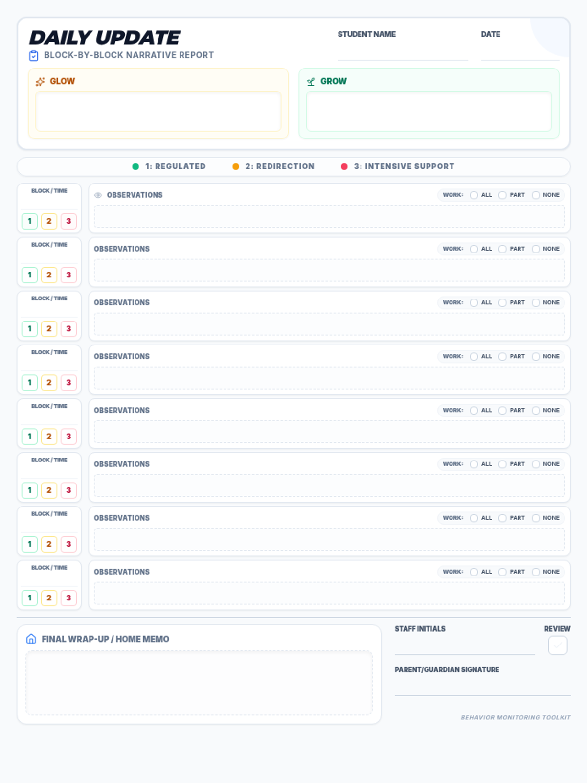 A comprehensive system for tracking student behavior and progress throughout the day, featuring a block-by-block narrative tracker and a guide for effective parent communication.