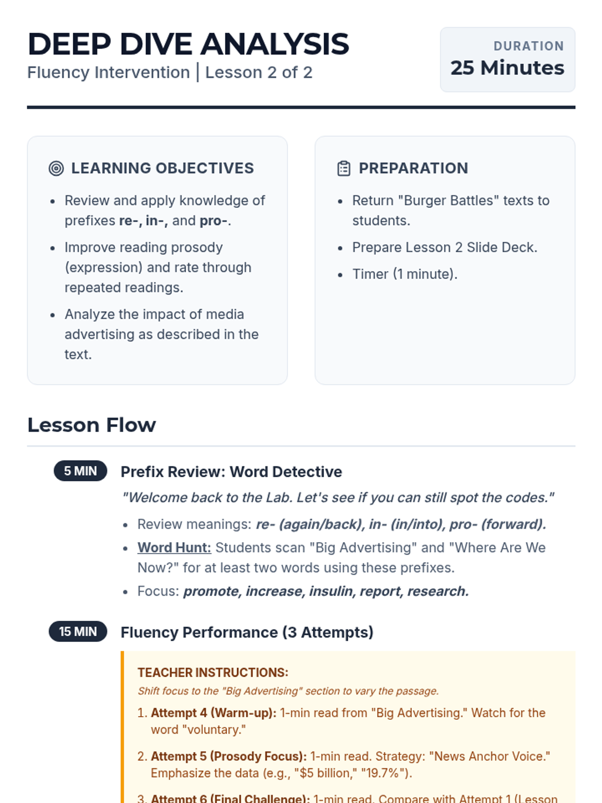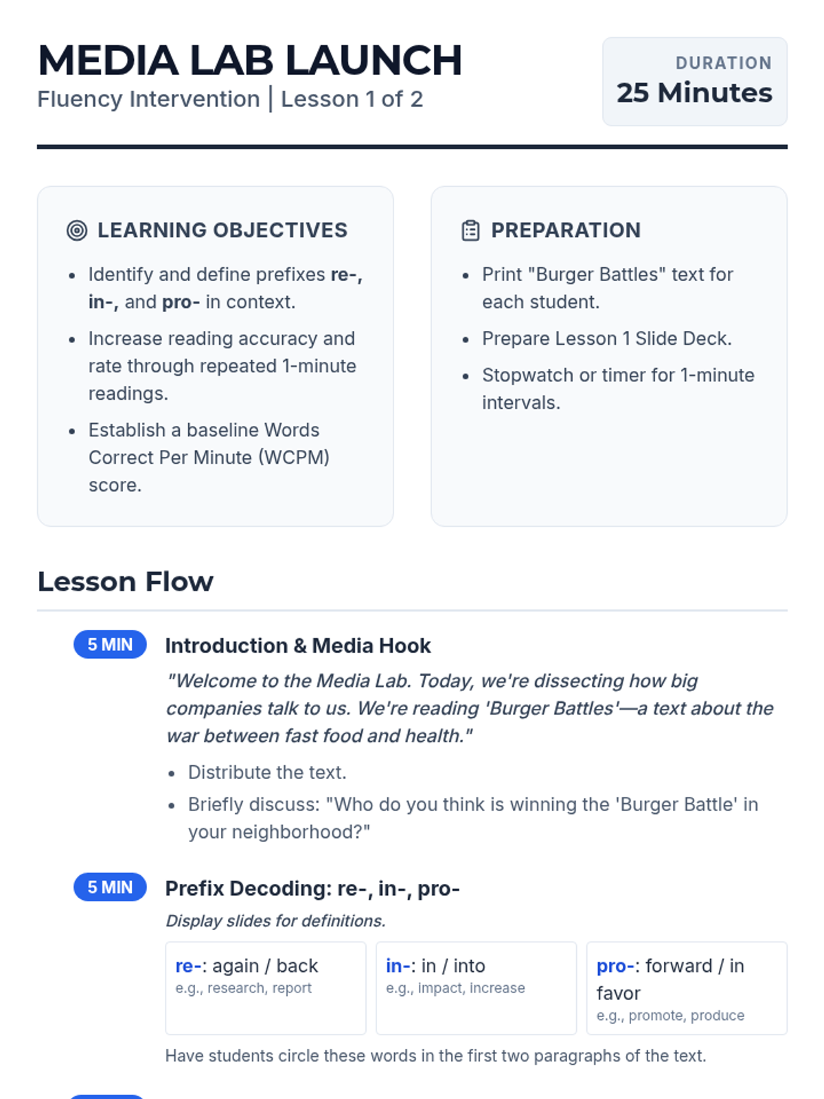 Students are introduced to the 'Burger Battles' text and the prefixes re-, in-, and pro-. They will conduct their first three one-minute fluency readings to establish a baseline and practice accuracy.