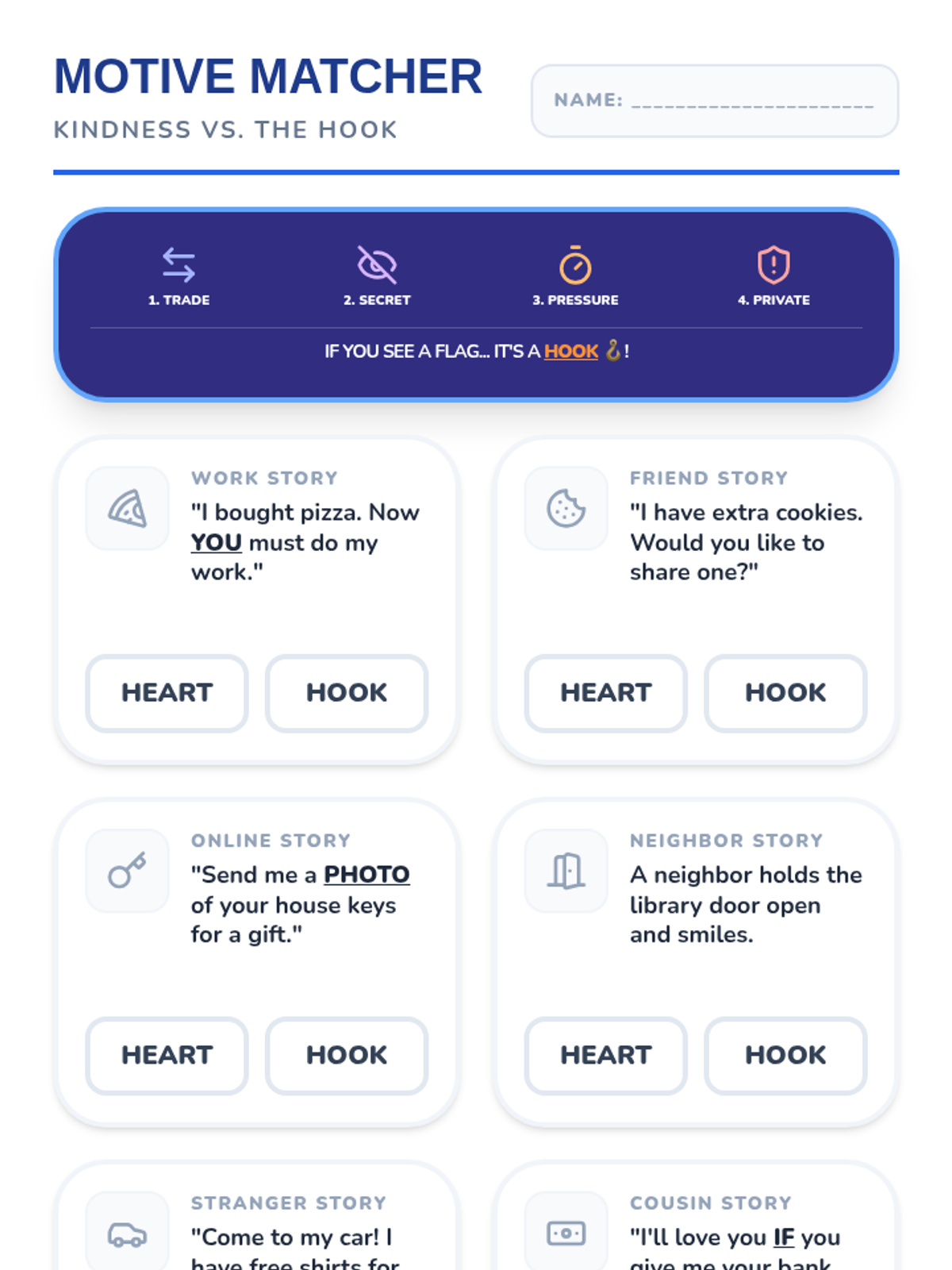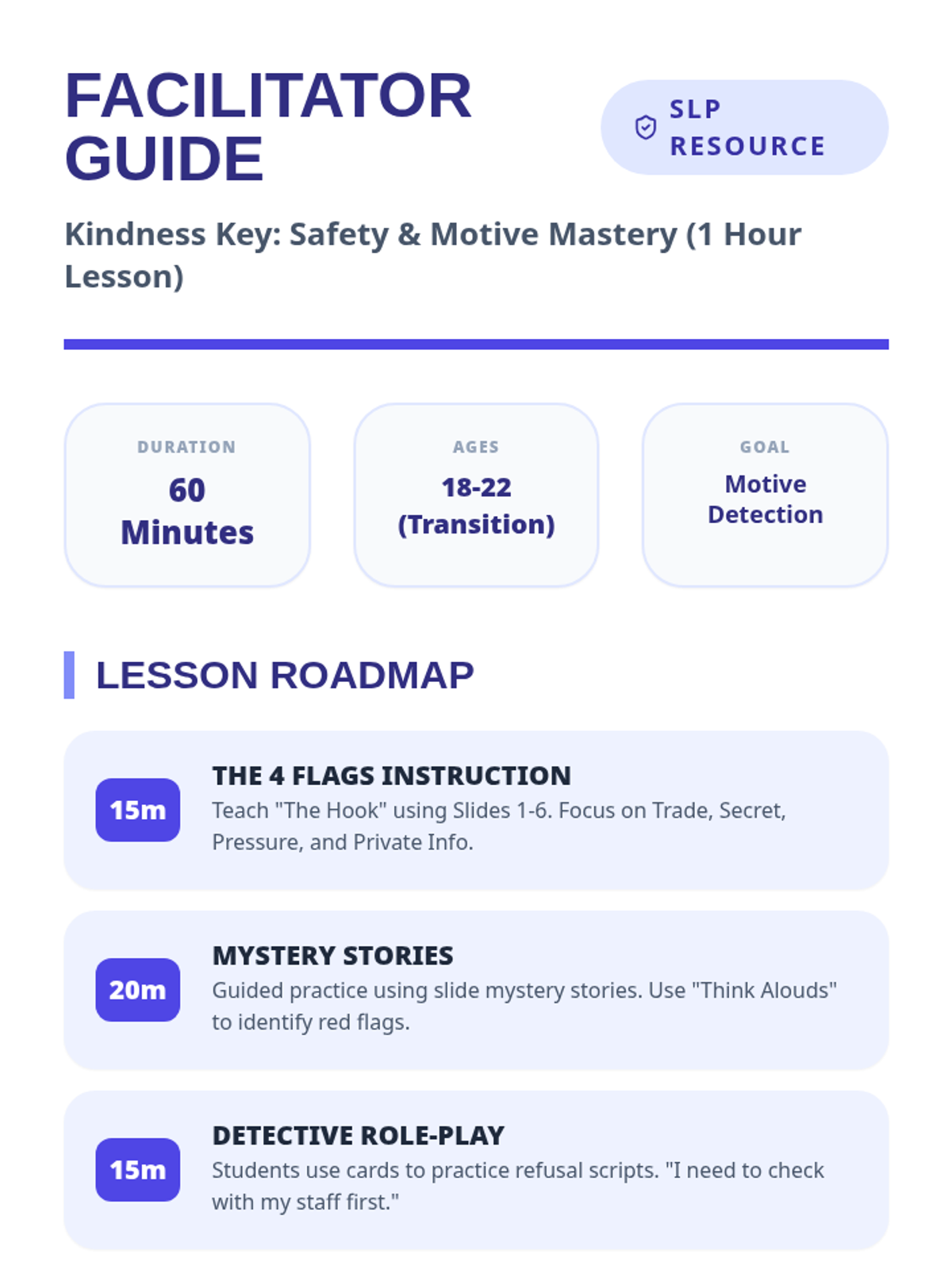 An hour-long lesson designed for young adults (18-22) with intellectual disabilities, autism, and Down Syndrome. This lesson focuses on distinguishing between genuine kindness and manipulative behavior to improve social safety and boundary-setting.