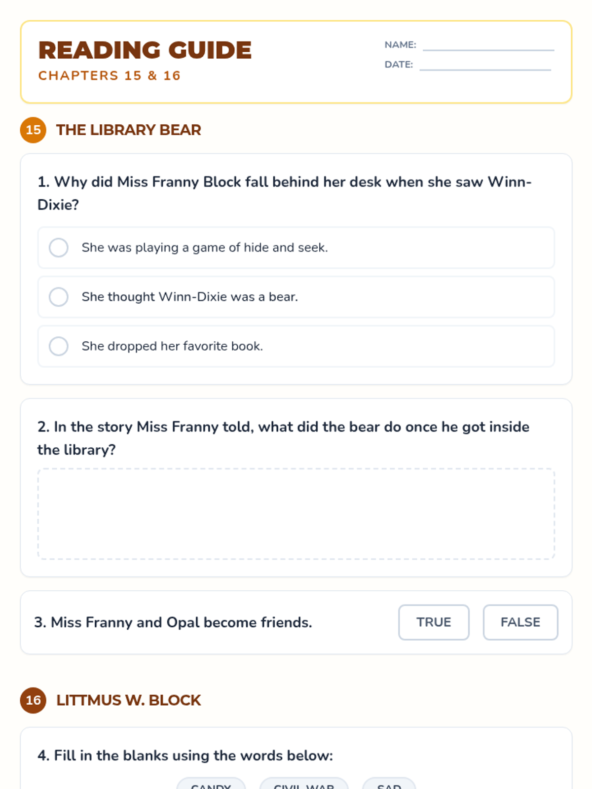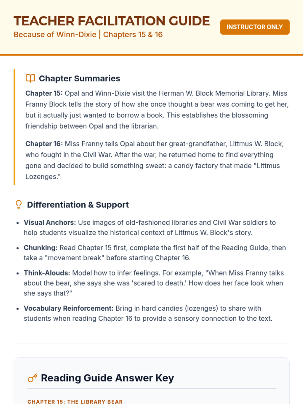 A reading and analysis lesson for Chapters 15 and 16 of 'Because of Winn-Dixie', focusing on character history and the power of storytelling. Designed for high school students reading at a middle-grade level.